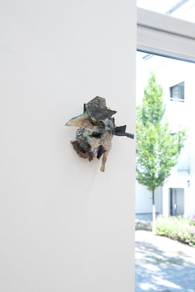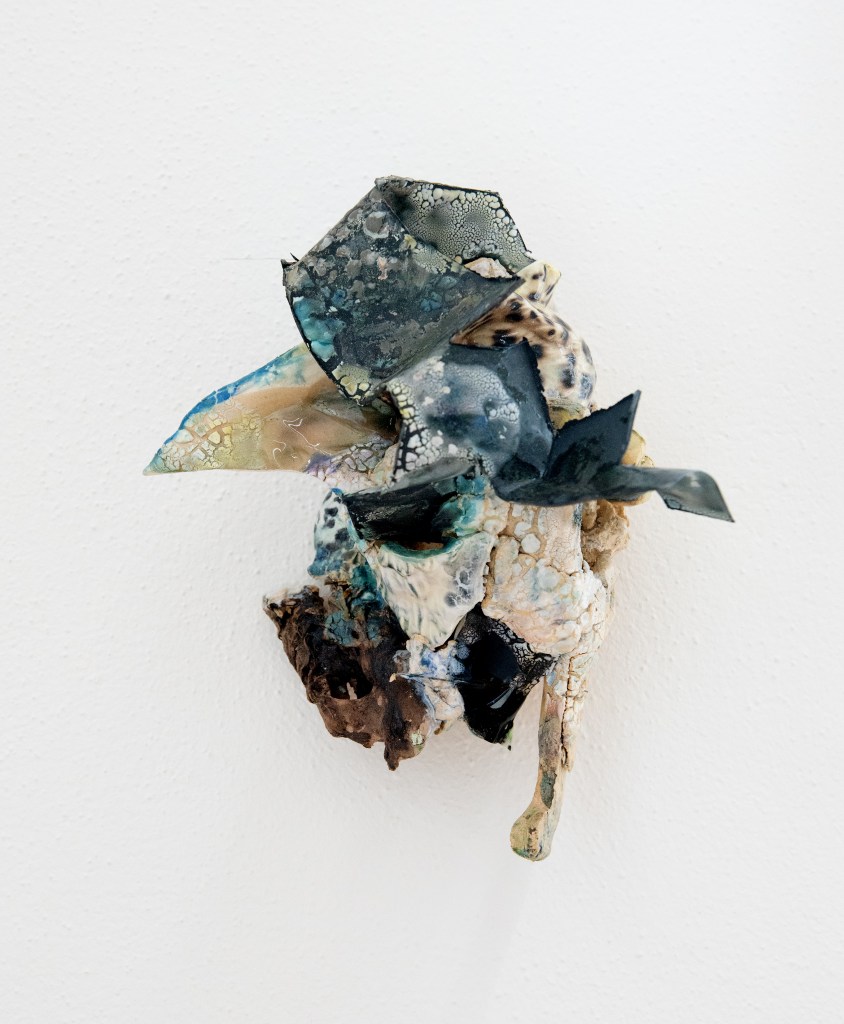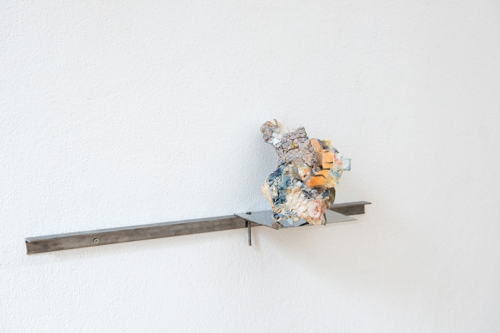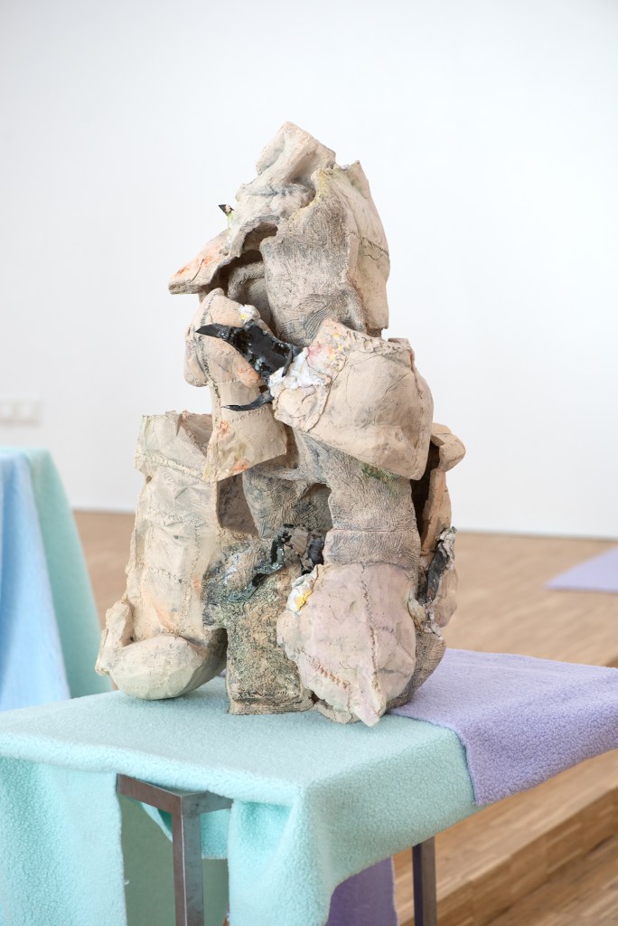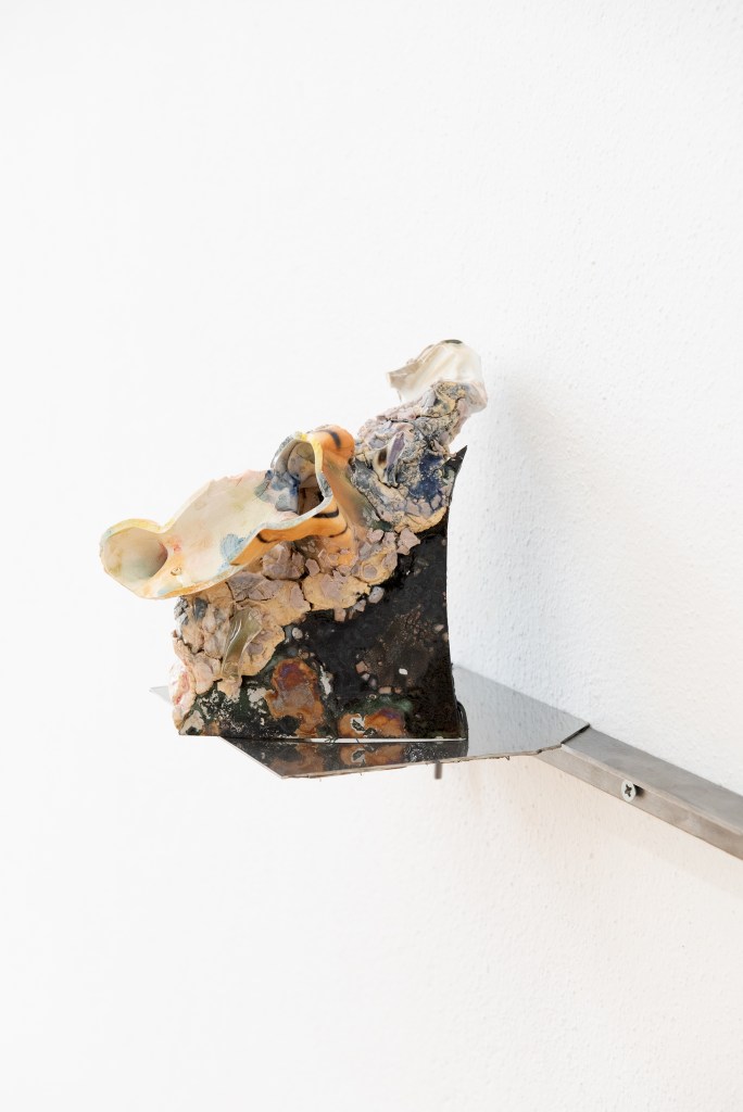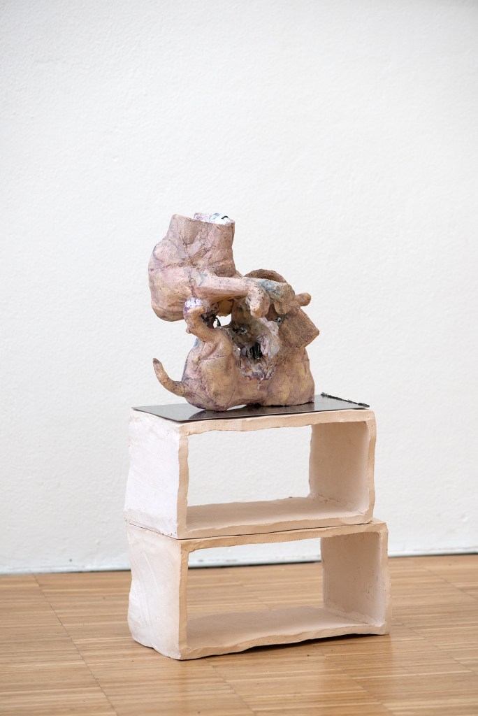 gouache paint, acrylic resin, biro, pencil, gesso and ink on wood. 31 x 24 x 5 cm; Julia Klemm, A chimera is not a pet 2, 2025, steel, glaze, ceramic, pigment, 44 x 38 x 74 cm, )