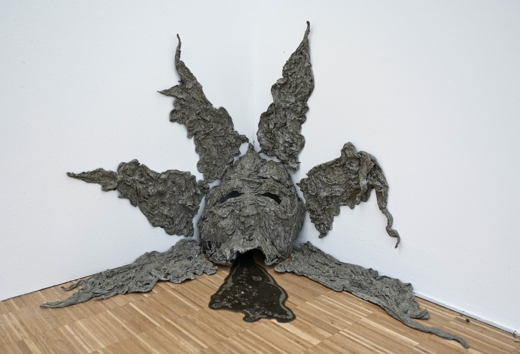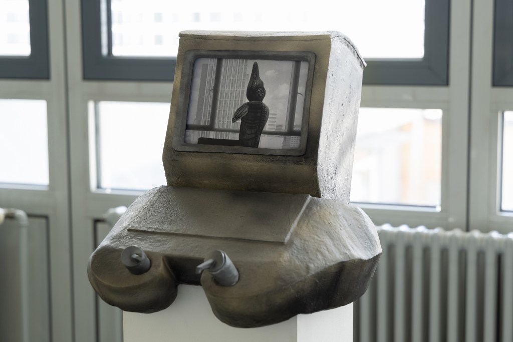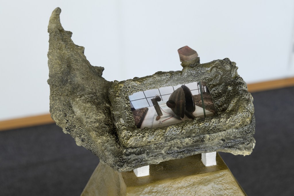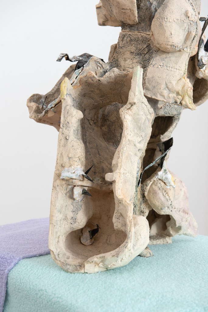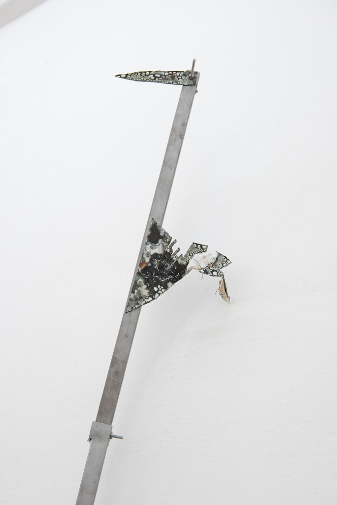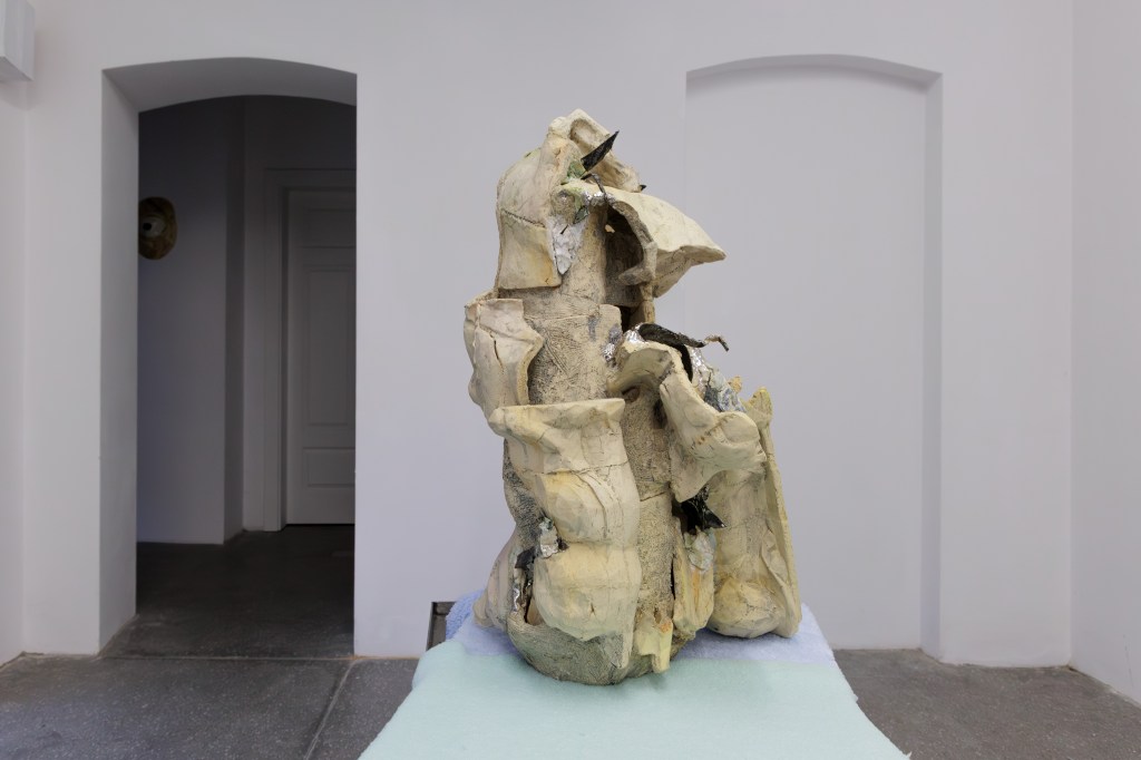 gouache paint, acrylic resin, biro, pencil, gesso and ink on wood. 31 x 24 x 5 cm; Julia Klemm, A chimera is not a pet 2, 2025, steel, glaze, ceramic, pigment, 44 x 38 x 74 cm, )