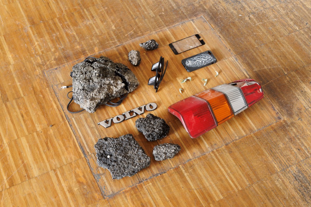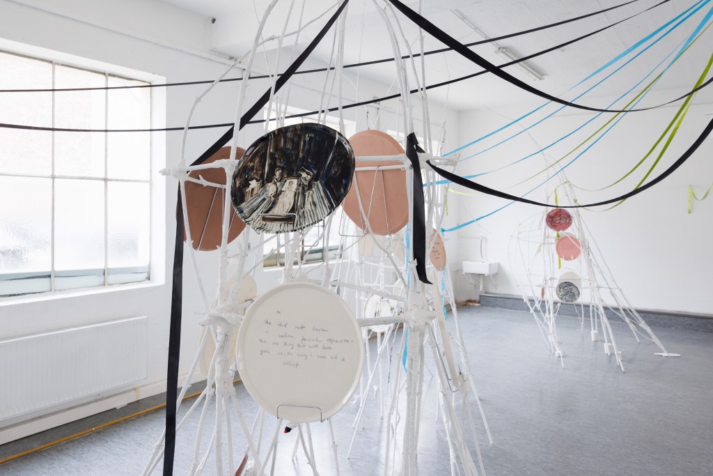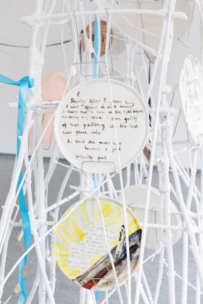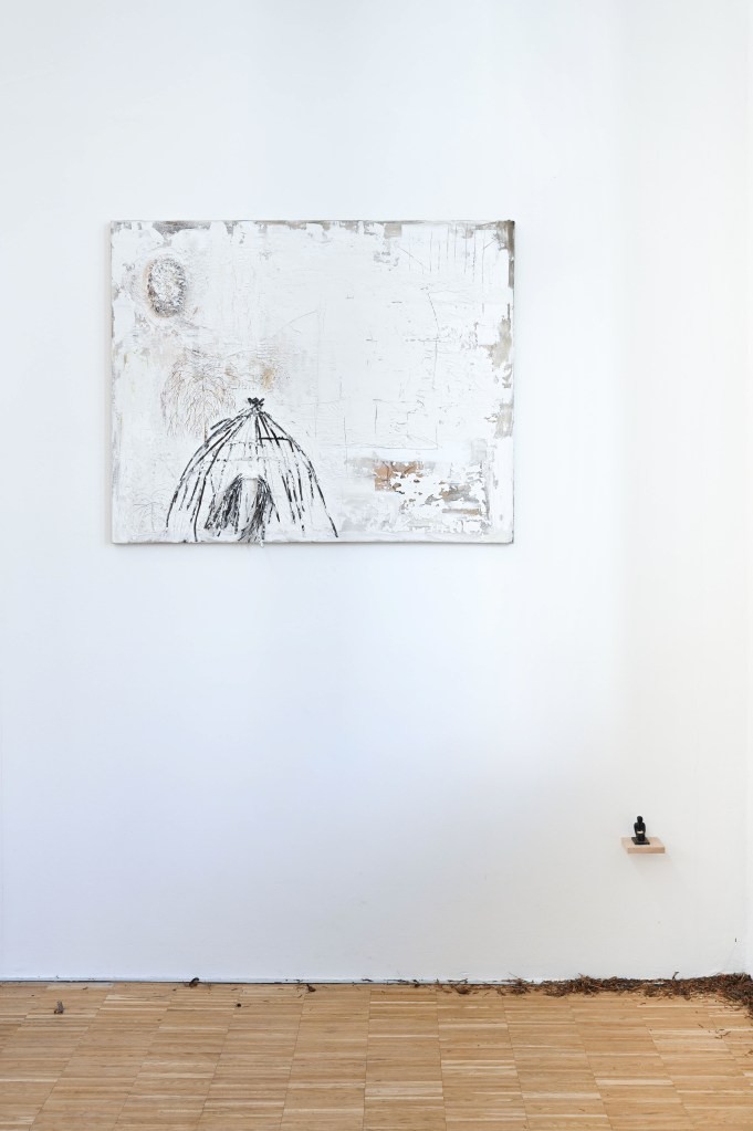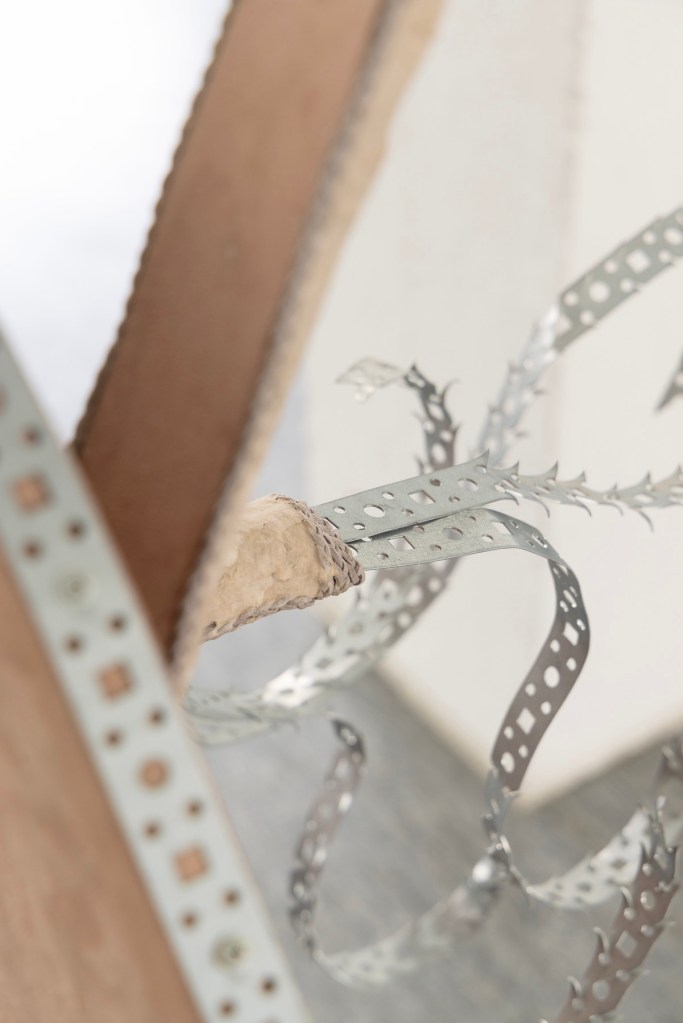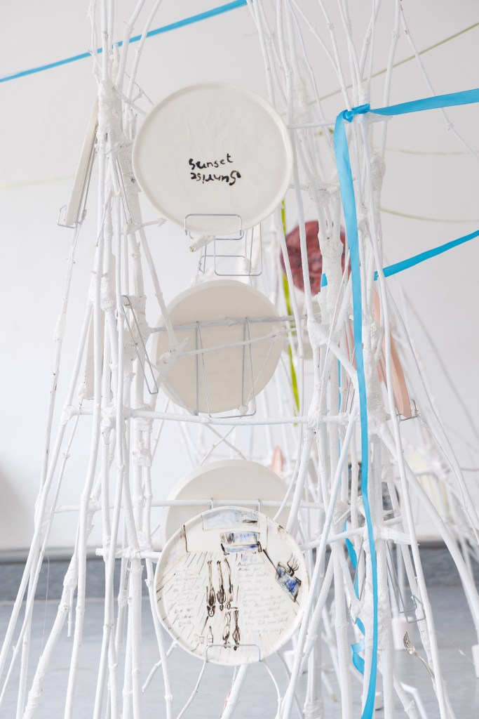 gouache paint, acrylic resin, biro, pencil, gesso and ink on wood. 31 x 24 x 5 cm; Julia Klemm, A chimera is not a pet 2, 2025, steel, glaze, ceramic, pigment, 44 x 38 x 74 cm, )