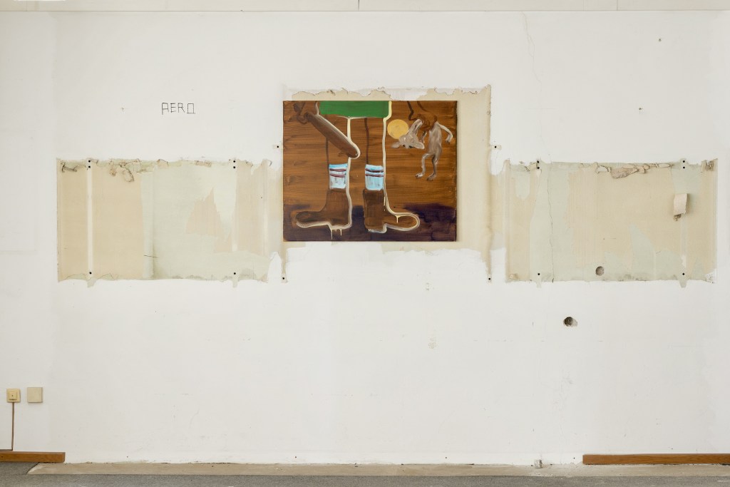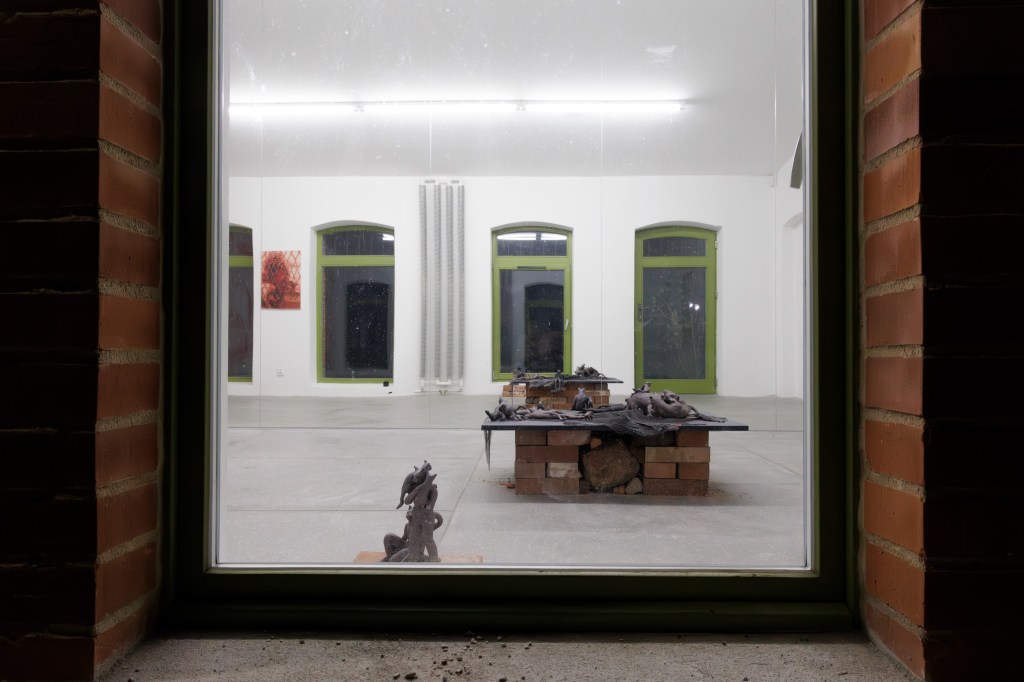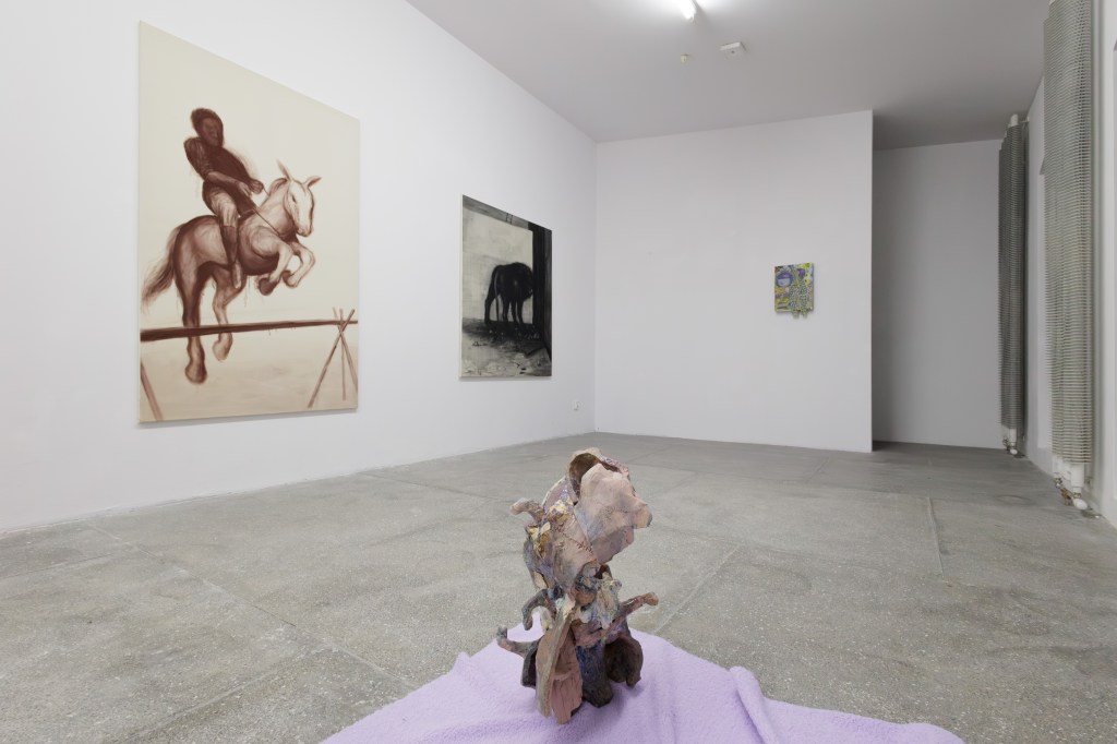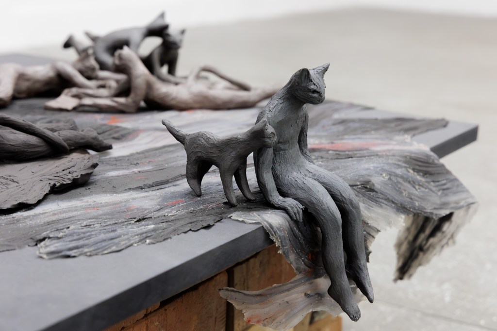 There are animals we see and animals we do not. The animals we do see, we organise and use, tame and breed. We control them as meticulously as Eadweard Muybridge did, when he set up multiple cameras to capture the image of the horse in motion or a lion in a cage, the starting point of Jakob Gilg’s paintings. We assign animals different roles: you there, you look soft and cuddly, you will be a pet. And you, you over there, so powerful and strong, you we will make into a symbol. Kitsch ceramic cats and scaled-down digital scans of lion monuments tumble, shatter and recombine in Julia Klemm’s work.