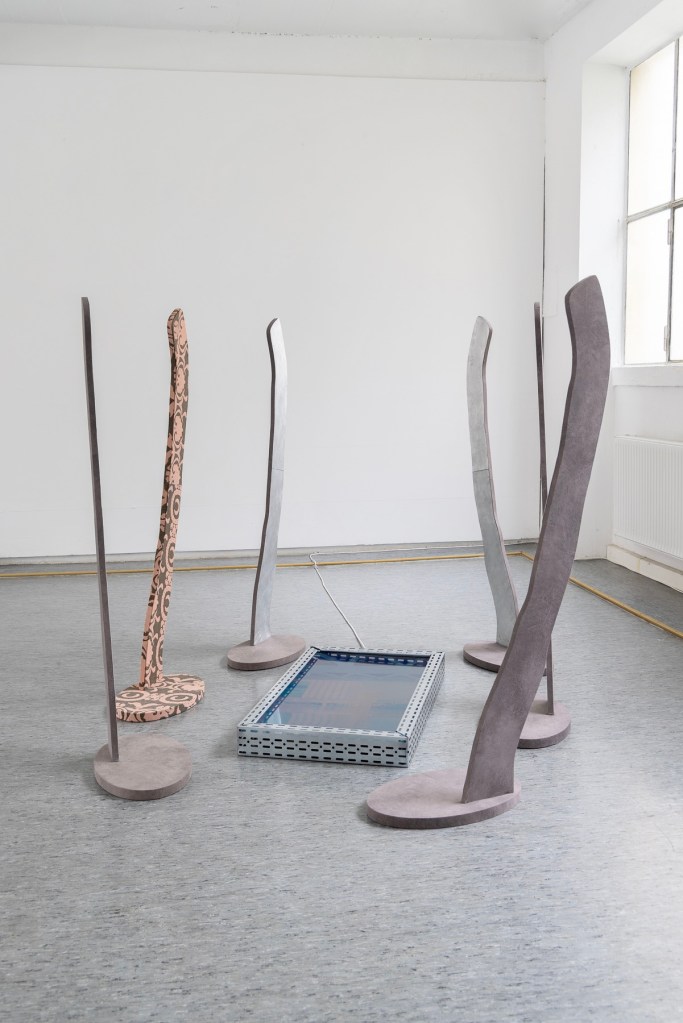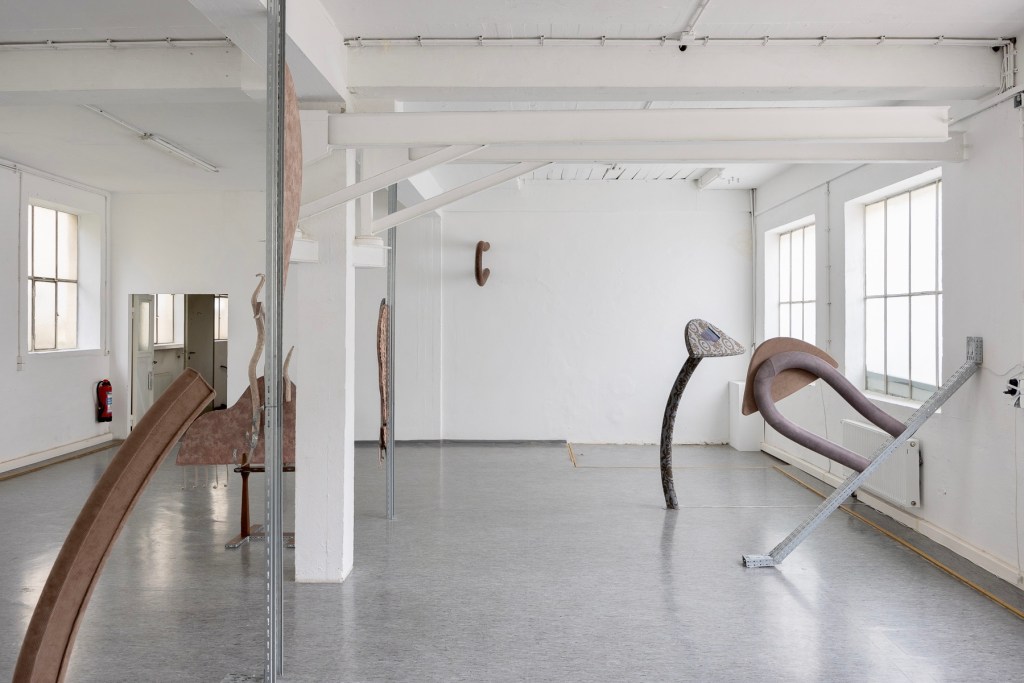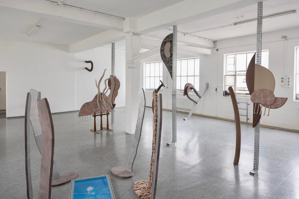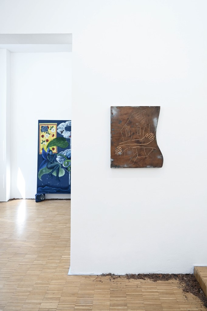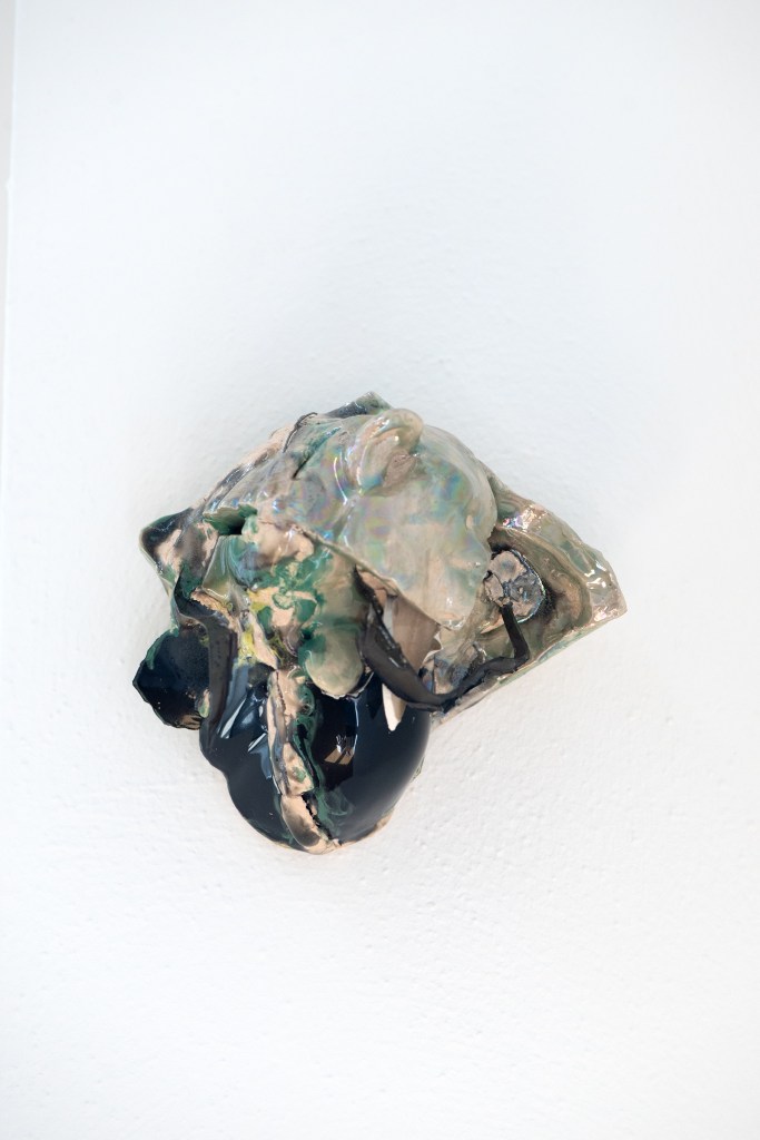 gouache paint, acrylic resin, biro, pencil, gesso and ink on wood. 31 x 24 x 5 cm; Julia Klemm, A chimera is not a pet 2,2025, steel, glaze, ceramic, pigment, 44 x 38 x 74 cm,; Julia Klemm, A chimera is not a pet 3 , 2025, steel, glaze, ceramic, pigment, 46 x 34 x 42 cm)