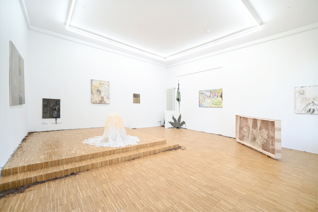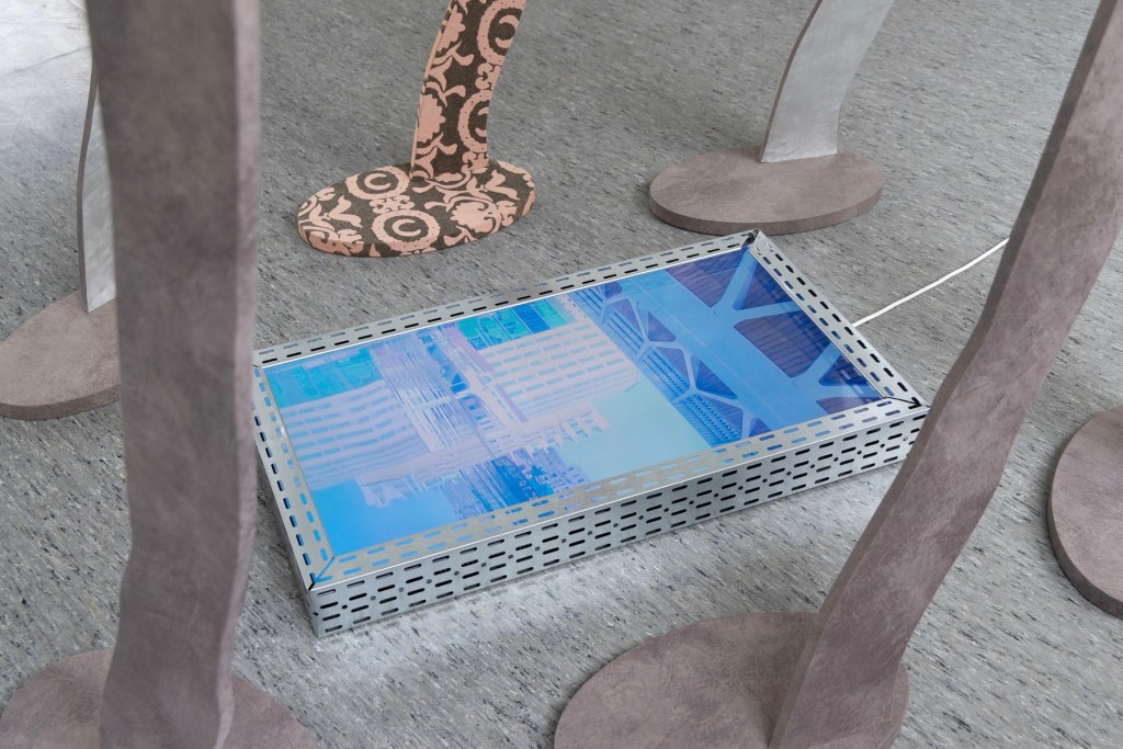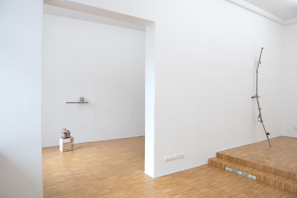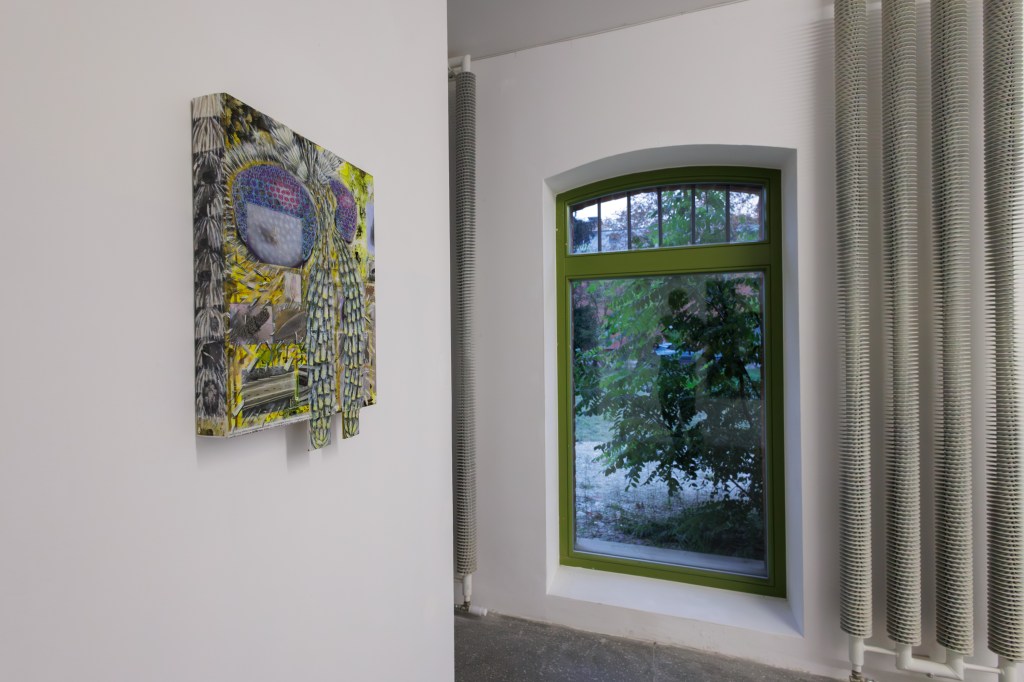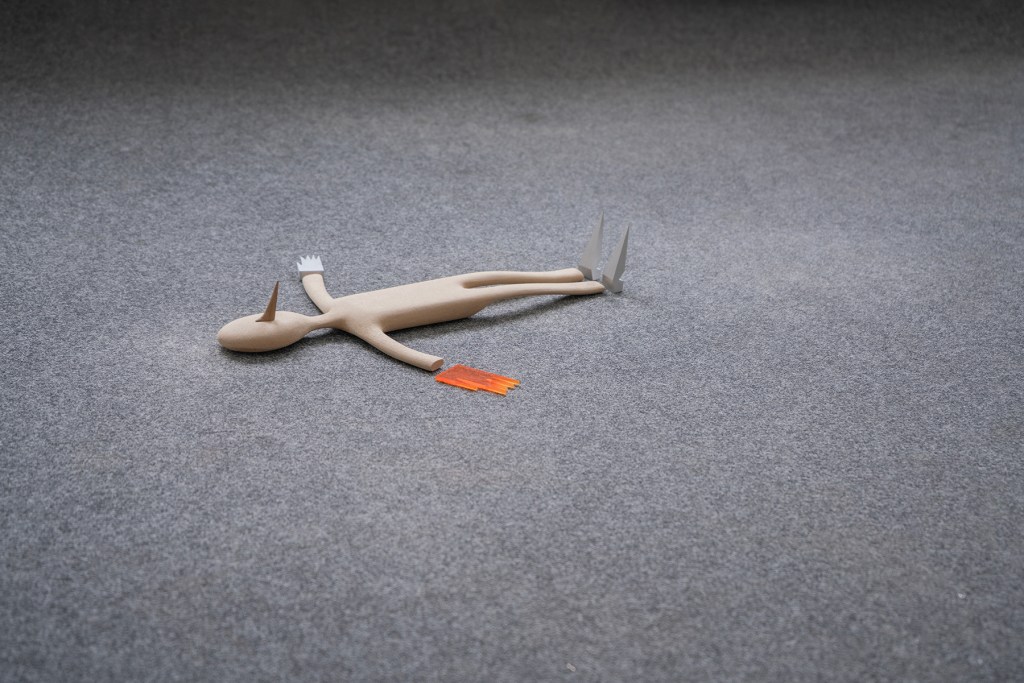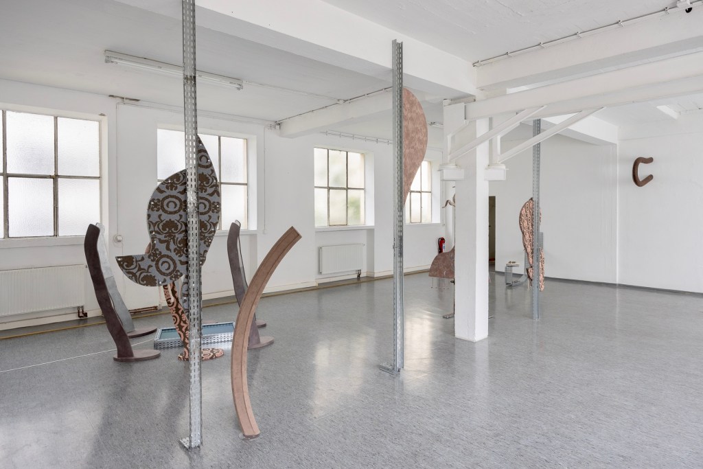 gouache paint, acrylic resin, biro, pencil, gesso and ink on wood. 31 x 24 x 5 cm; Julia Klemm, A chimera is not a pet 2,2025, steel, glaze, ceramic, pigment, 44 x 38 x 74 cm,; Julia Klemm, A chimera is not a pet 3 , 2025, steel, glaze, ceramic, pigment, 46 x 34 x 42 cm)