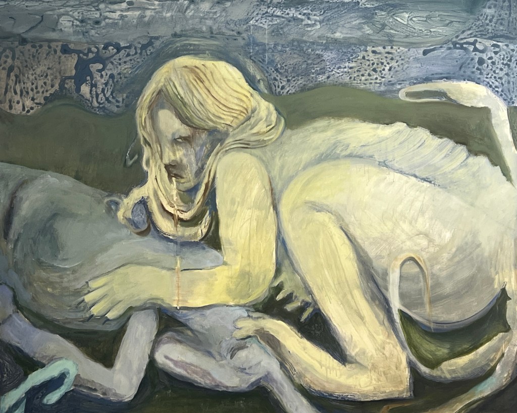 gouache paint, acrylic resin, biro, pencil, gesso and ink on wood. 31 x 24 x 5 cm, ; Julia Klemm, A chimera is not a pet 2, 2025, steel, glaze, ceramic, pigment, 44 x 38 x 74 cm,; Julia Klemm, A chimera is not a pet 3 , 2025, steel, glaze, ceramic, pigment, 46 x 34 x 42 cm)