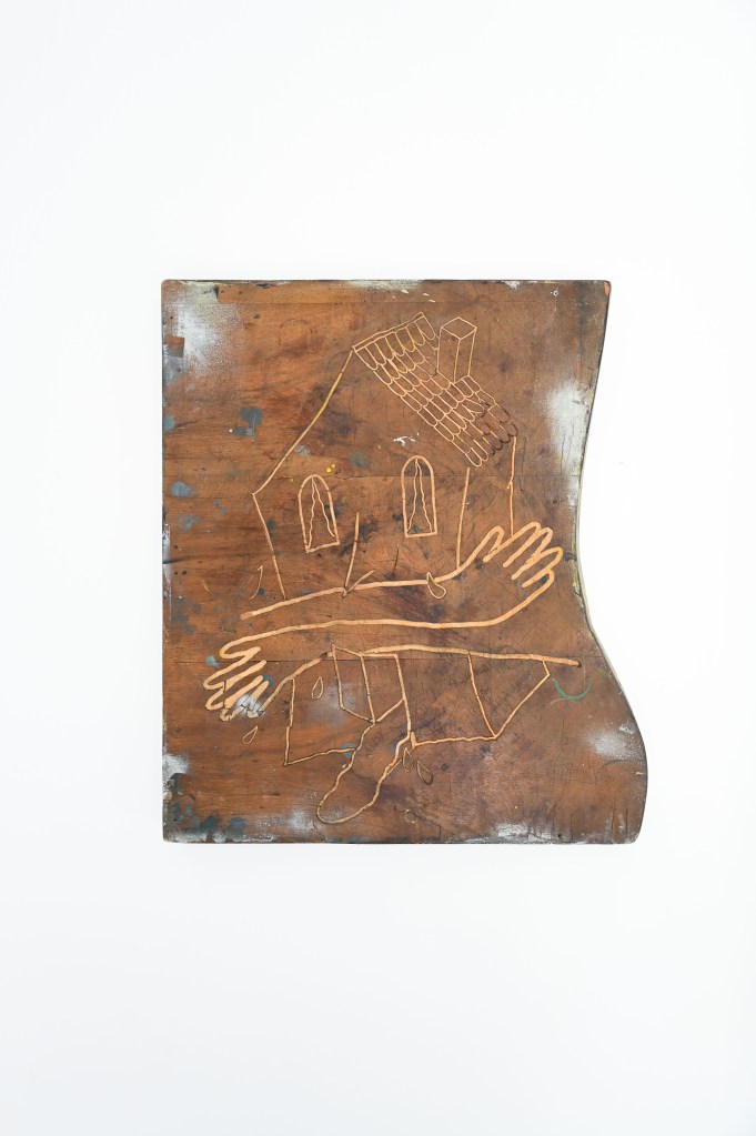 gouache paint, acrylic resin, biro, pencil, gesso and ink on wood. 31 x 24 x 5 cm,