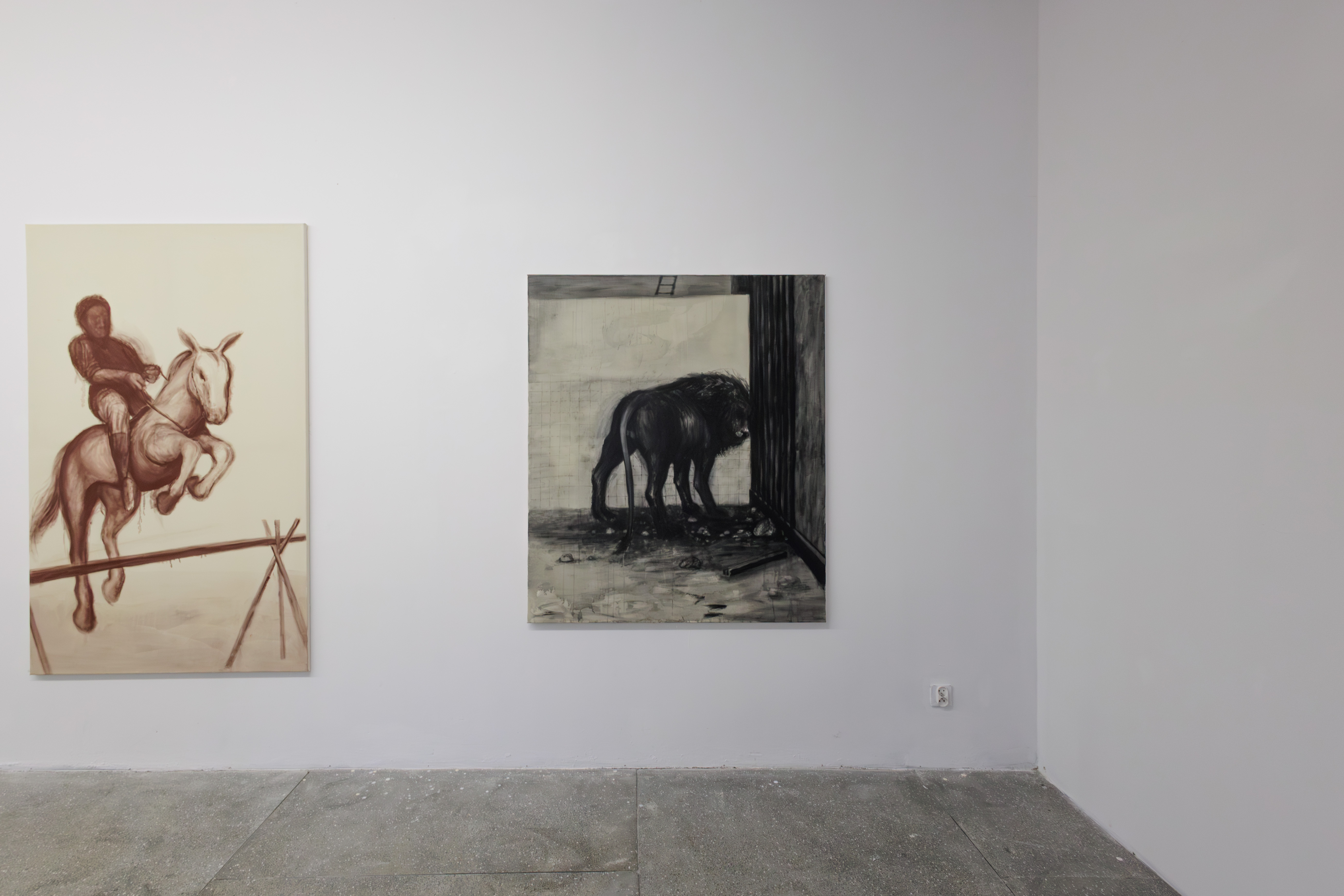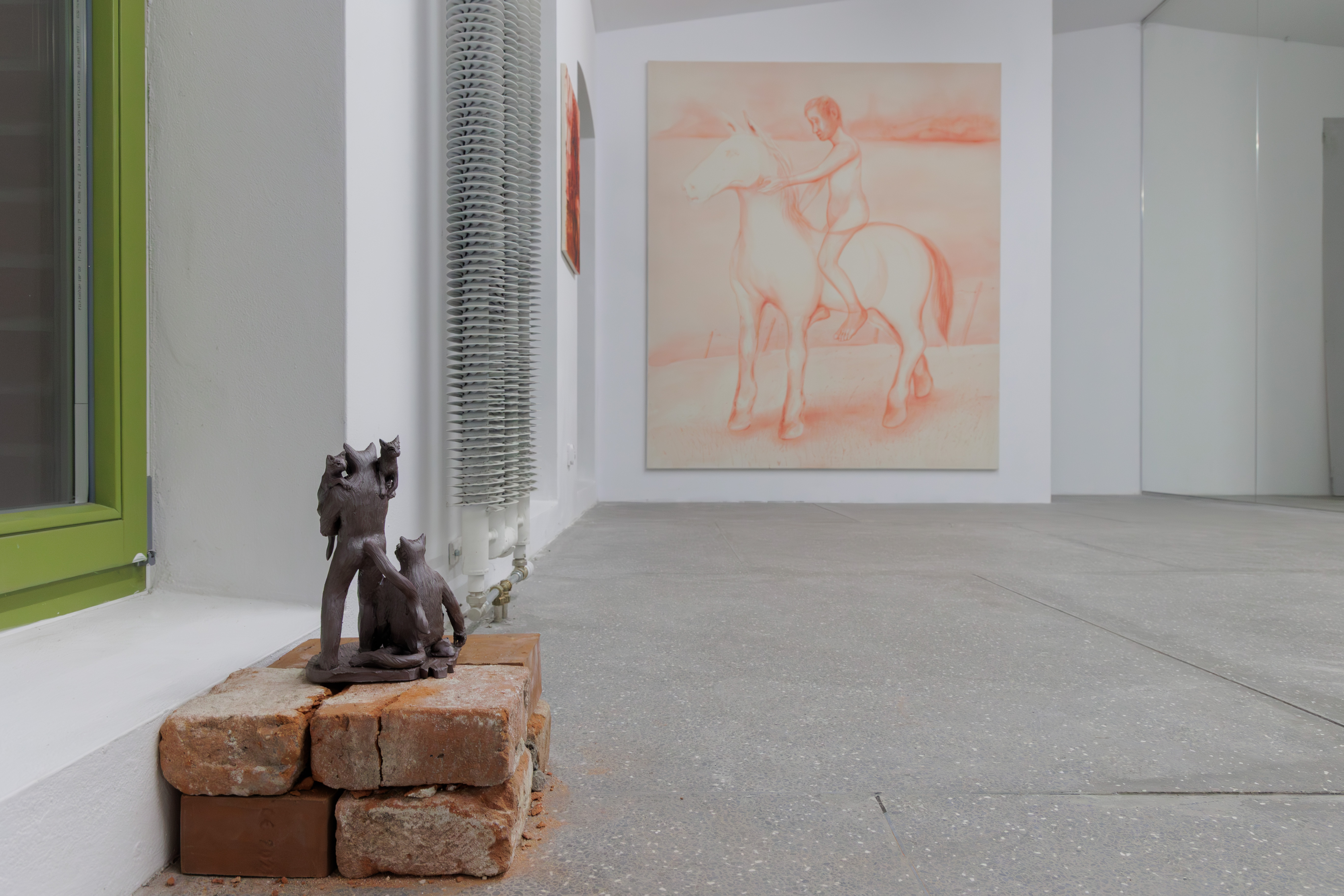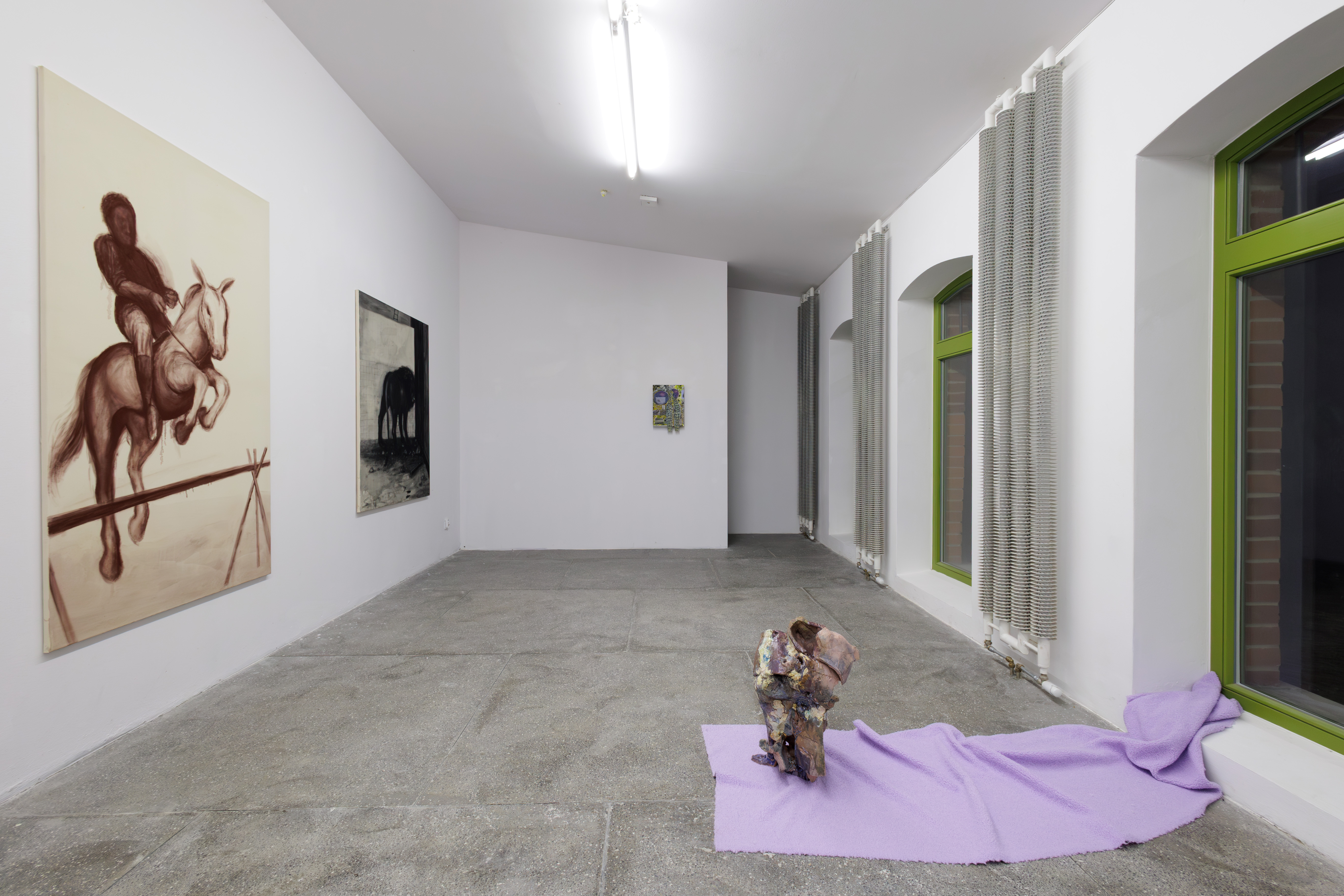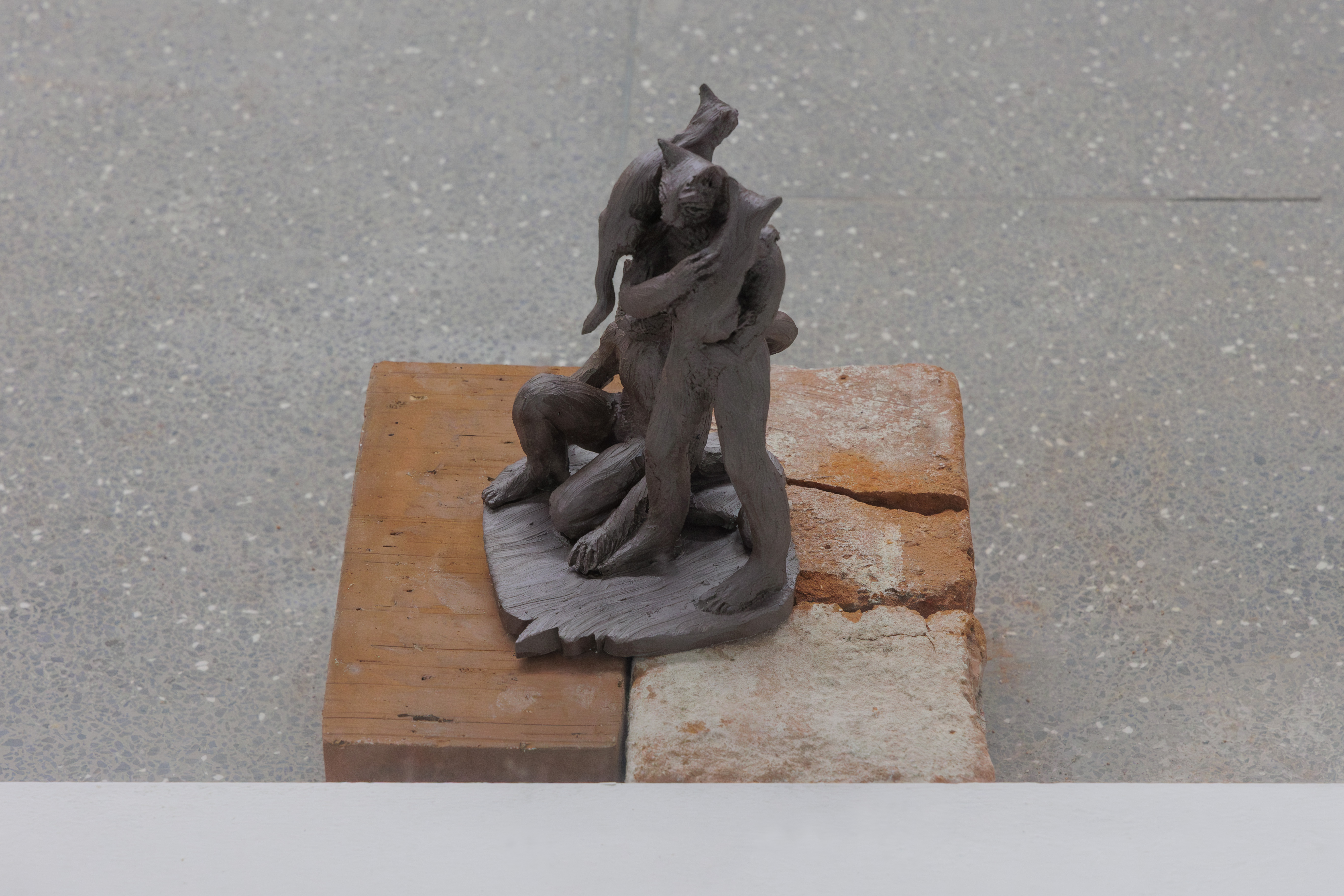 There are animals we see and animals we do not. The animals we do see, we organise and use, tame and breed. We control them as meticulously as Eadweard Muybridge did, when he set up multiple cameras to capture the image of the horse in motion or a lion in a cage, the starting point of Jakob Gilg’s paintings. We assign animals different roles: you there, you look soft and cuddly, you will be a pet. And you, you over there, so powerful and strong, you we will make into a symbol. Kitsch ceramic cats and scaled-down digital scans of lion monuments tumble, shatter and recombine in Julia Klemm’s work.