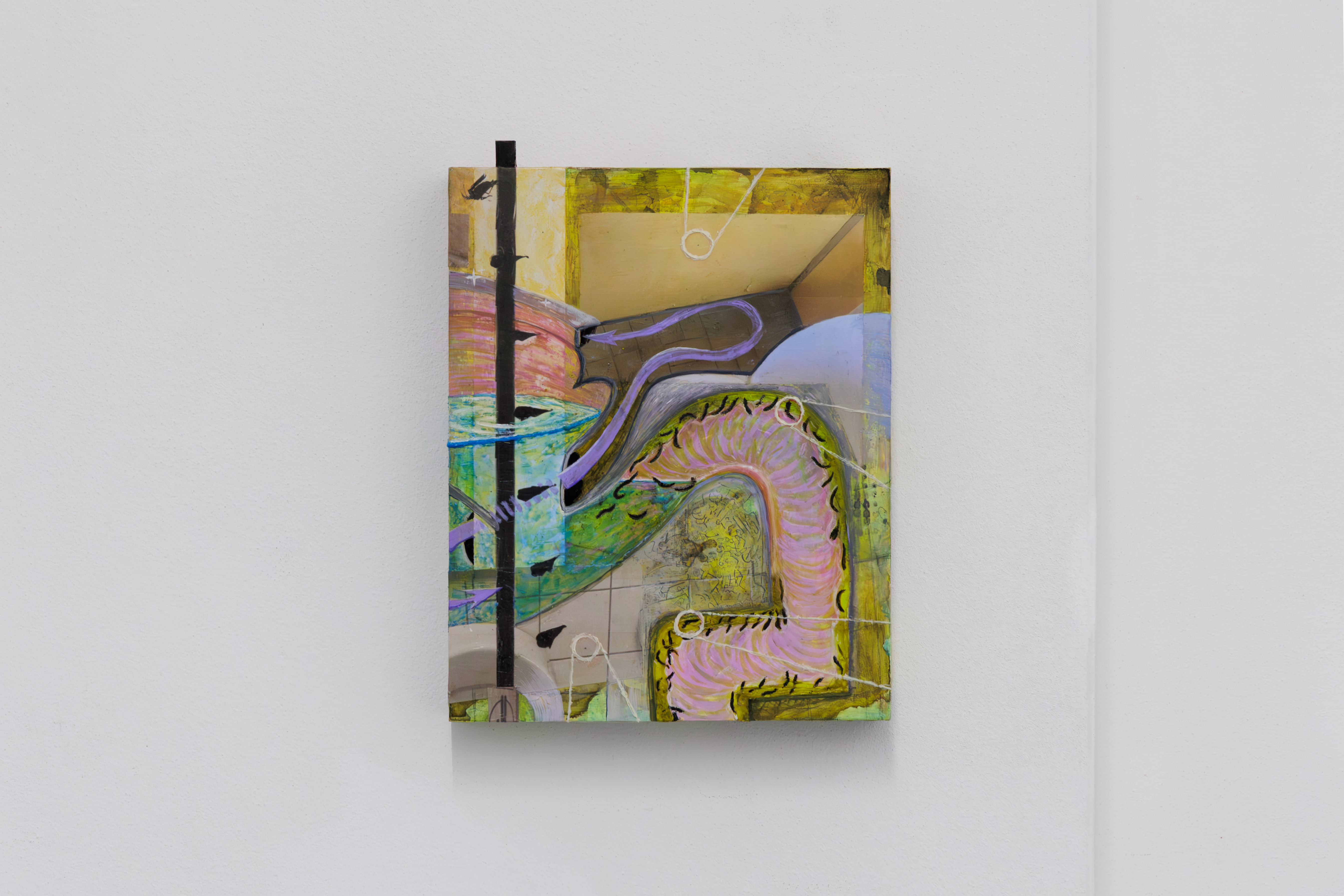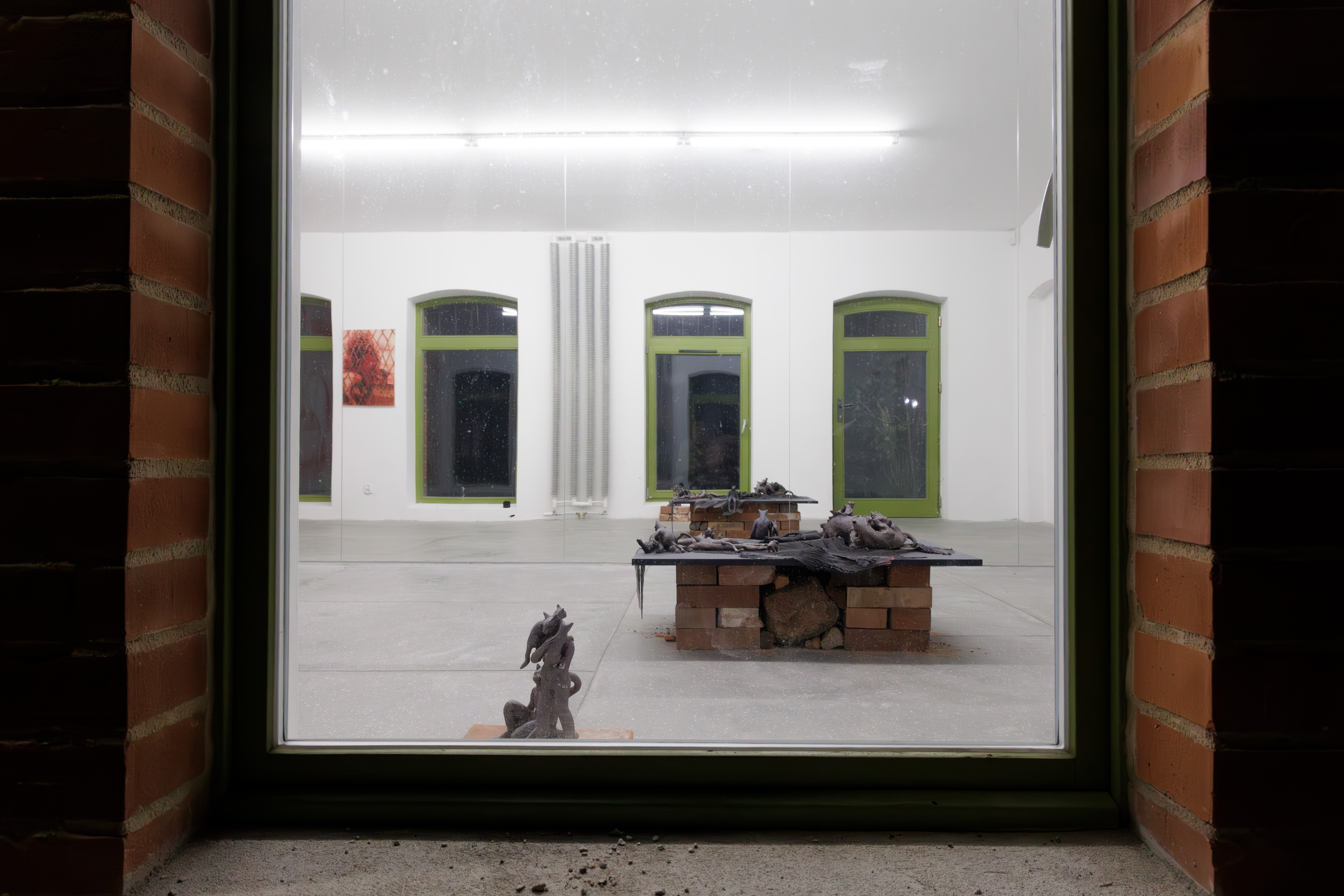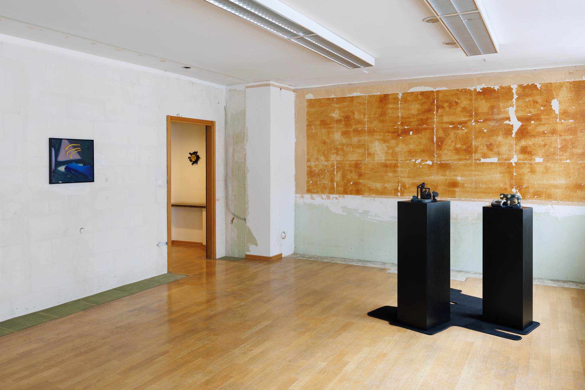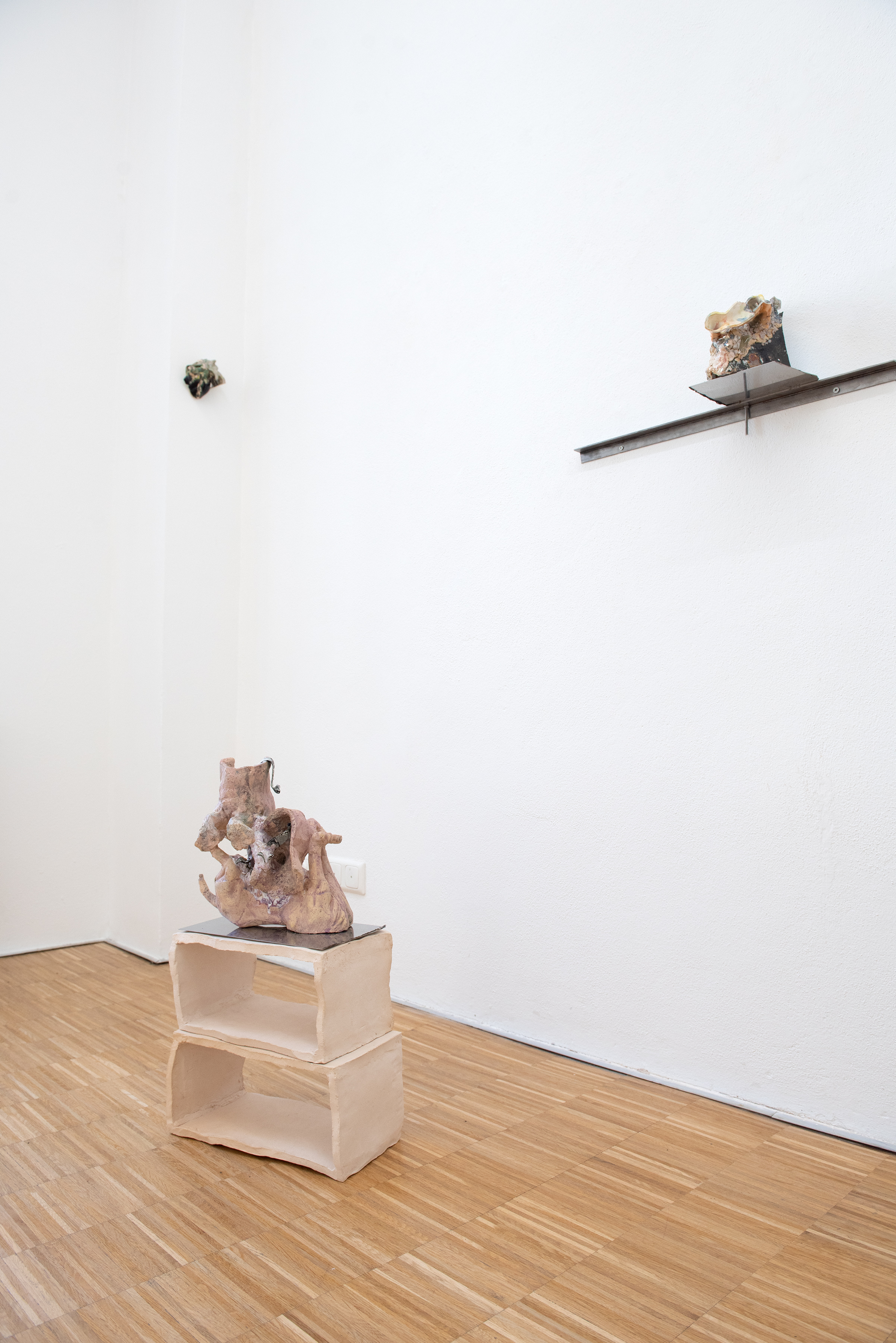 gouache paint, acrylic resin, biro, pencil, gesso and ink on wood. 31 x 24 x 5 cm; Julia Klemm, A chimera is not a pet 2,2025, steel, glaze, ceramic, pigment, 44 x 38 x 74 cm,; Julia Klemm, A chimera is not a pet 3 , 2025, steel, glaze, ceramic, pigment, 46 x 34 x 42 cm)