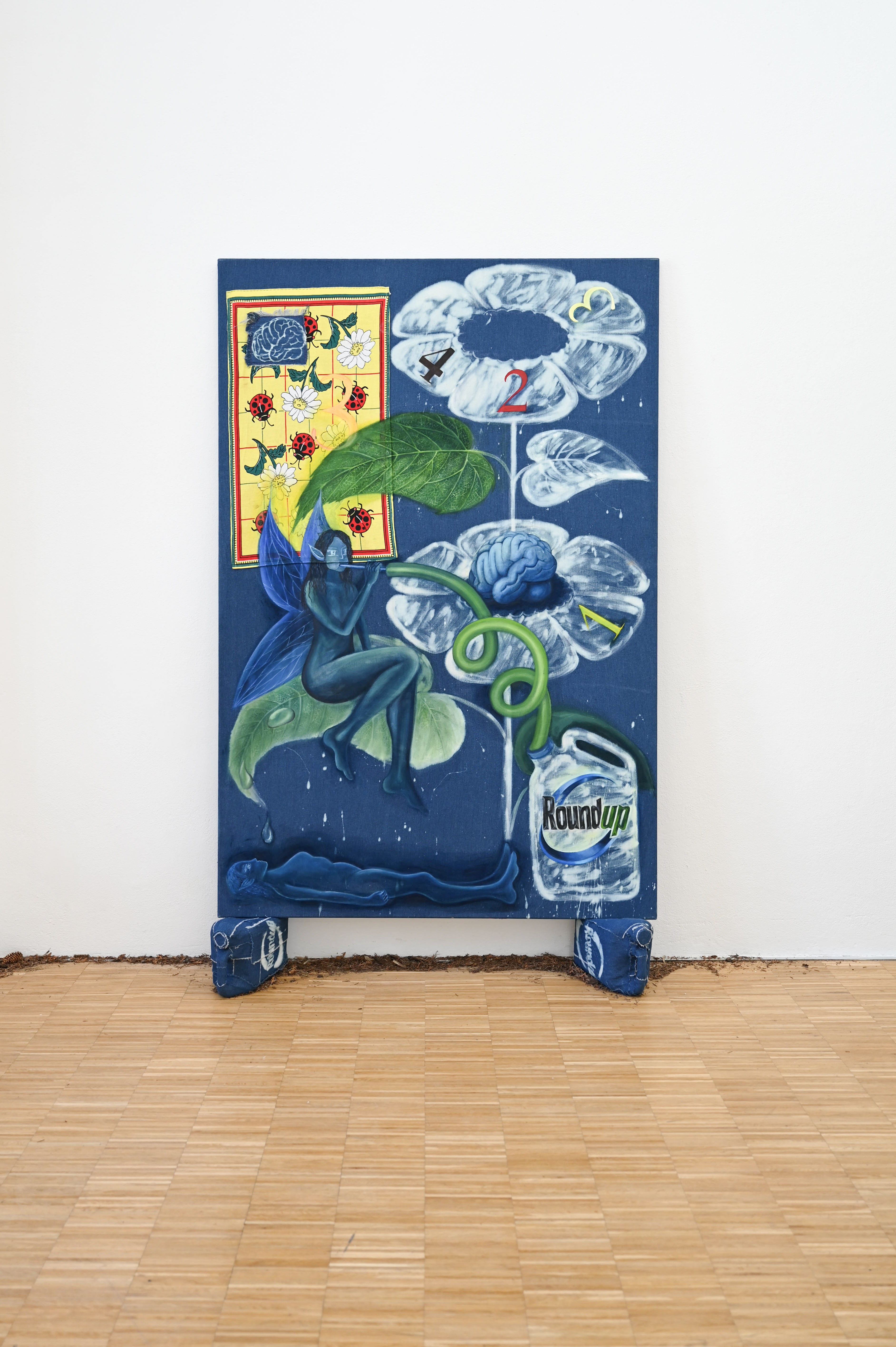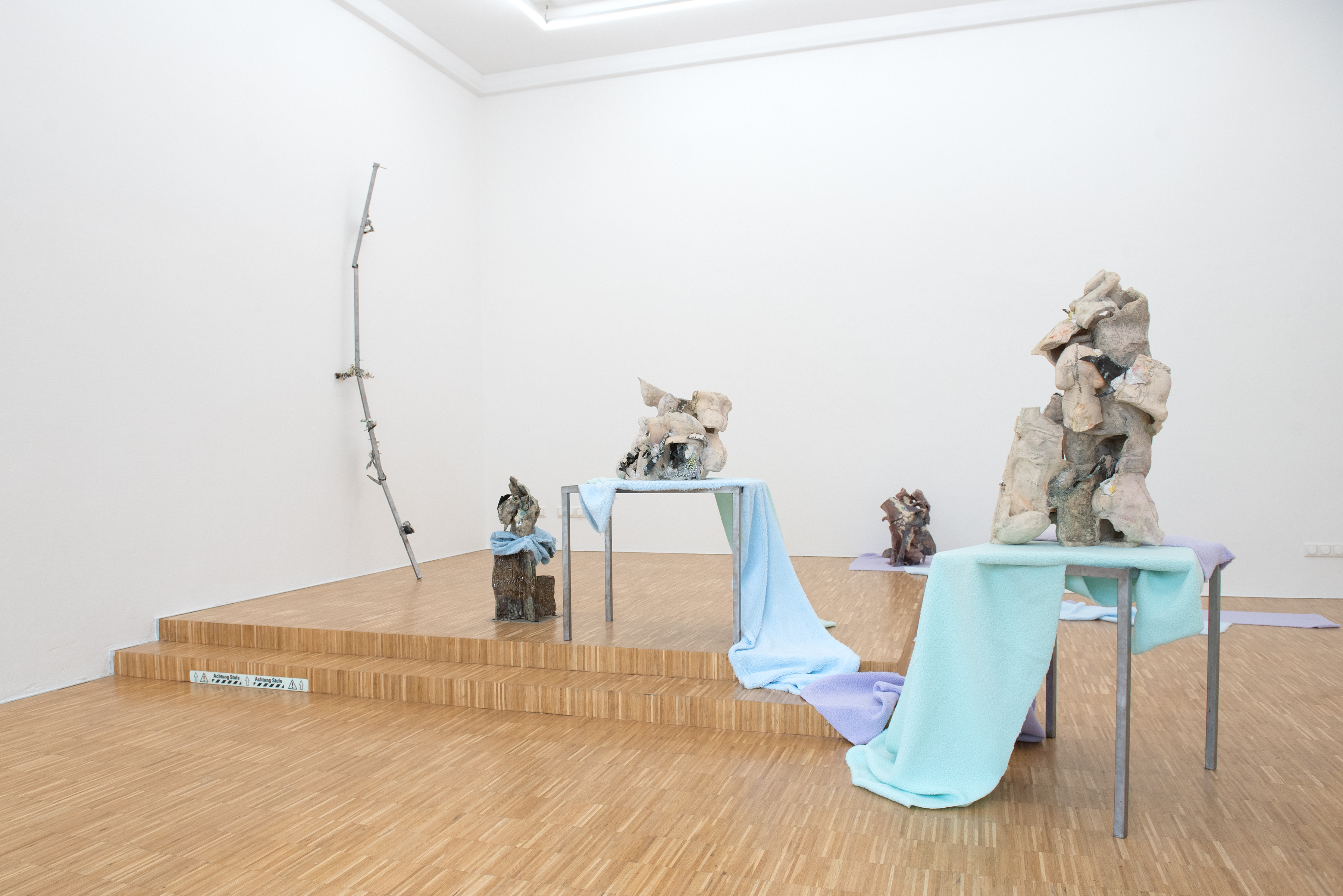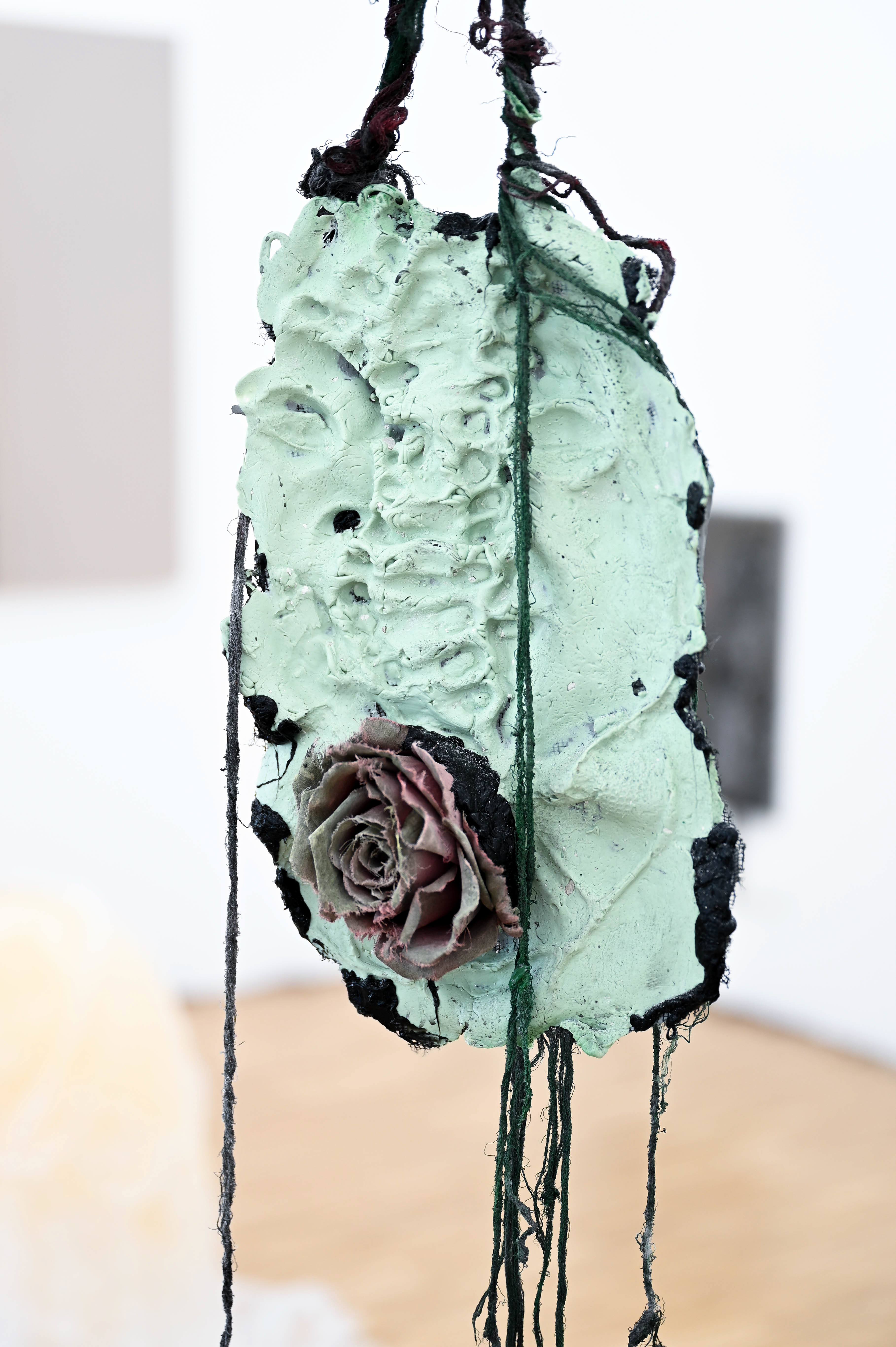 gouache paint, acrylic resin, biro, pencil, gesso and ink on wood. 31 x 24 x 5 cm; Julia Klemm, A chimera is not a pet 2,2025, steel, glaze, ceramic, pigment, 44 x 38 x 74 cm,; Julia Klemm, A chimera is not a pet 3 , 2025, steel, glaze, ceramic, pigment, 46 x 34 x 42 cm)