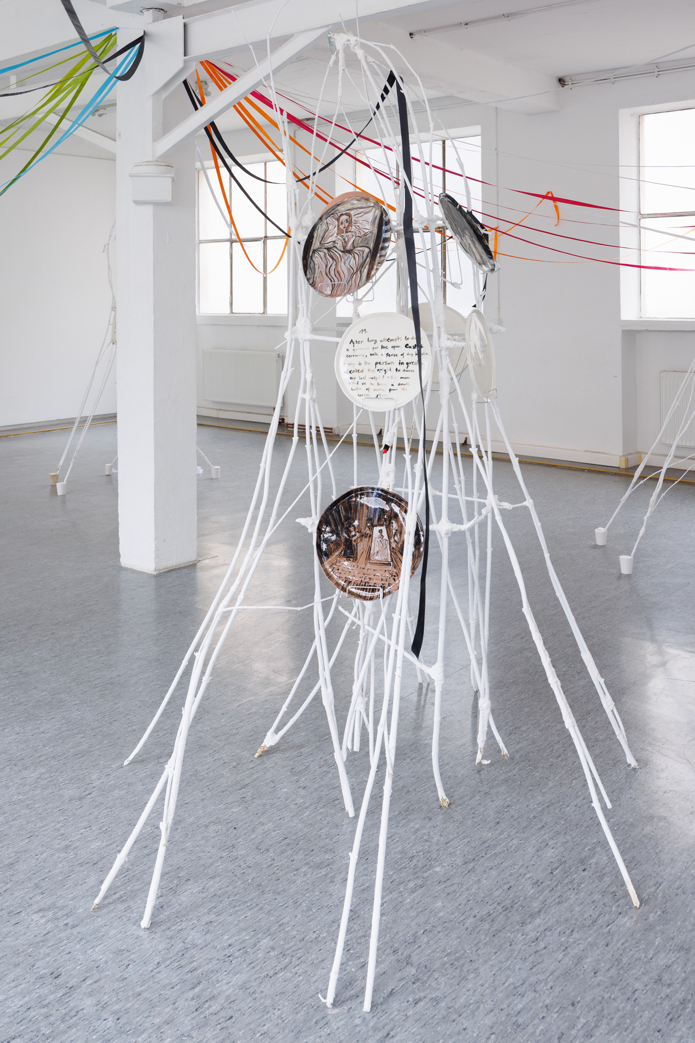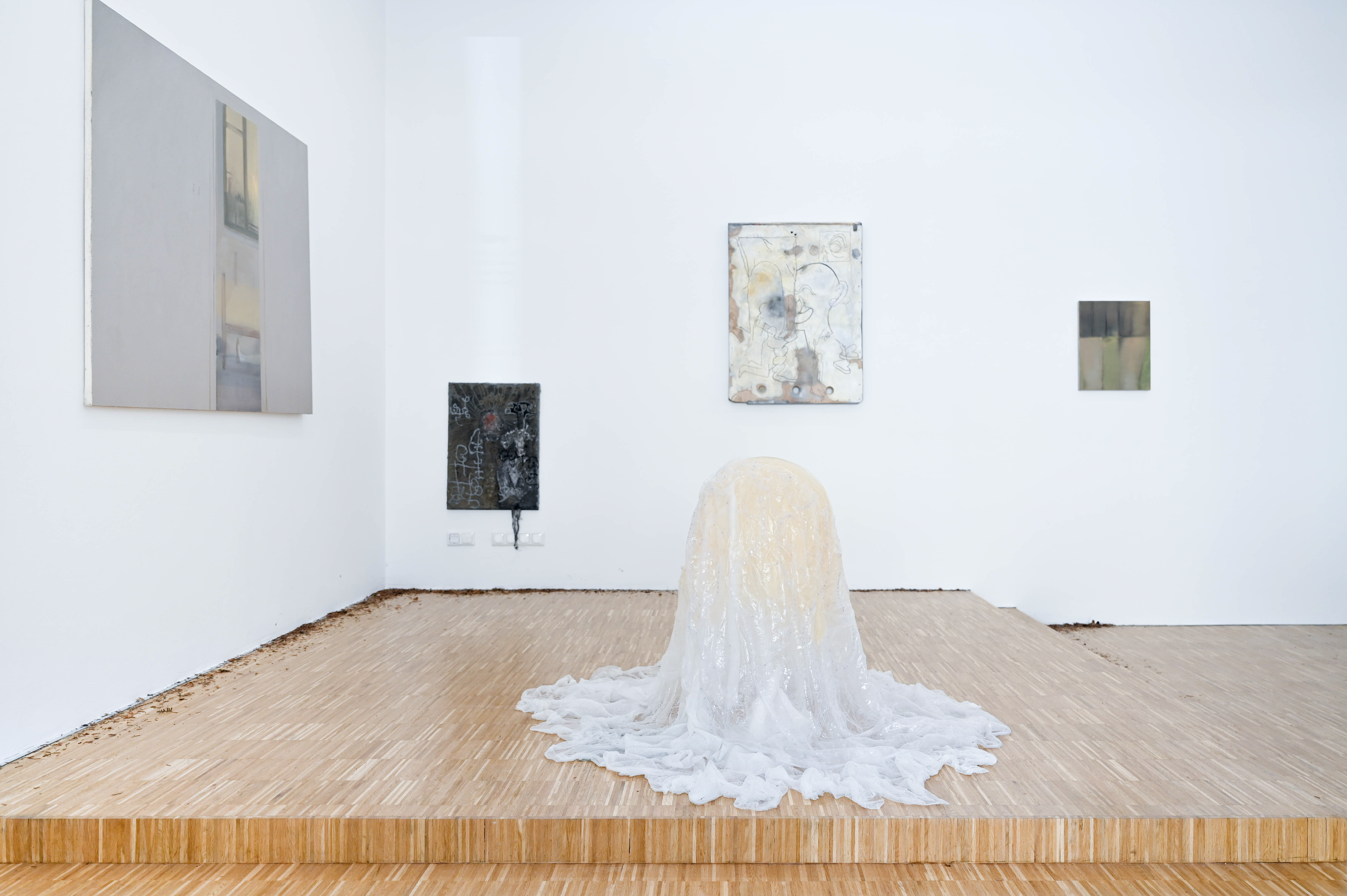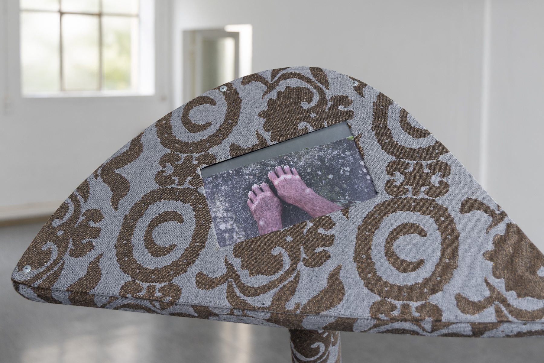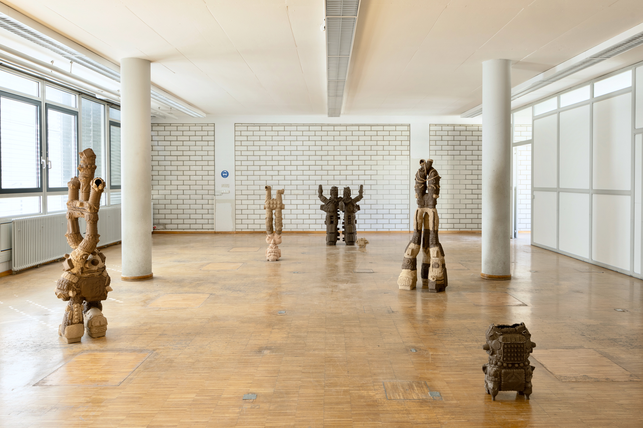 gouache paint, acrylic resin, biro, pencil, gesso and ink on wood. 31 x 24 x 5 cm; Julia Klemm, A chimera is not a pet 2,2025, steel, glaze, ceramic, pigment, 44 x 38 x 74 cm,; Julia Klemm, A chimera is not a pet 3 , 2025, steel, glaze, ceramic, pigment, 46 x 34 x 42 cm)