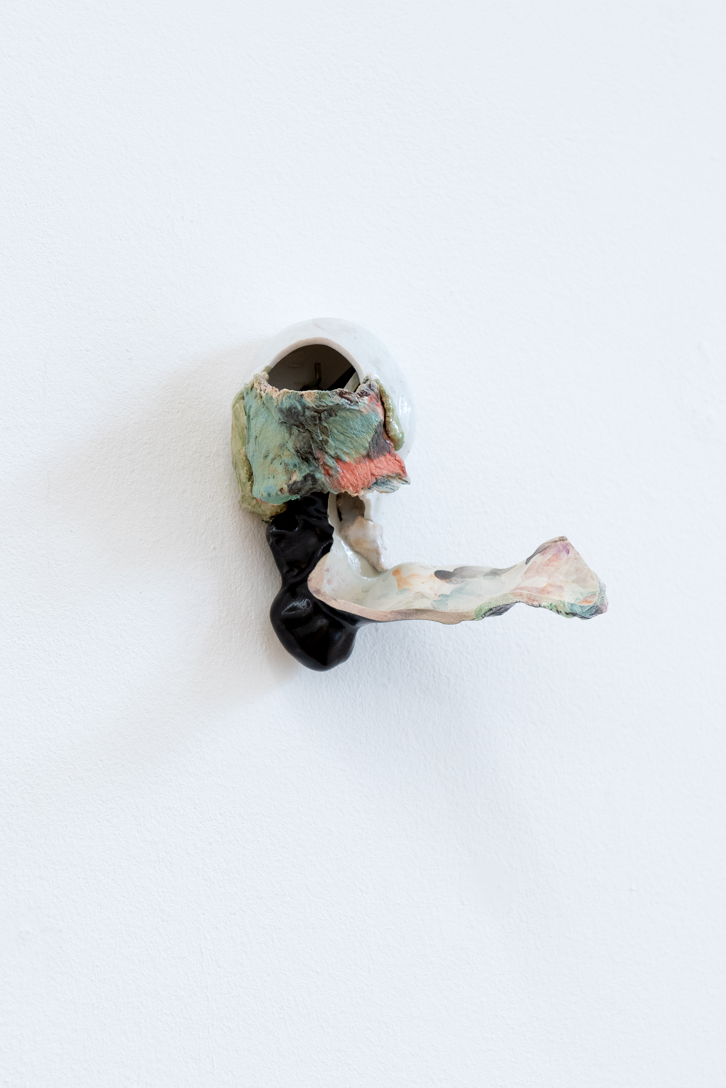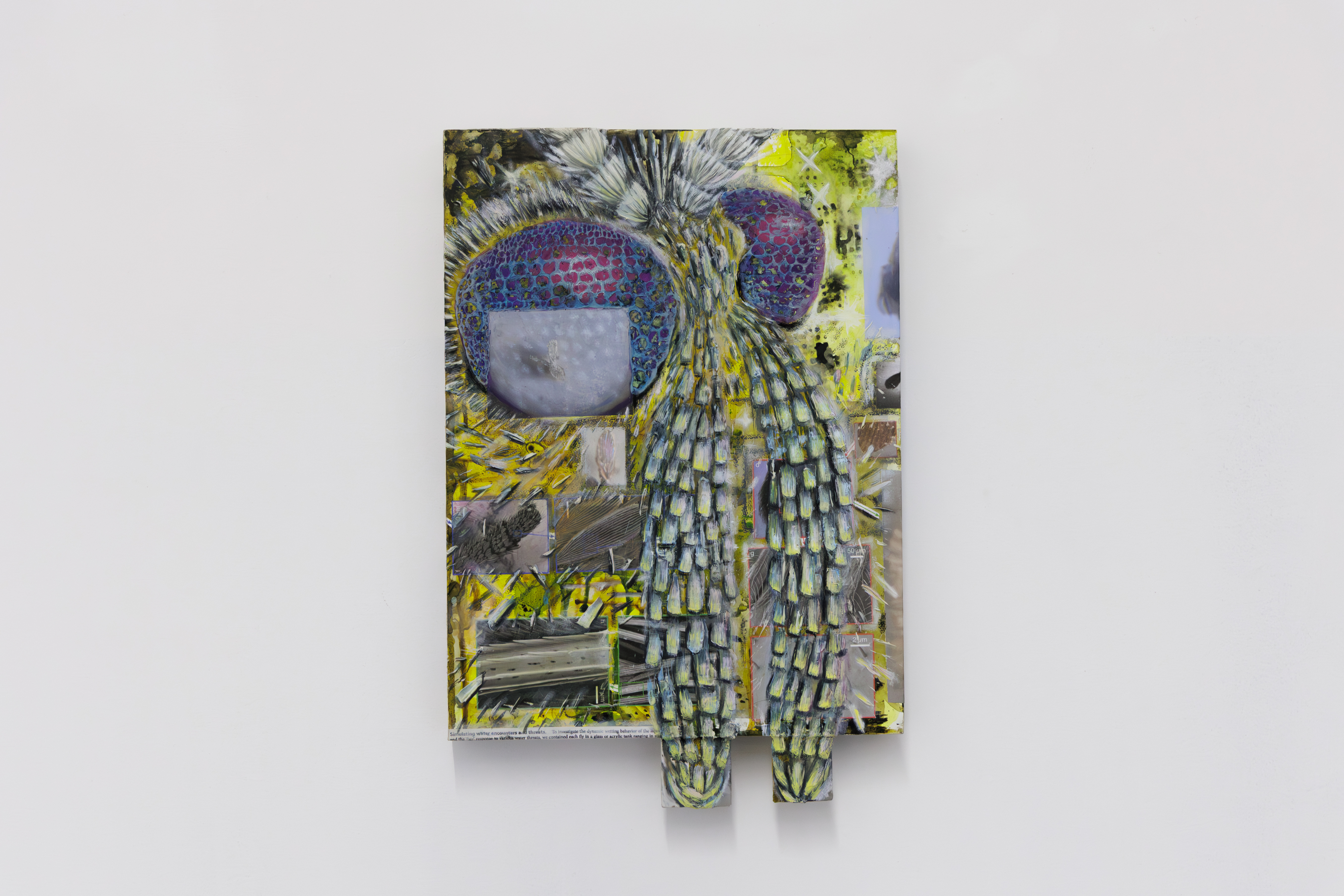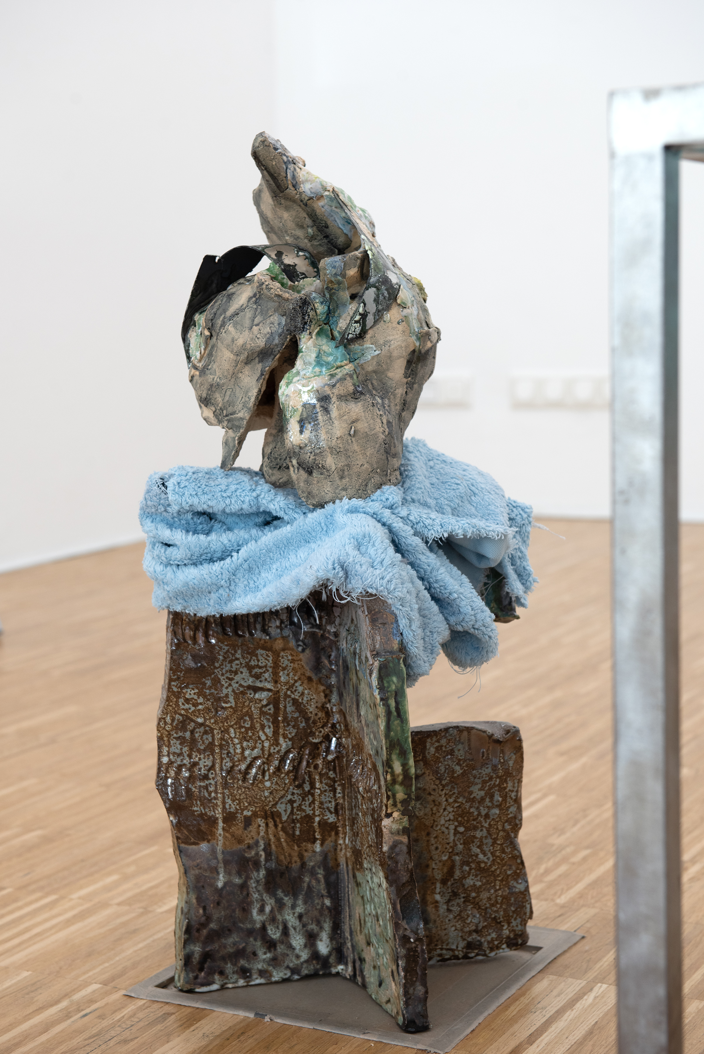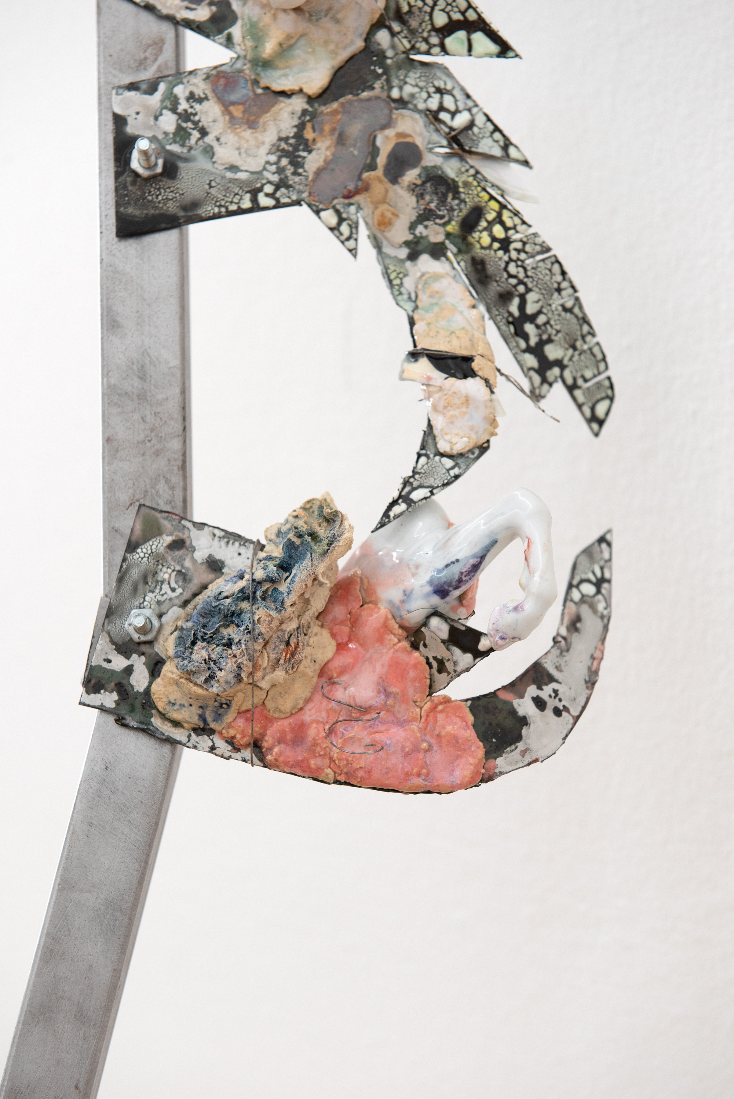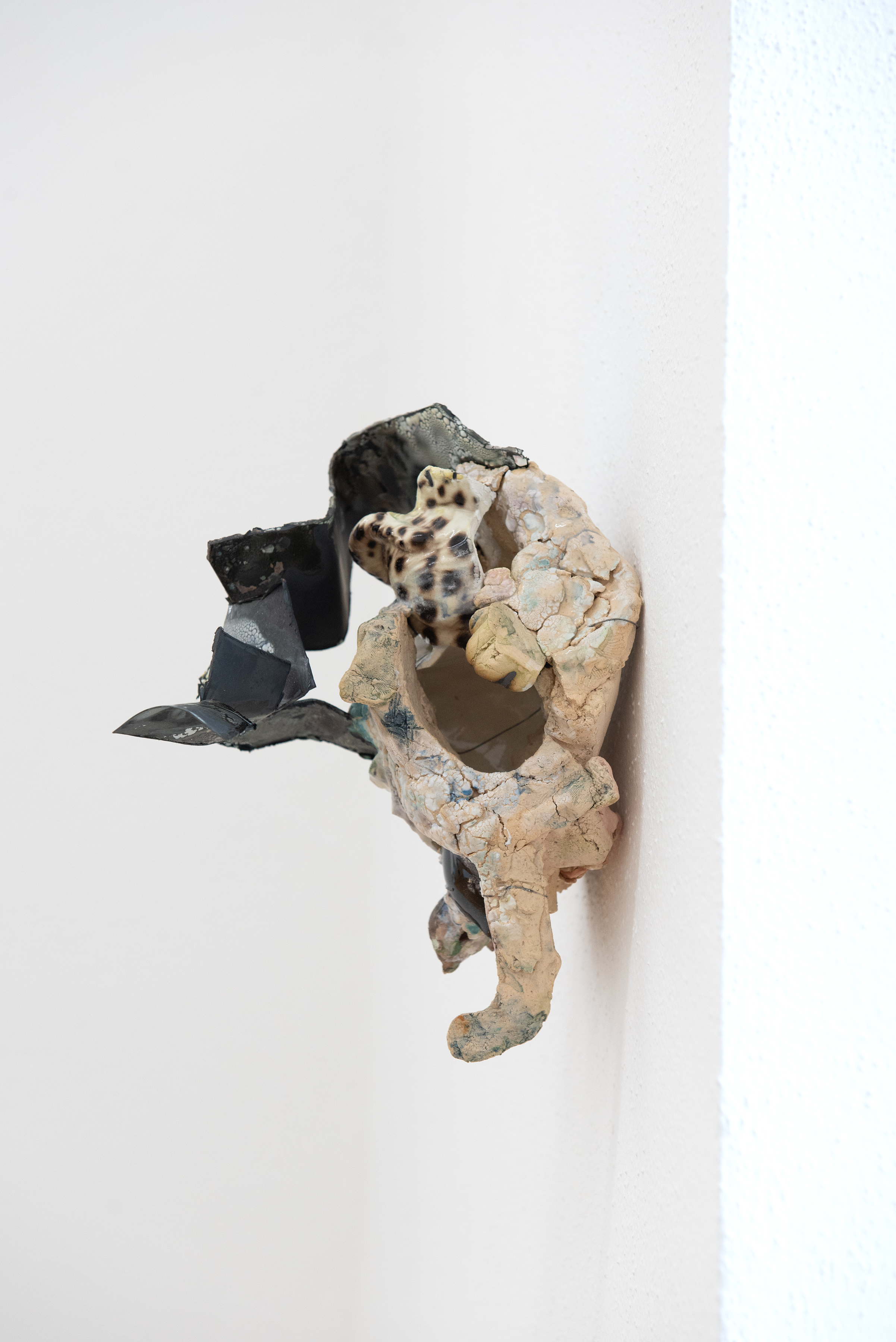 gouache paint, acrylic resin, biro, pencil, gesso and ink on wood. 31 x 24 x 5 cm; Julia Klemm, A chimera is not a pet 2, 2025, steel, glaze, ceramic, pigment, 44 x 38 x 74 cm, )