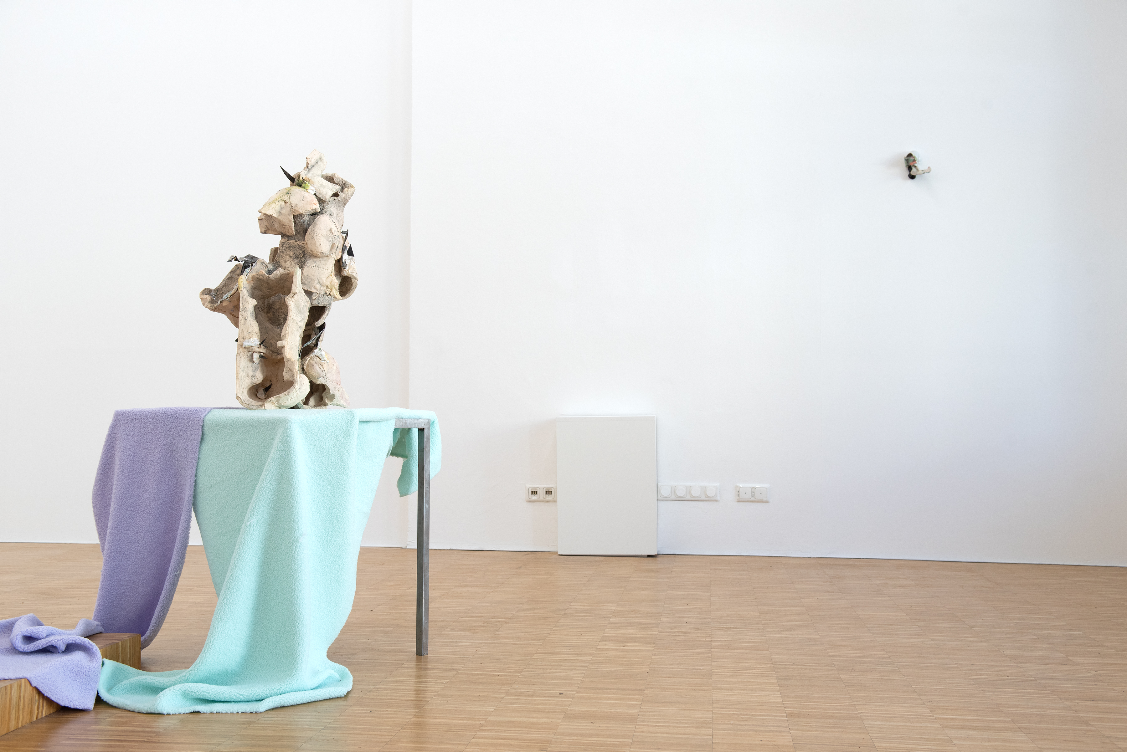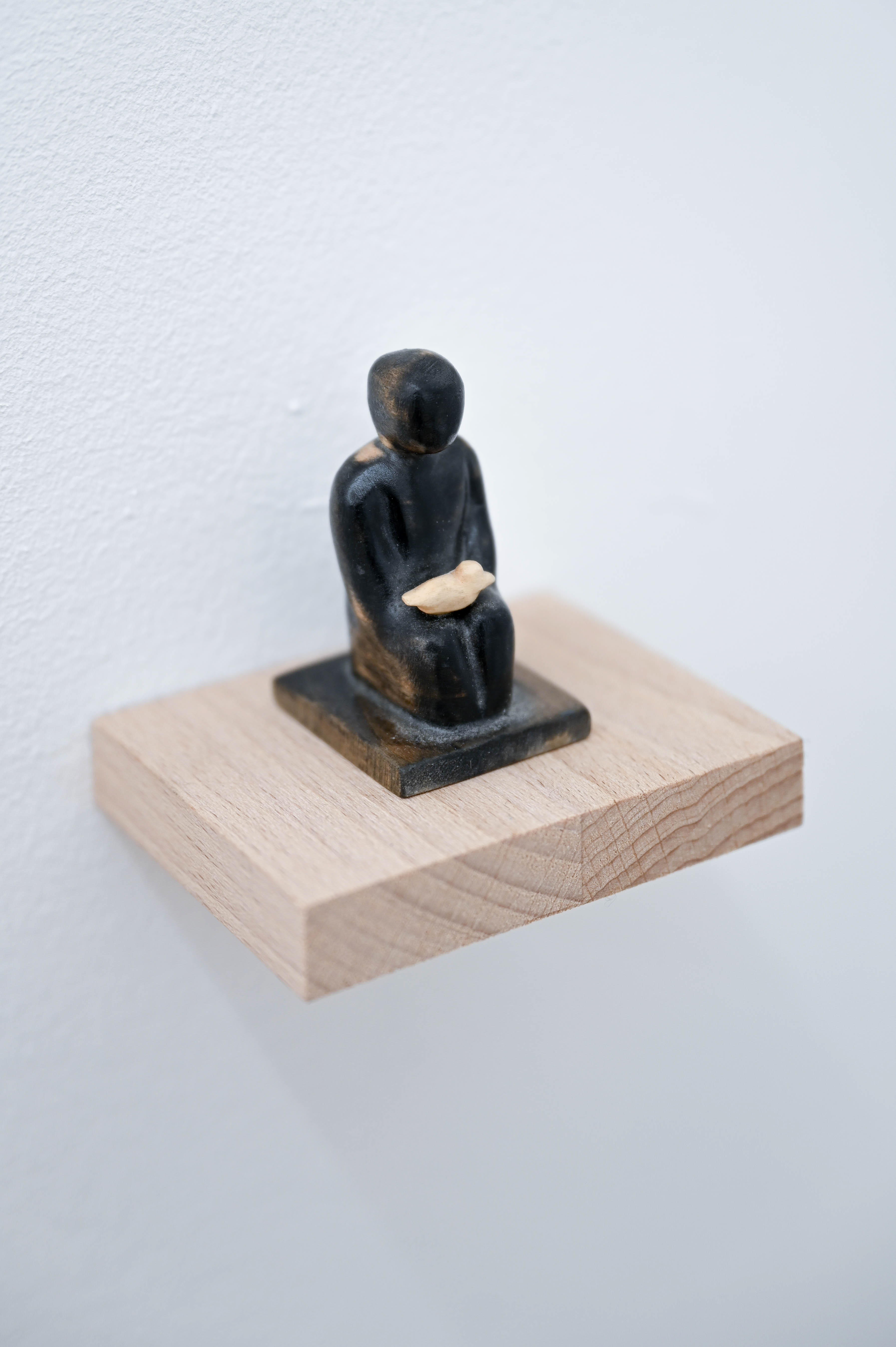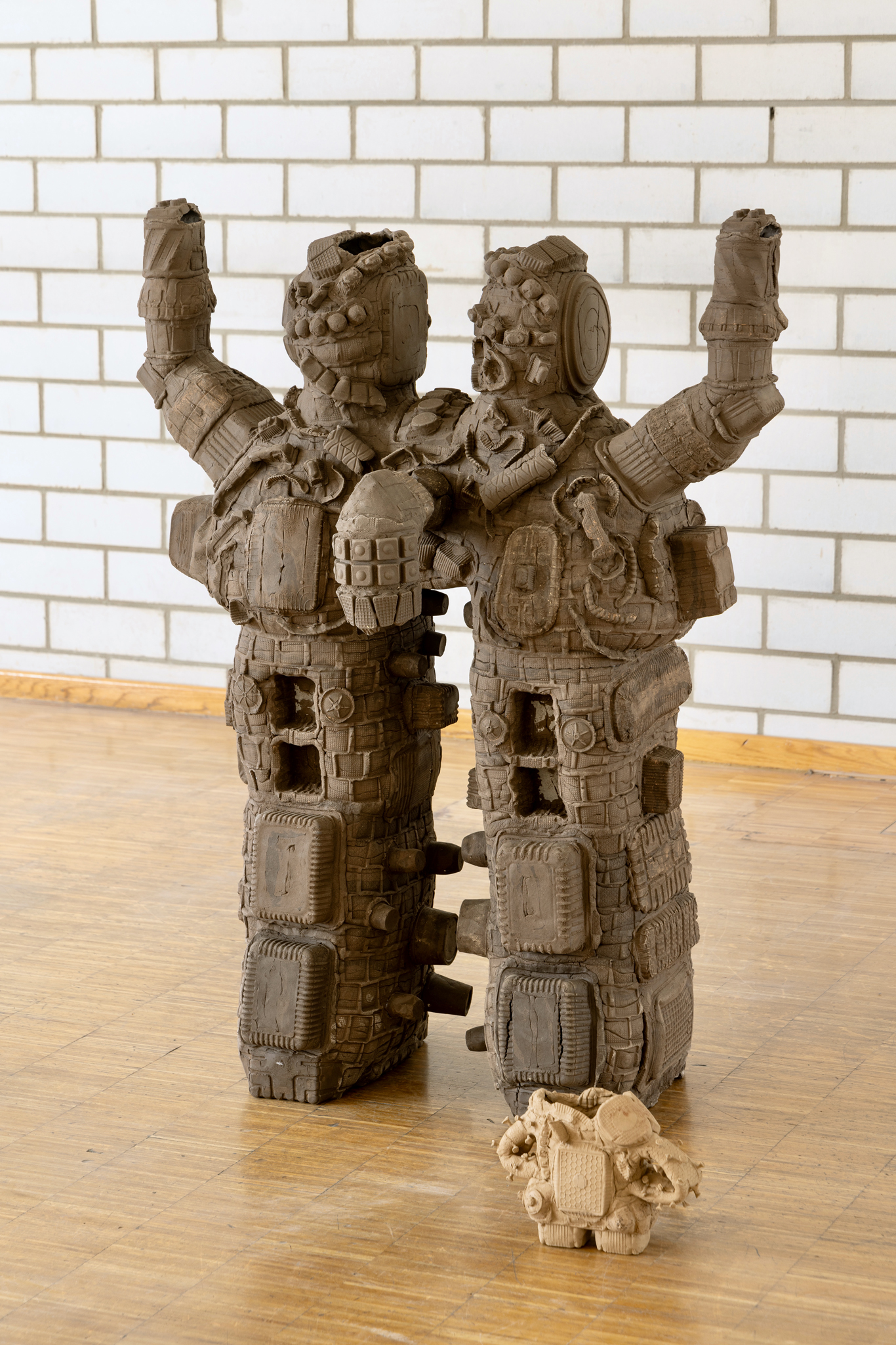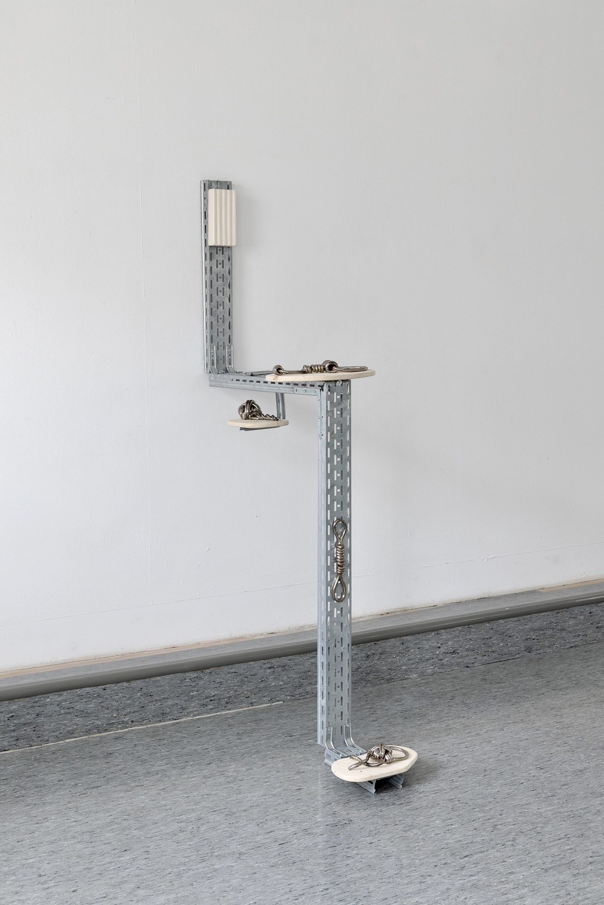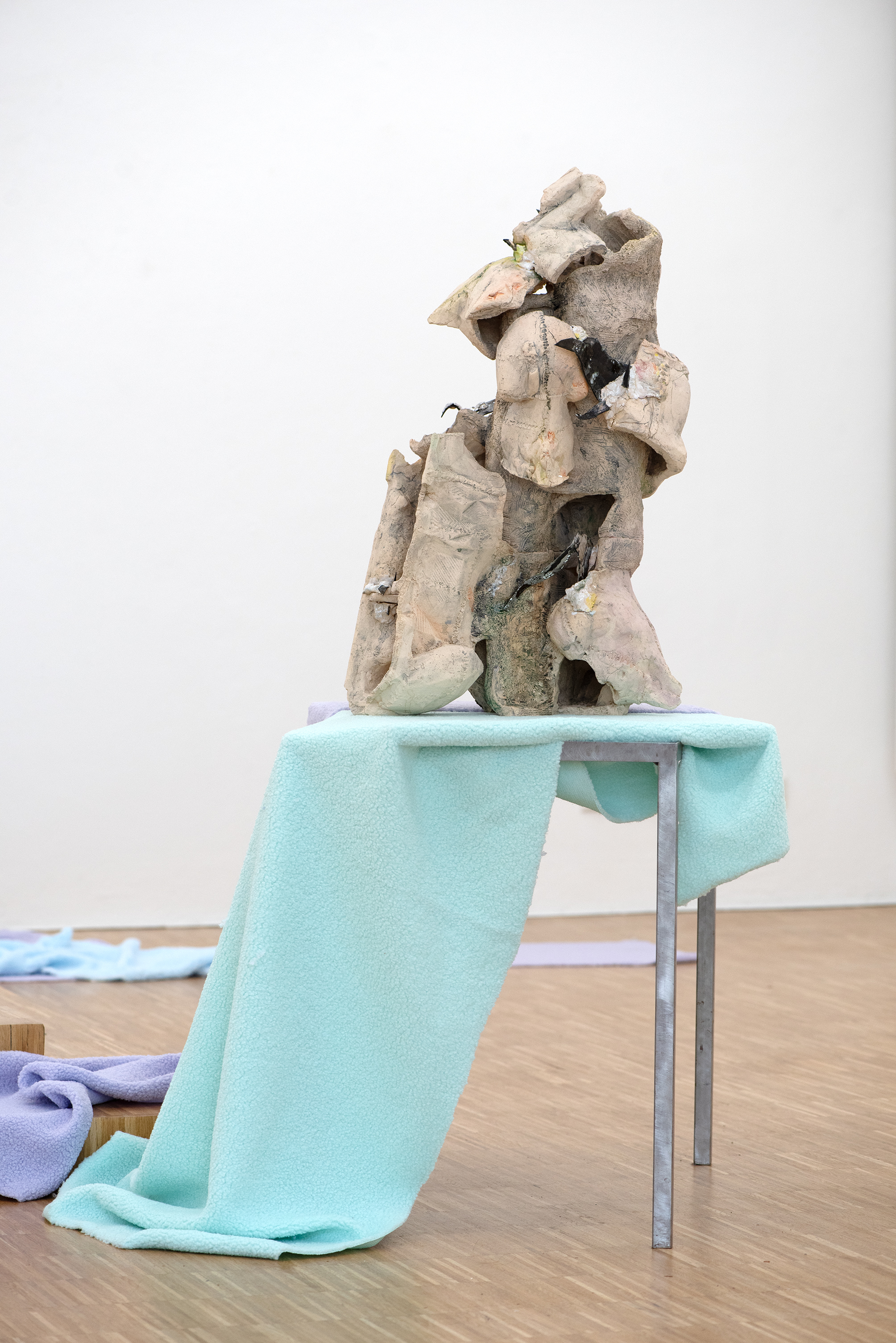 gouache paint, acrylic resin, biro, pencil, gesso and ink on wood. 31 x 24 x 5 cm; Julia Klemm, A chimera is not a pet 2, 2025, steel, glaze, ceramic, pigment, 44 x 38 x 74 cm, )