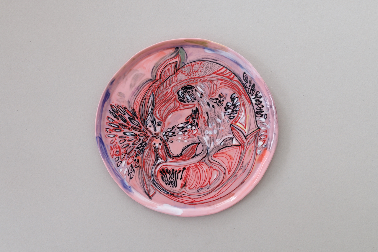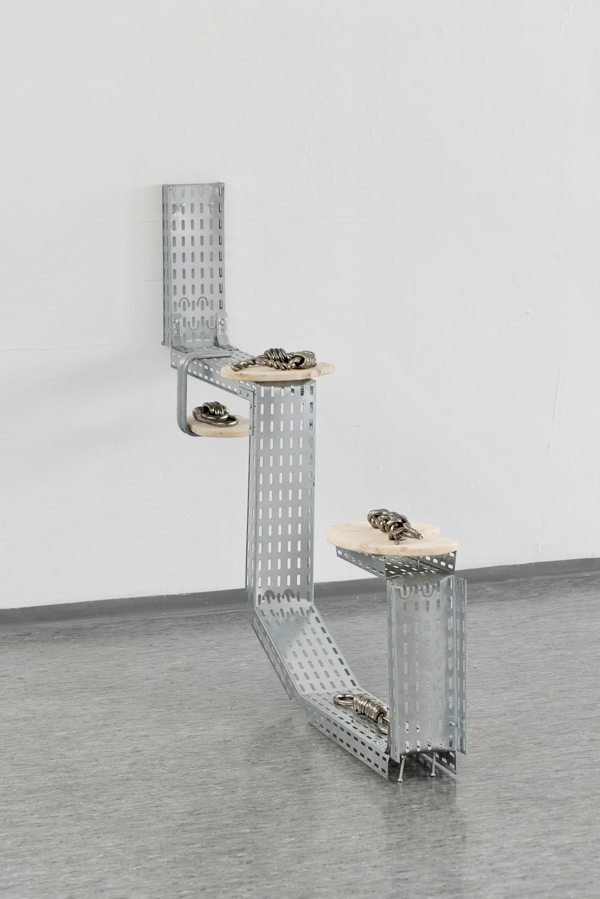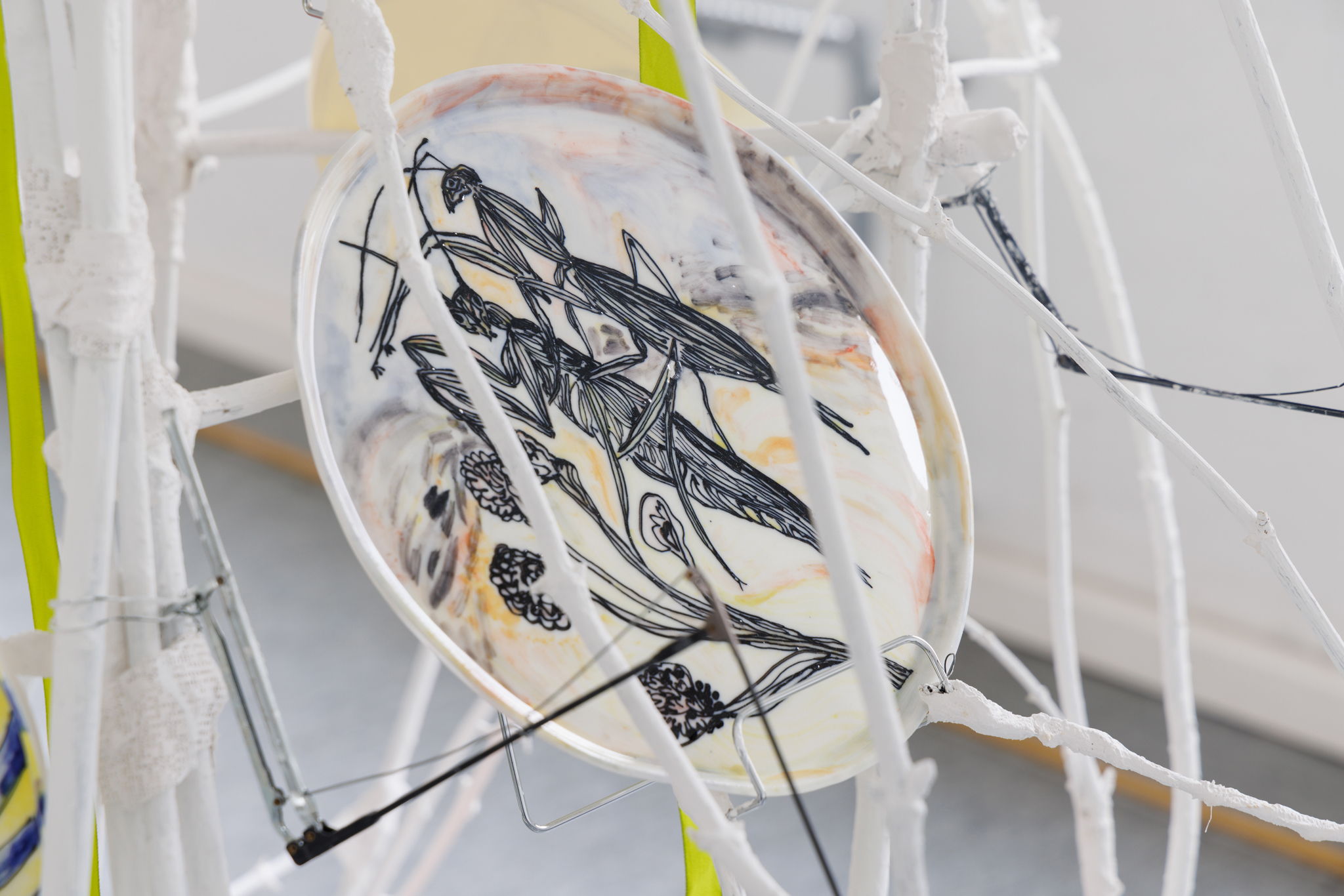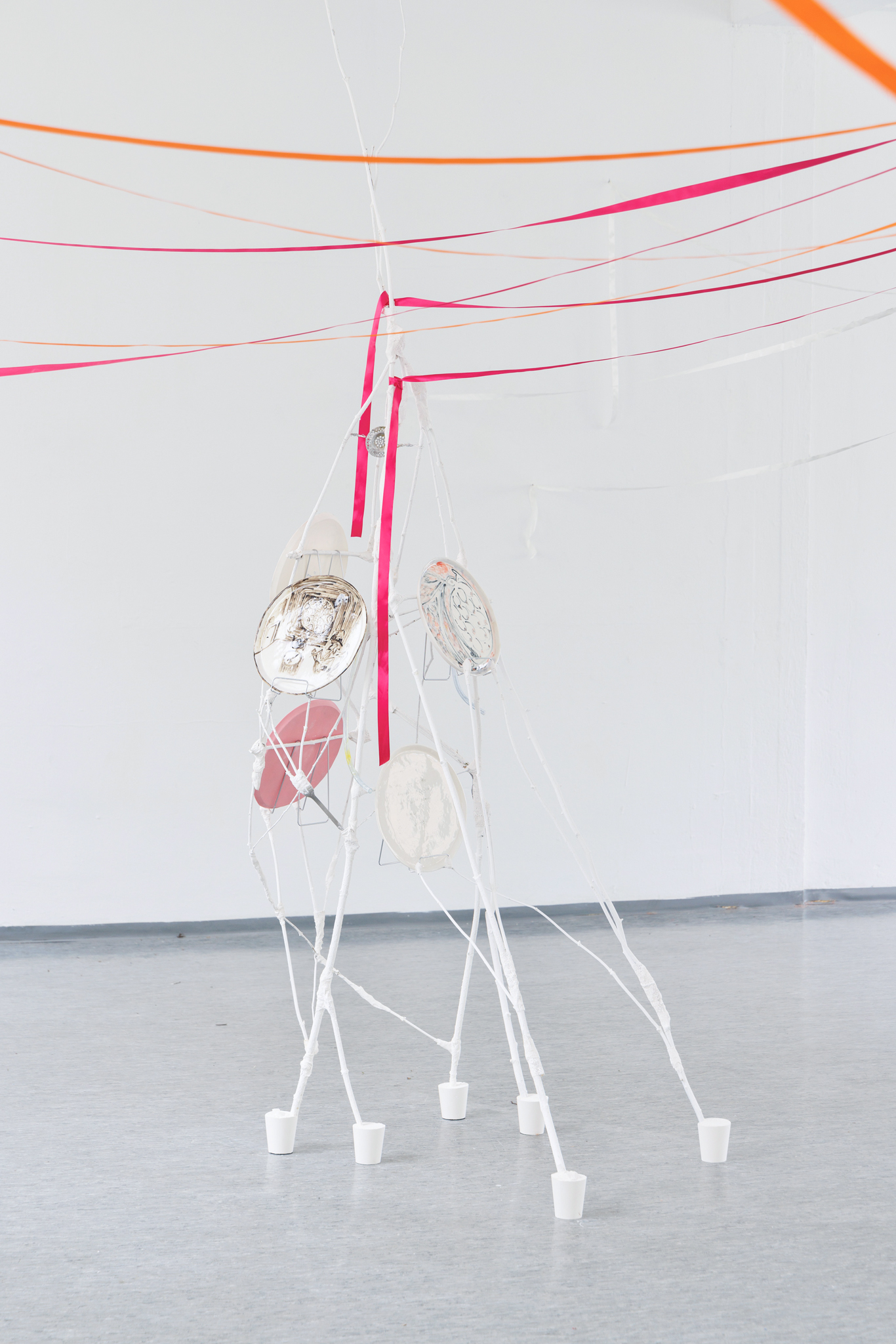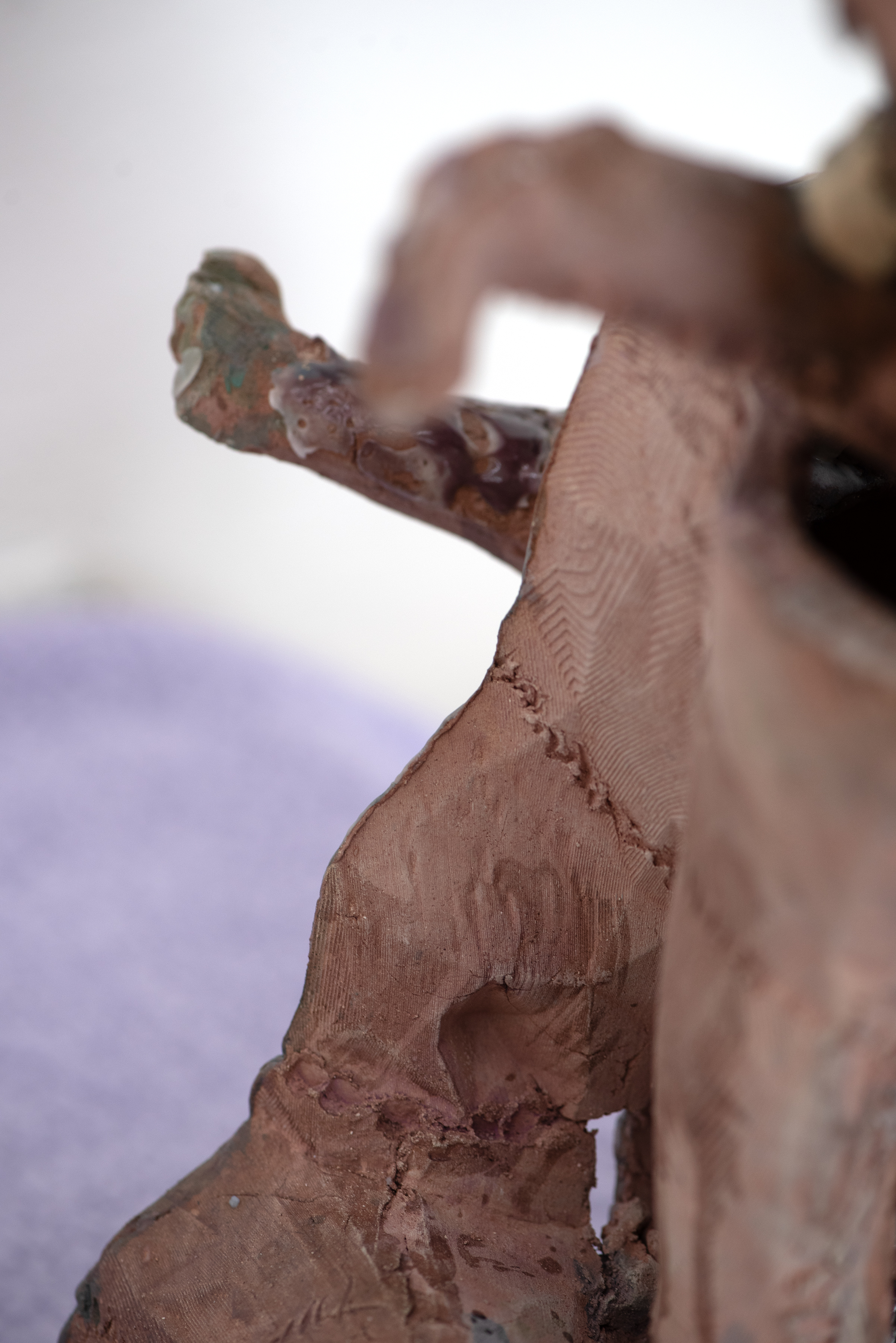 gouache paint, acrylic resin, biro, pencil, gesso and ink on wood. 31 x 24 x 5 cm; Julia Klemm, A chimera is not a pet 2, 2025, steel, glaze, ceramic, pigment, 44 x 38 x 74 cm, )