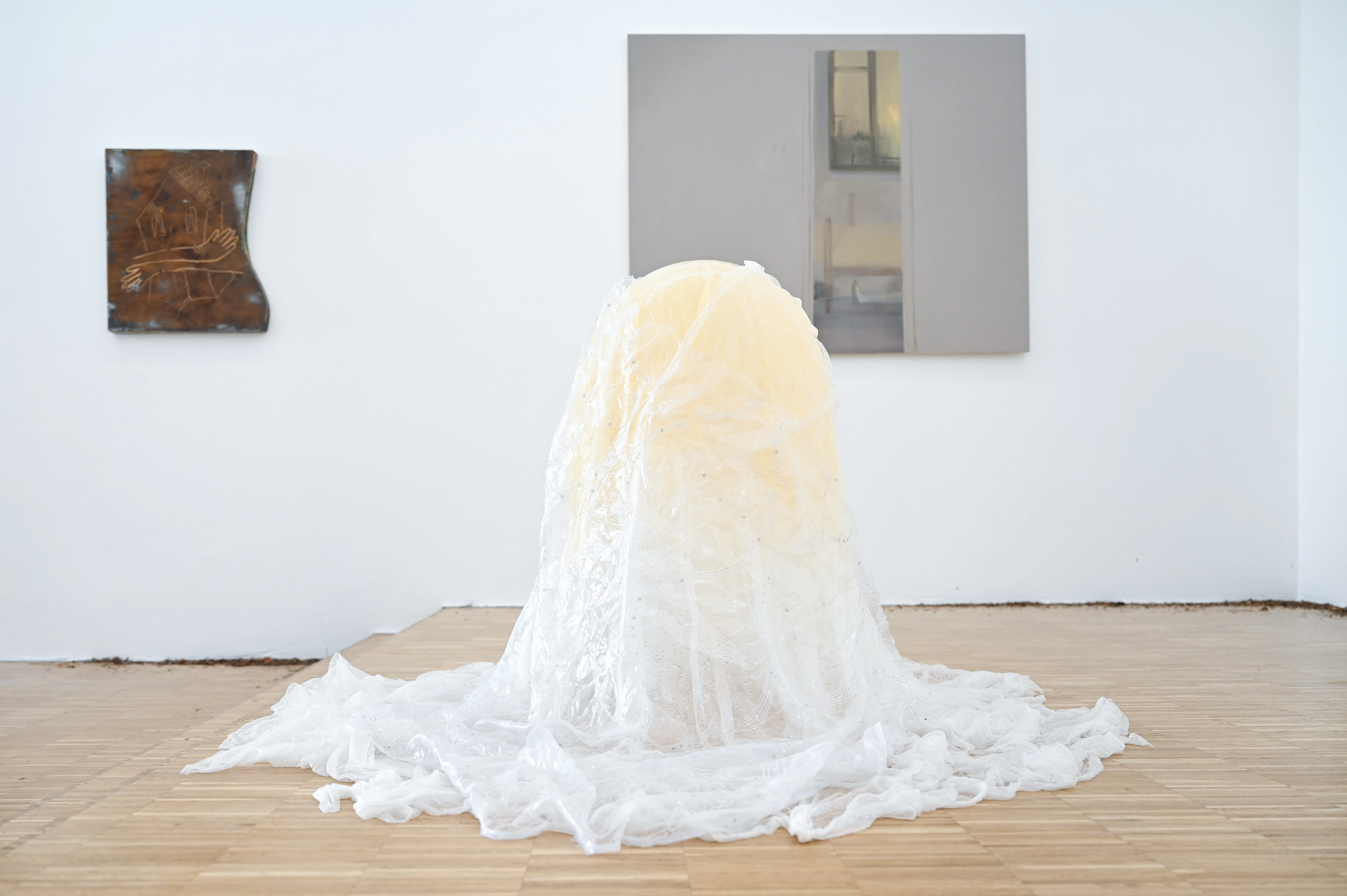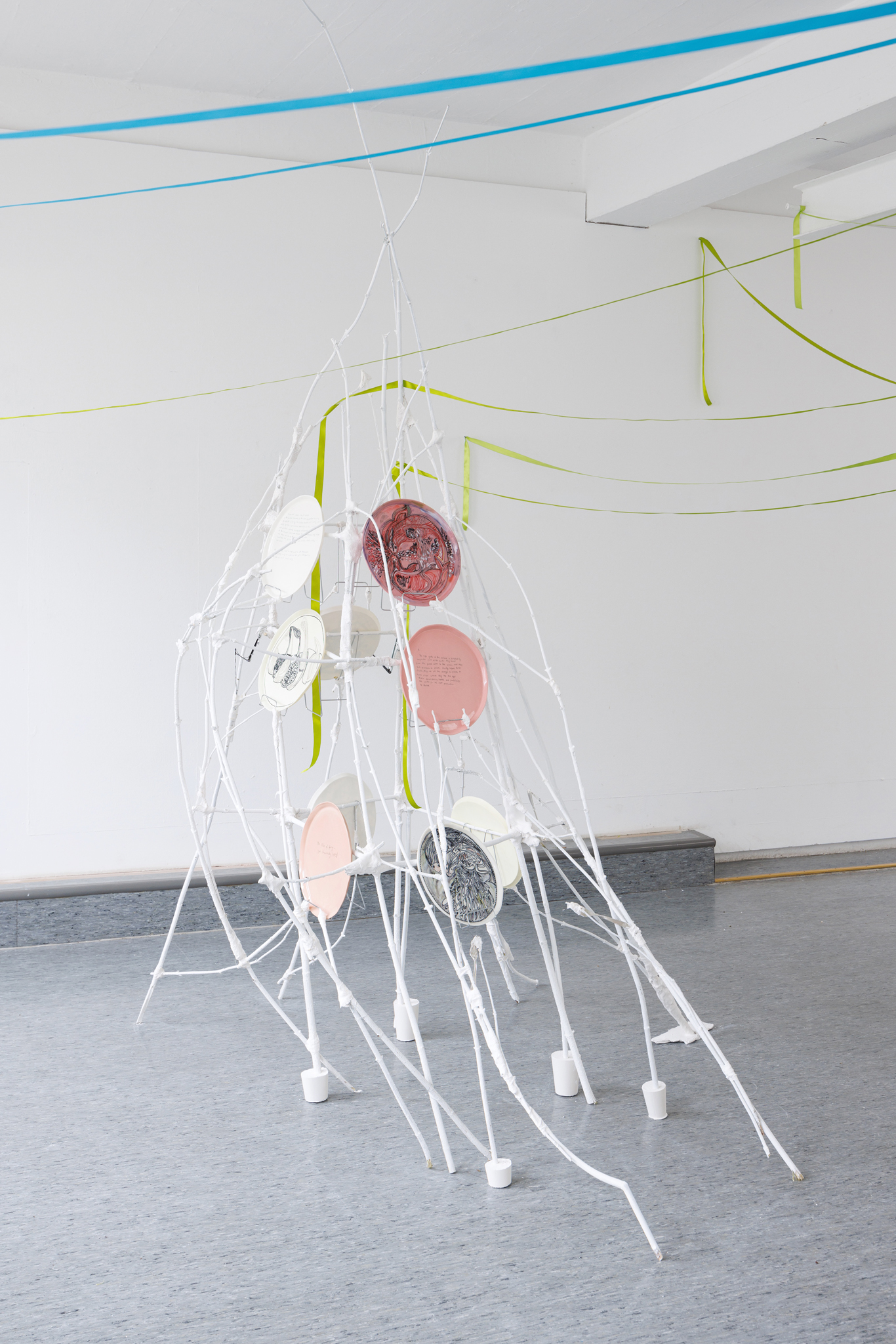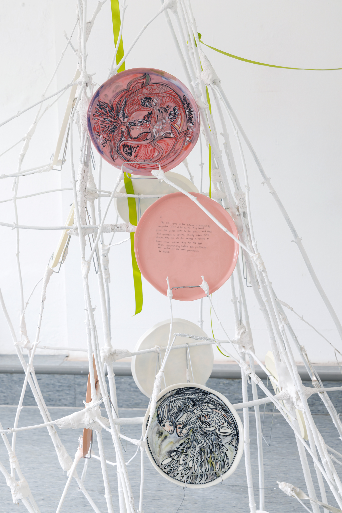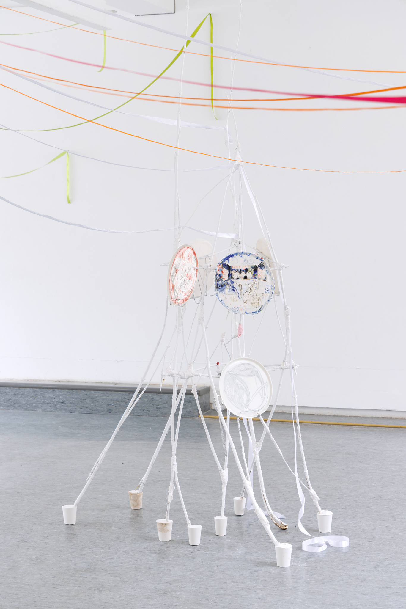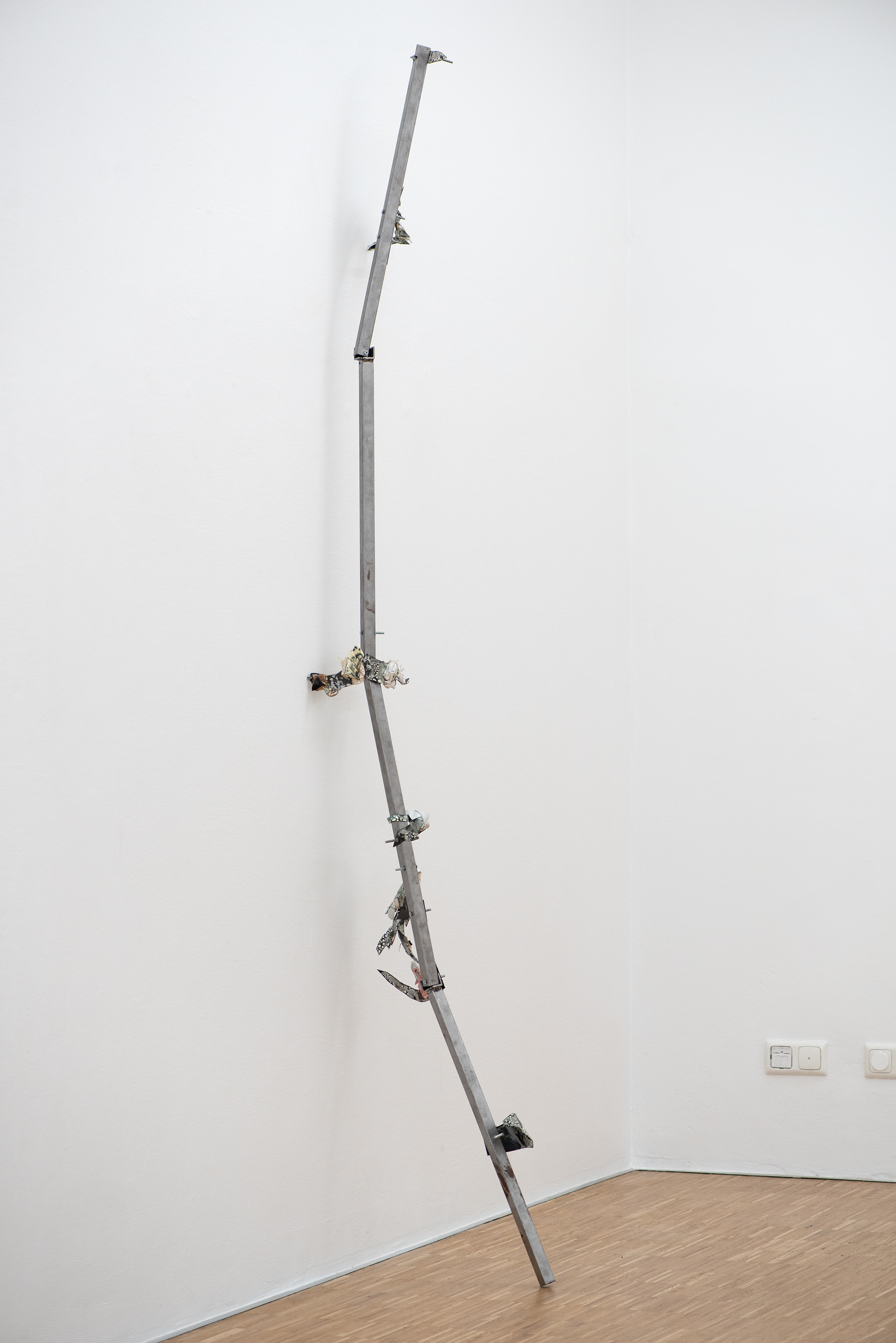gouache paint, acrylic resin, biro, pencil, gesso and ink on wood. 31 x 24 x 5 cm; Julia Klemm, A chimera is not a pet 2, 2025, steel, glaze, ceramic, pigment, 44 x 38 x 74 cm, )