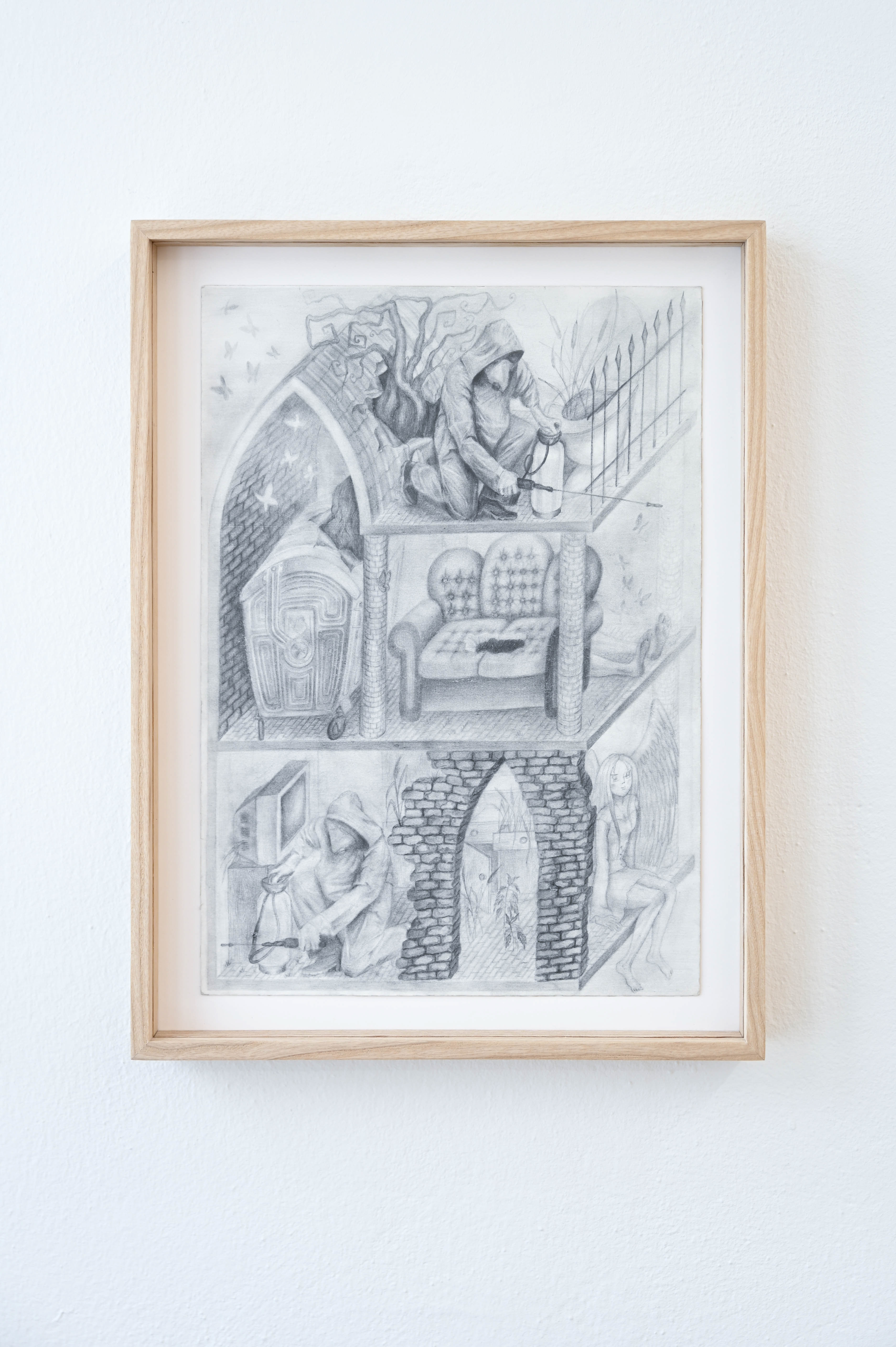 Ah, I say, but can we see the animal Deleuze and Guattari describe as possessing an English kind of elegance? With a refinement that does not seek attention, but that remains quietly unobtrusive? This involves the appreciation of the small and the detailed, like those drain moths found in Jonathan Penca’s paintings, charming us with their fuzzy faces and furry wings. More than that, unobtrusiveness requires an effort. To go through life unnoticed is not easy and drain moths have a life cycle with four stages, larvae feeding on toilet sludge before developing into pupae.