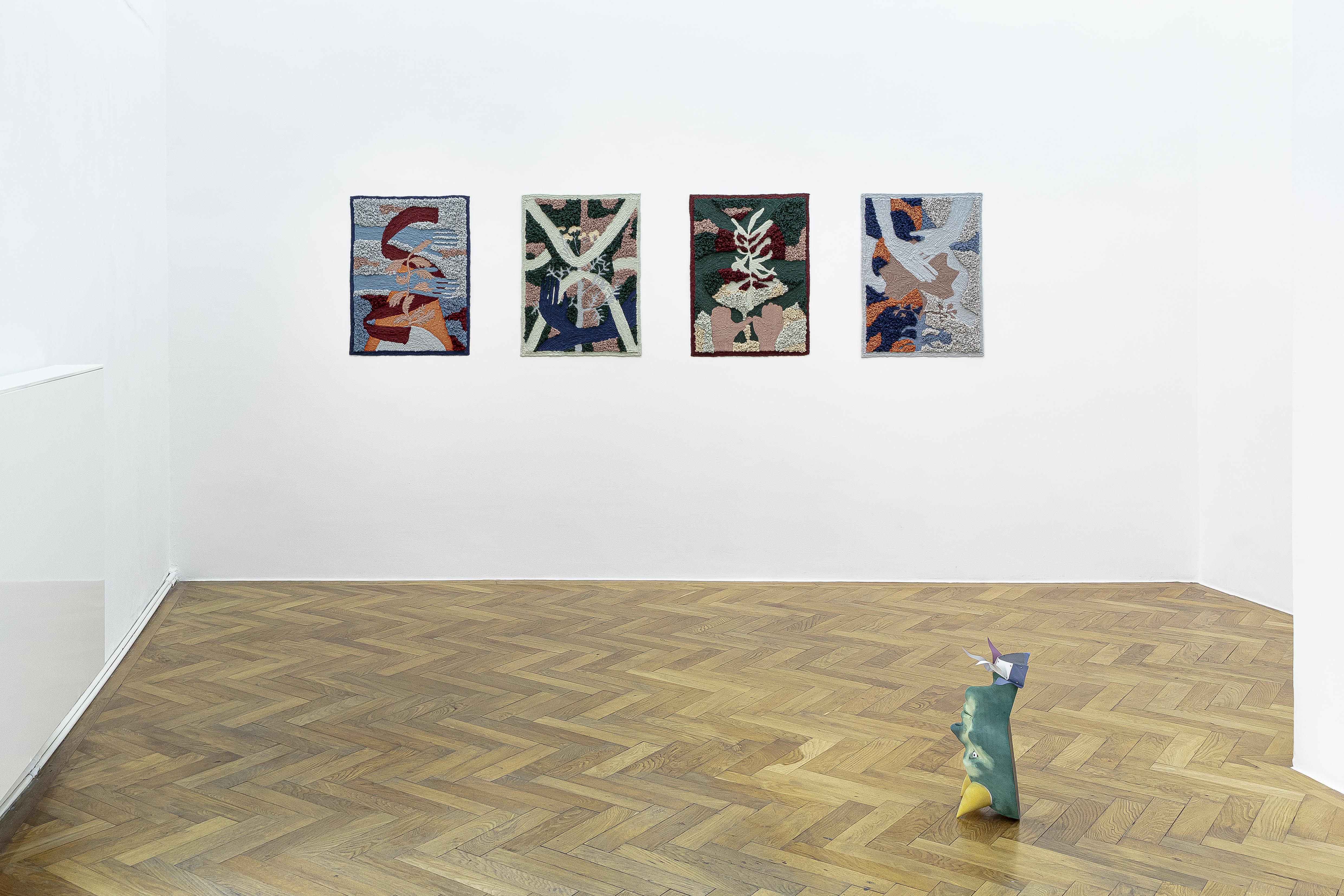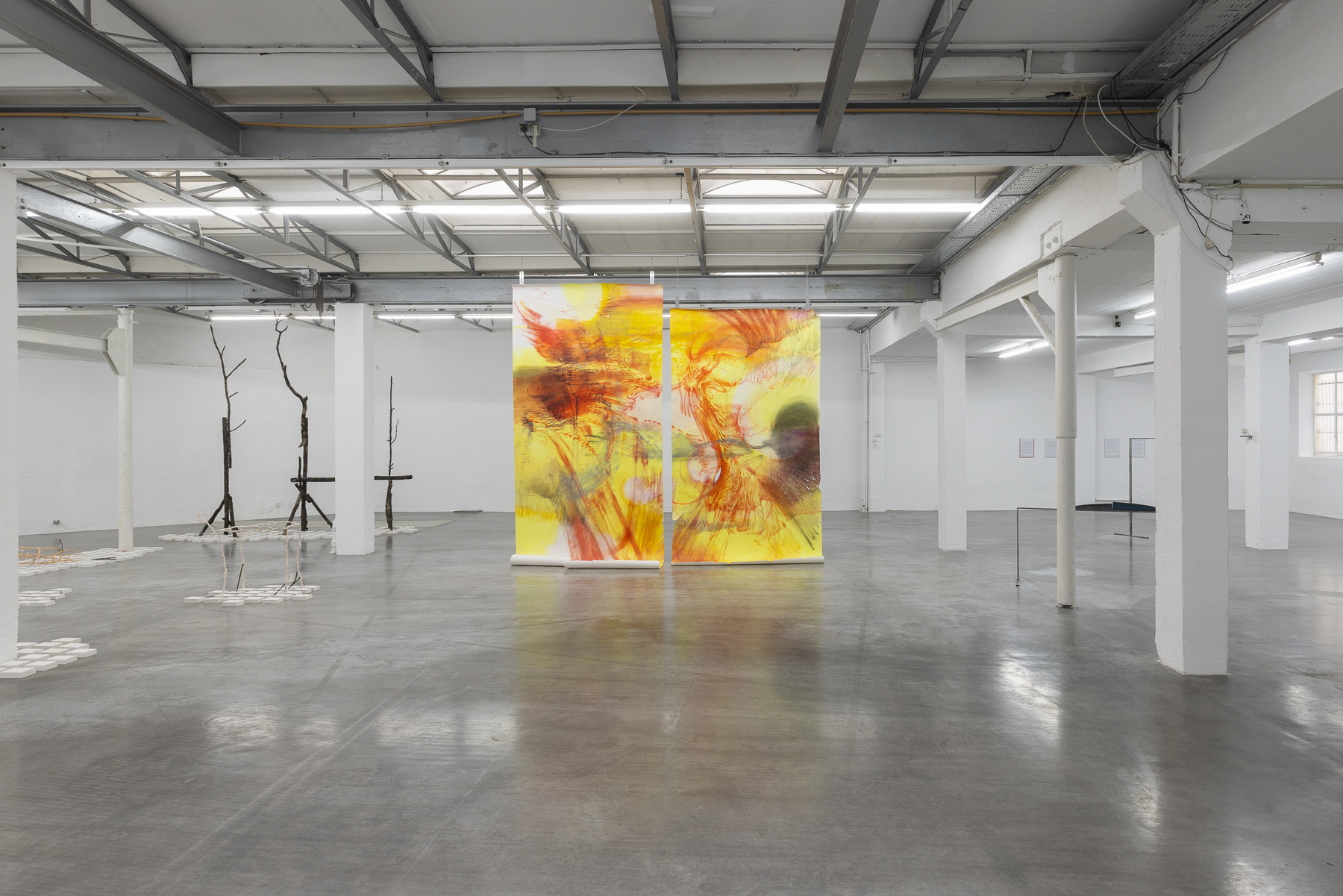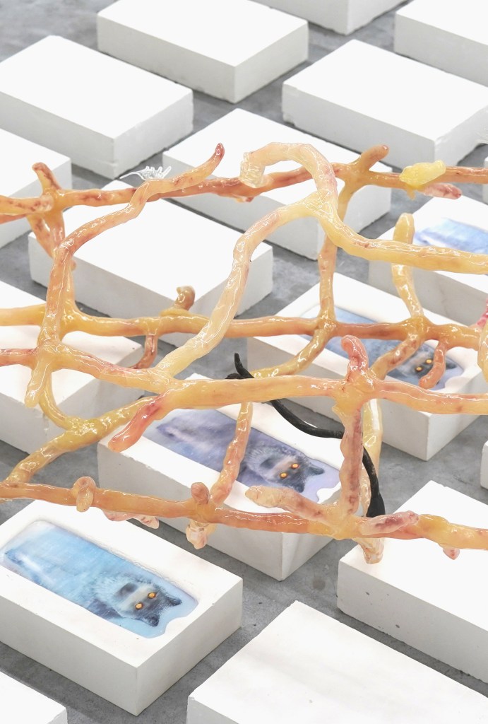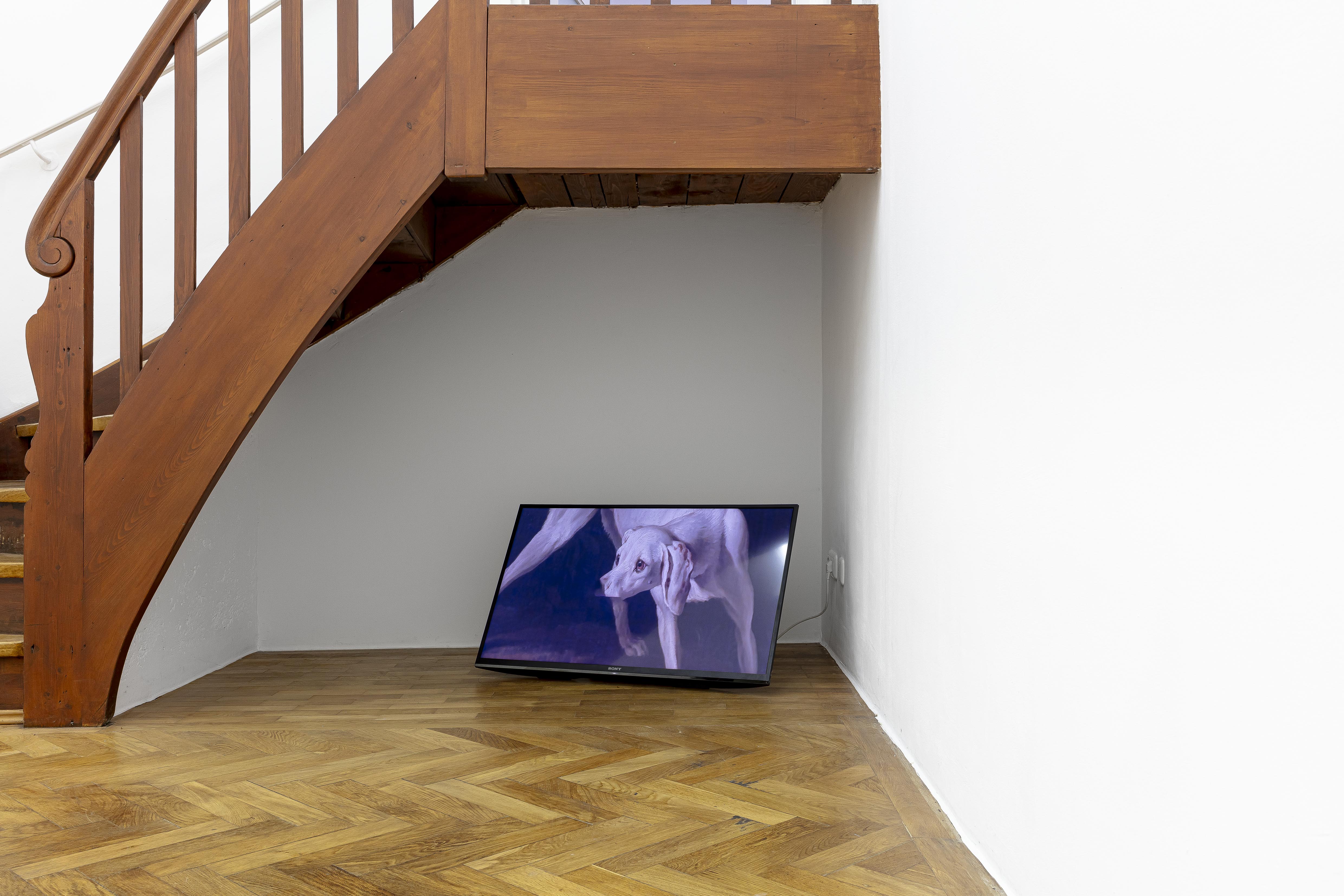 Perhaps then, we wander not quite so bewildered in this forest, as we necessarily follow our fate. But we wander on a surface without ground or depth, because free of cause. Everything in Mainka’s work takes place on the surface, like the hybrid creature scuttering around the ornate interiors of the Musée de la Chasse et de la Nature in her video. It imitates not animals, but depictions of them. The two talking dogs are not half-human but half-sculpture, their head and paws the same silicone as Mainka’s wall pieces. In Nazim Bakour’s music score, they do not bark, but whoop with the sound of the cuica drum.