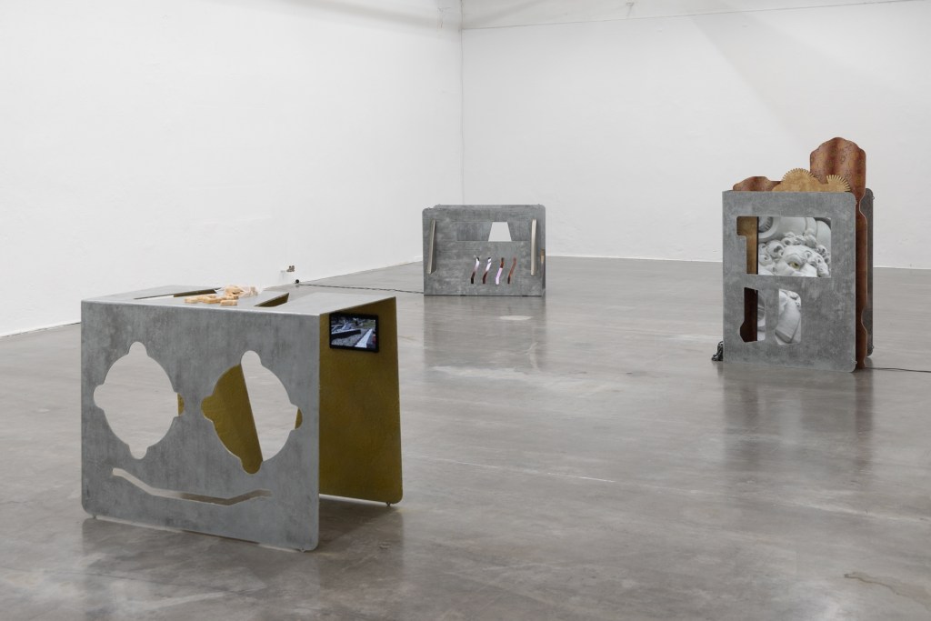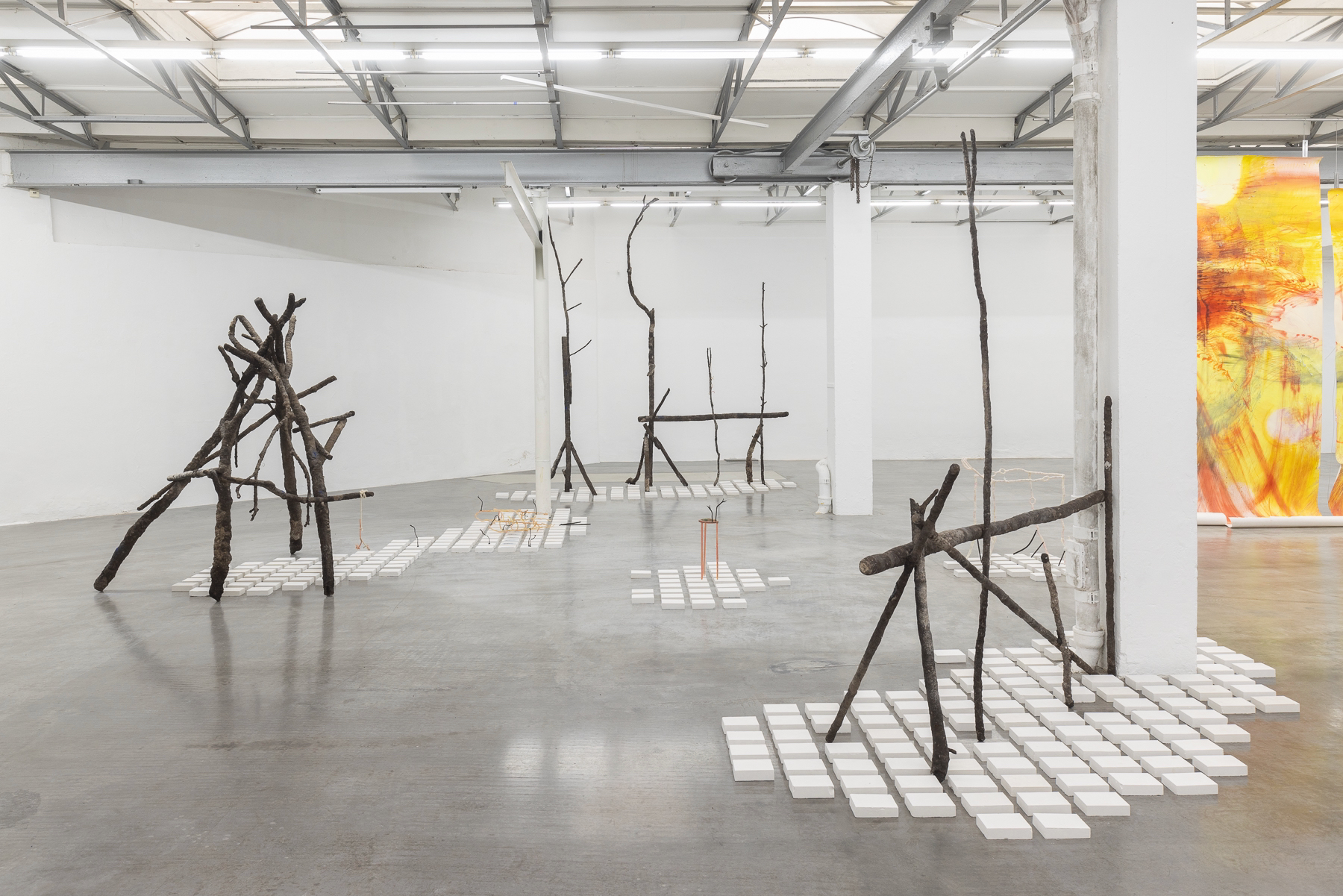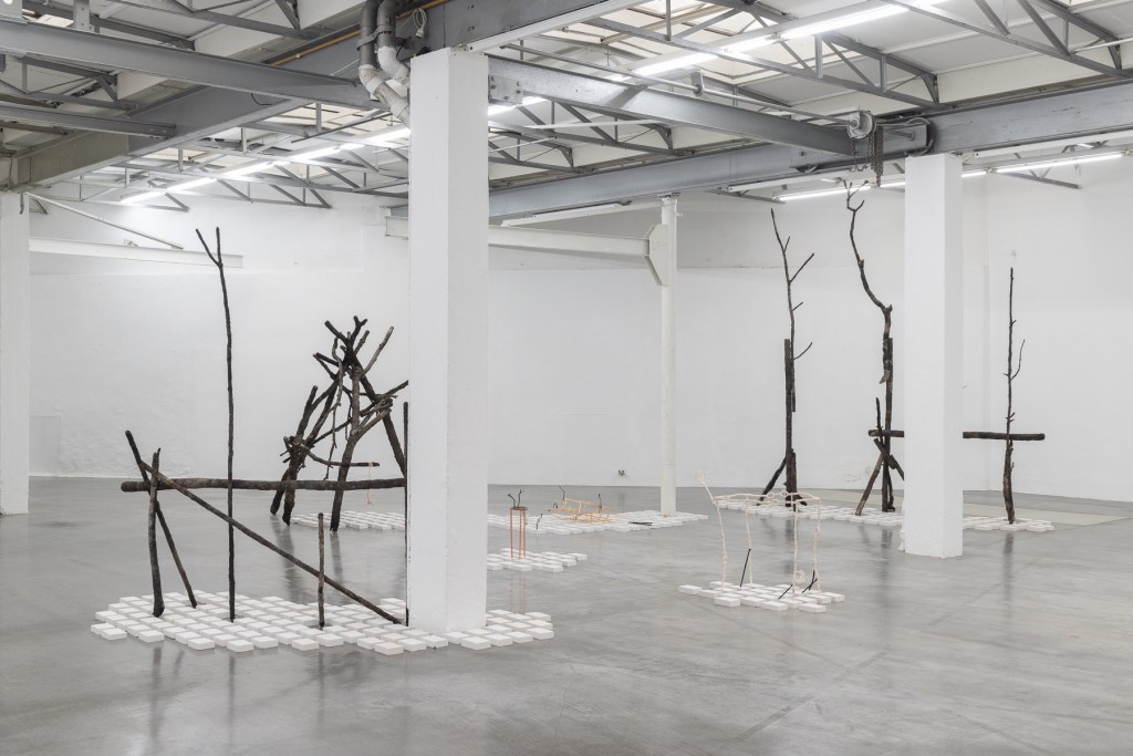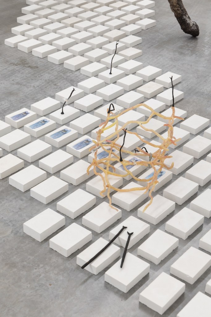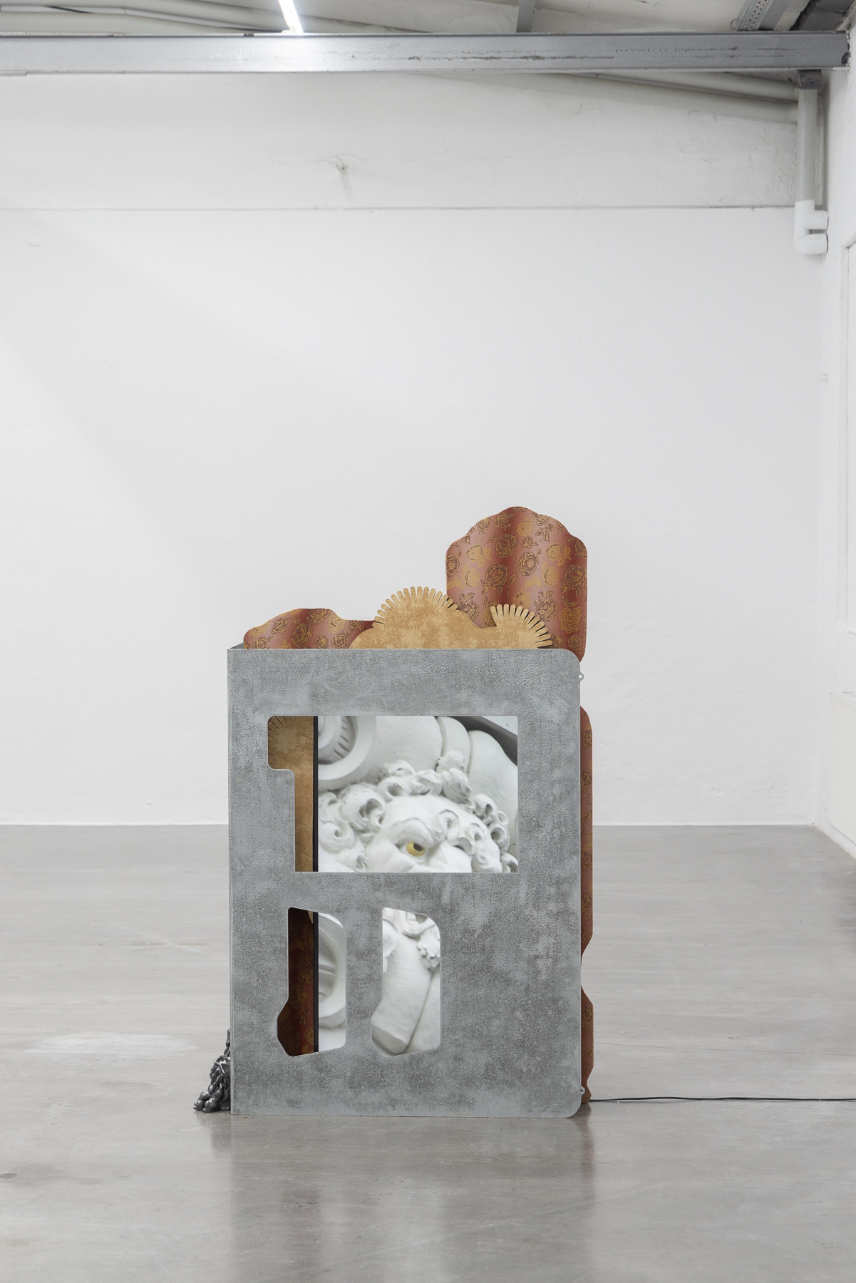 Perhaps then, we wander not quite so bewildered in this forest, as we necessarily follow our fate. But we wander on a surface without ground or depth, because free of cause. Everything in Mainka’s work takes place on the surface, like the hybrid creature scuttering around the ornate interiors of the Musée de la Chasse et de la Nature in her video. It imitates not animals, but depictions of them. The two talking dogs are not half-human but half-sculpture, their head and paws the same silicone as Mainka’s wall pieces. In Nazim Bakour’s music score, they do not bark, but whoop with the sound of the cuica drum.