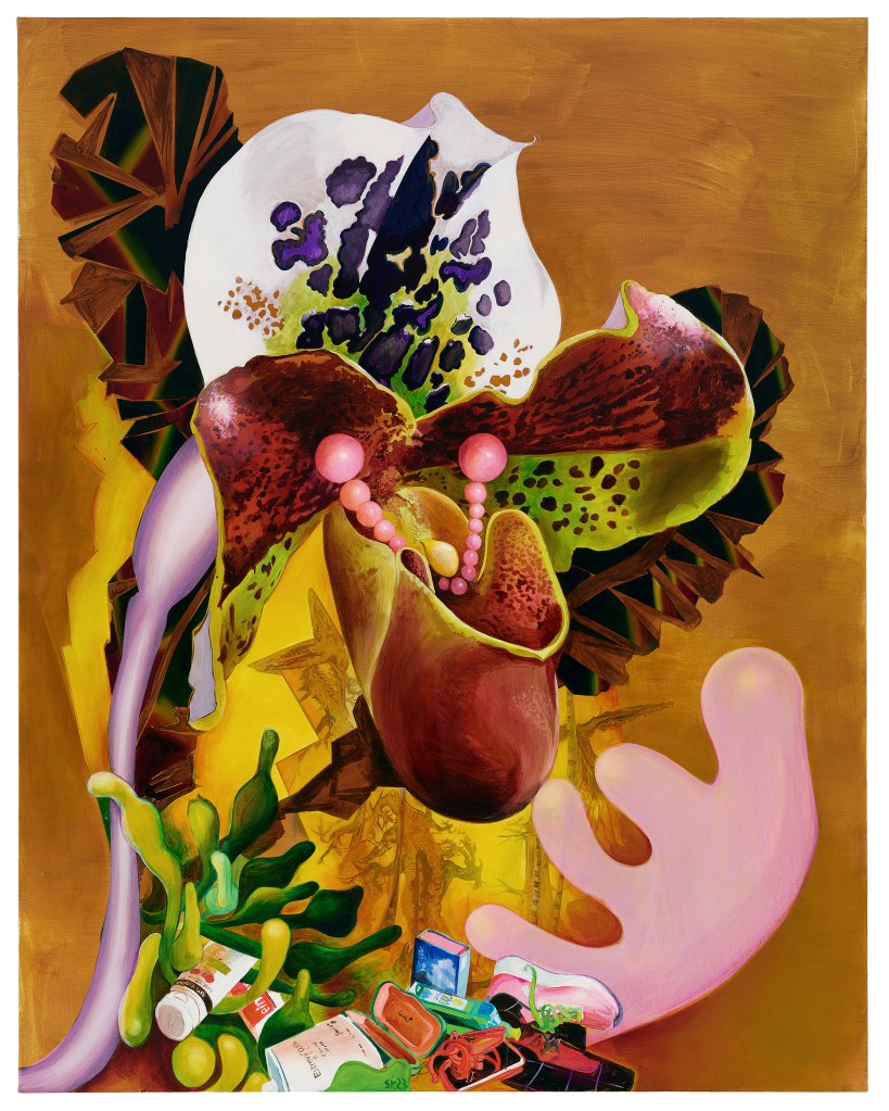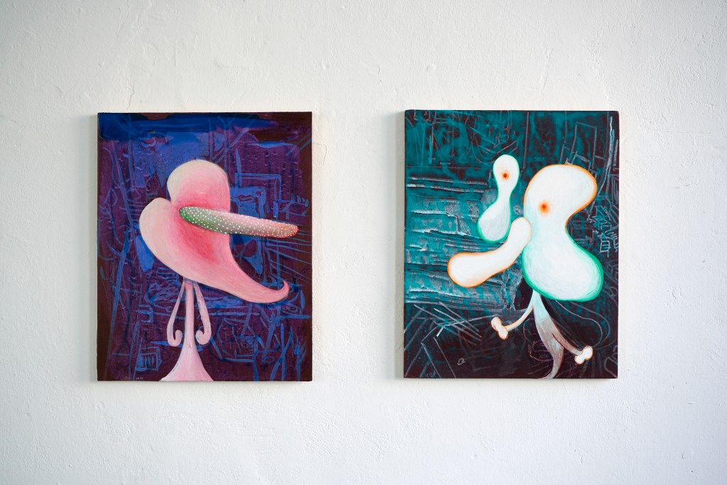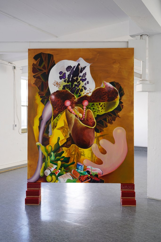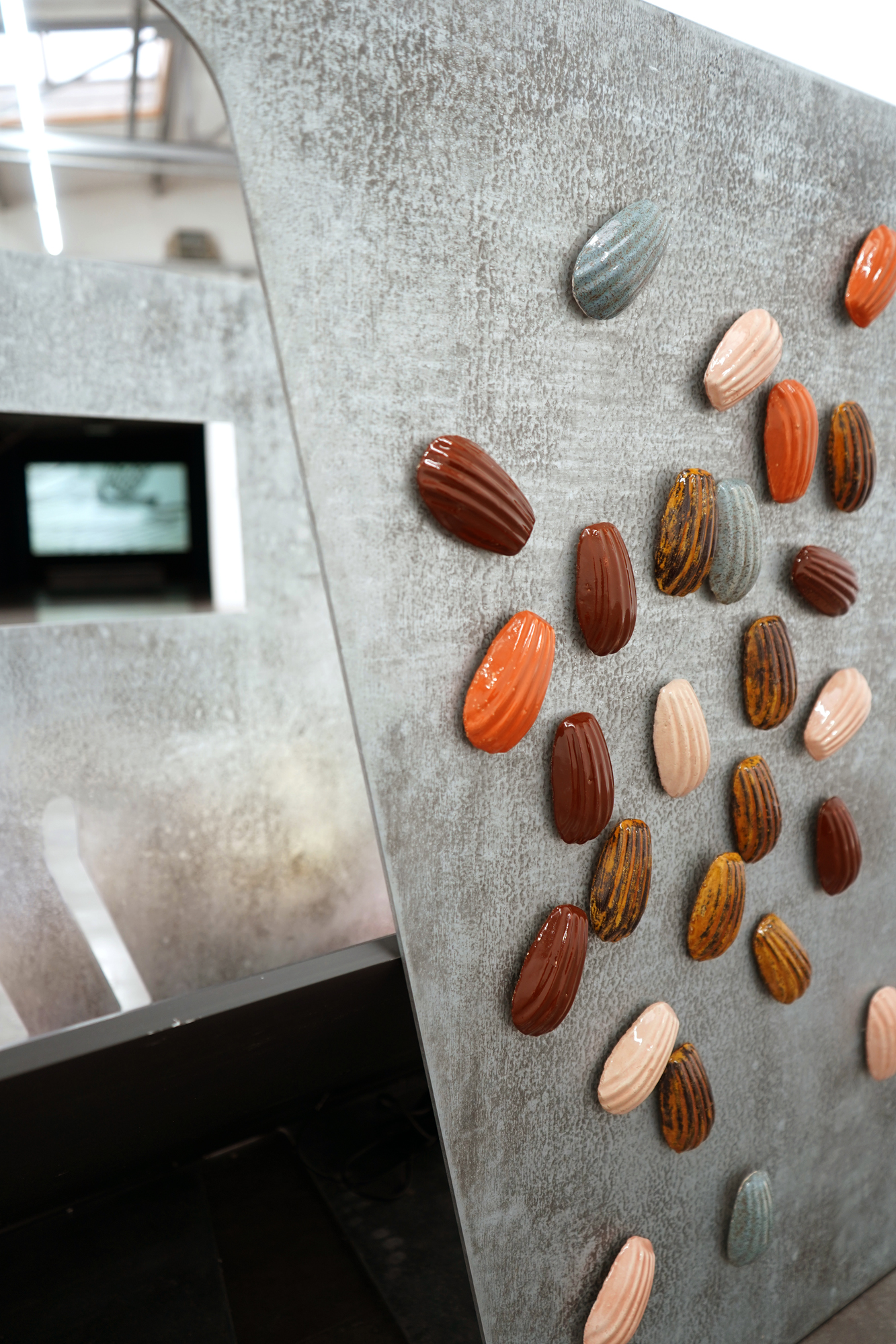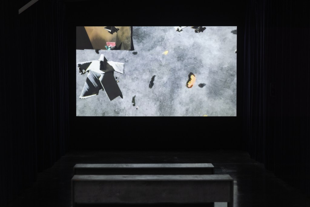 Perhaps then, we wander not quite so bewildered in this forest, as we necessarily follow our fate. But we wander on a surface without ground or depth, because free of cause. Everything in Mainka’s work takes place on the surface, like the hybrid creature scuttering around the ornate interiors of the Musée de la Chasse et de la Nature in her video. It imitates not animals, but depictions of them. The two talking dogs are not half-human but half-sculpture, their head and paws the same silicone as Mainka’s wall pieces. In Nazim Bakour’s music score, they do not bark, but whoop with the sound of the cuica drum.