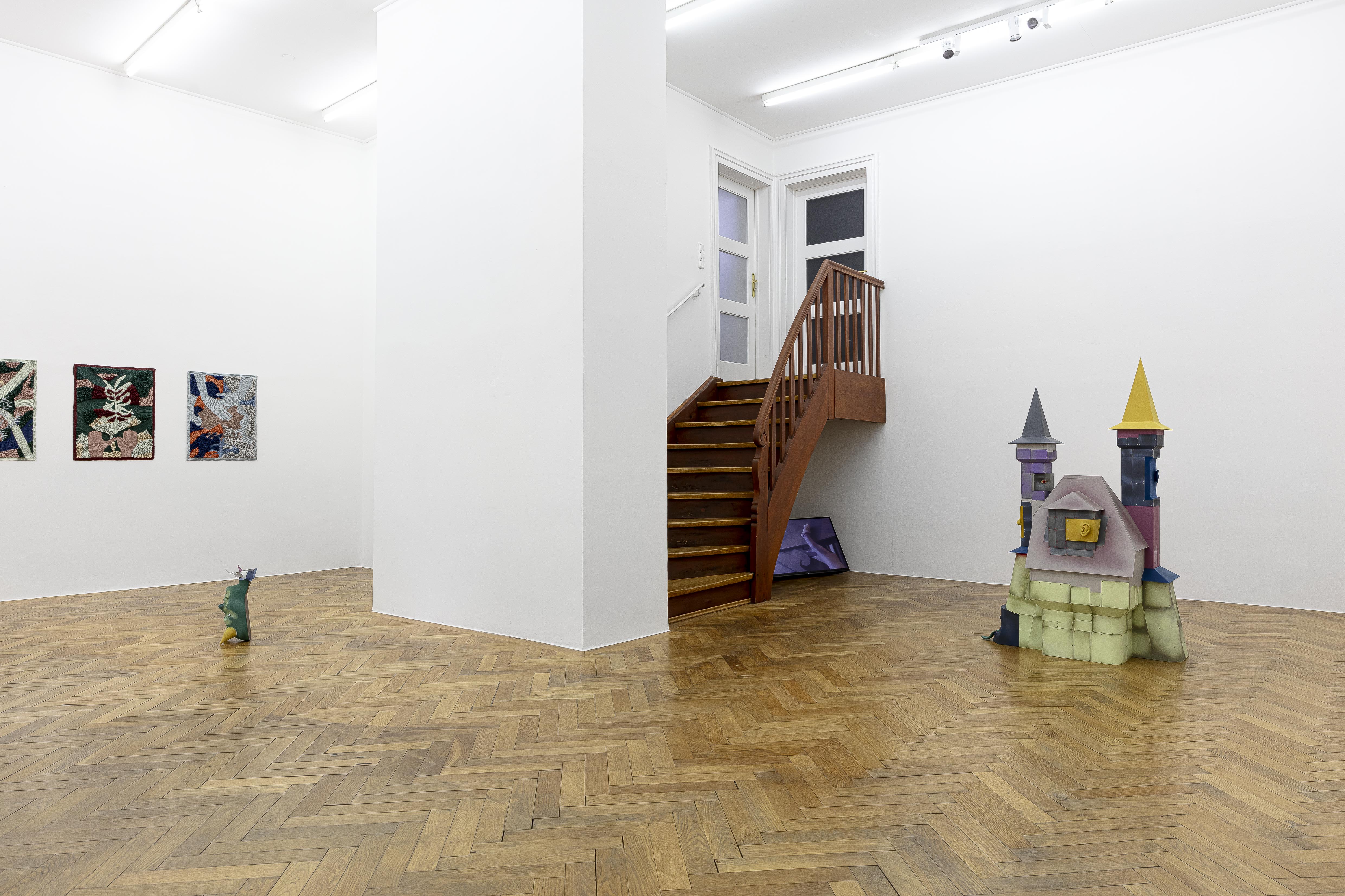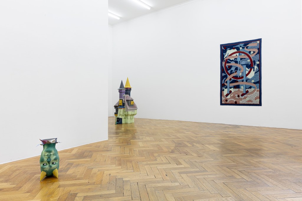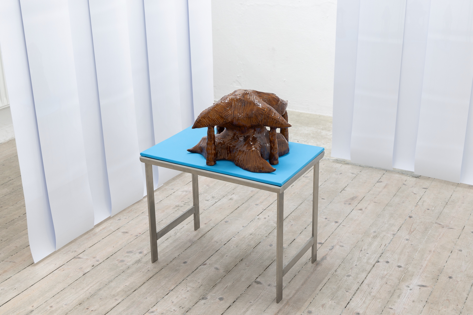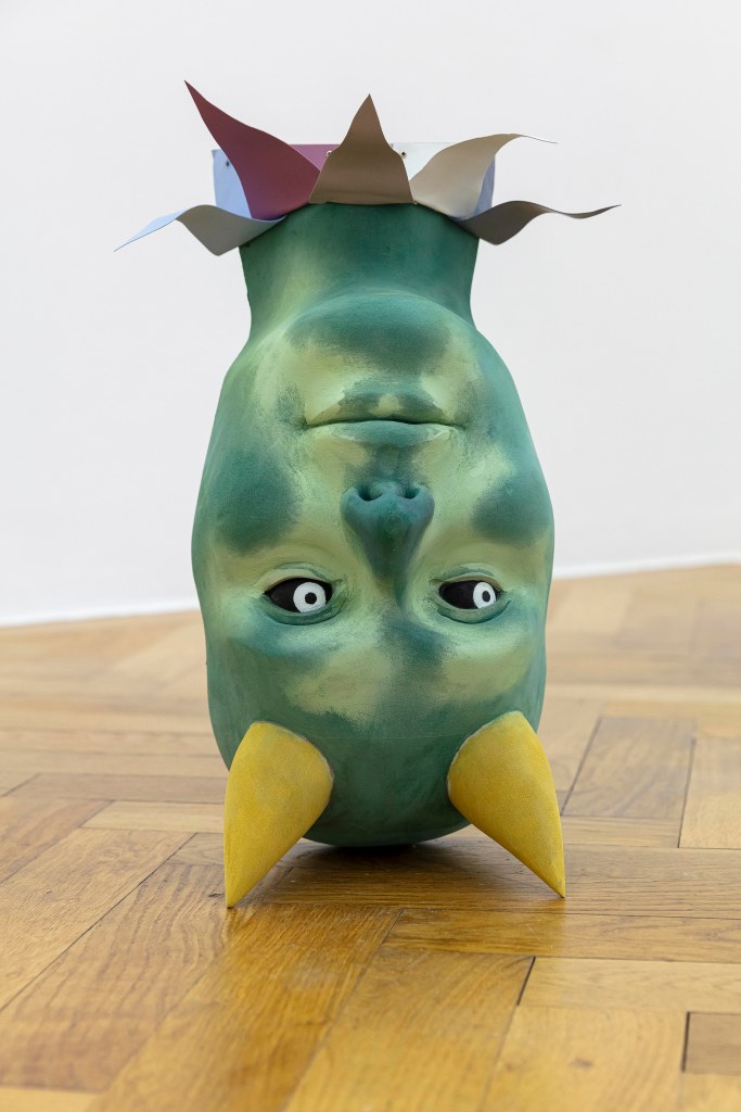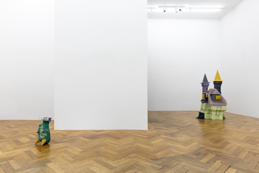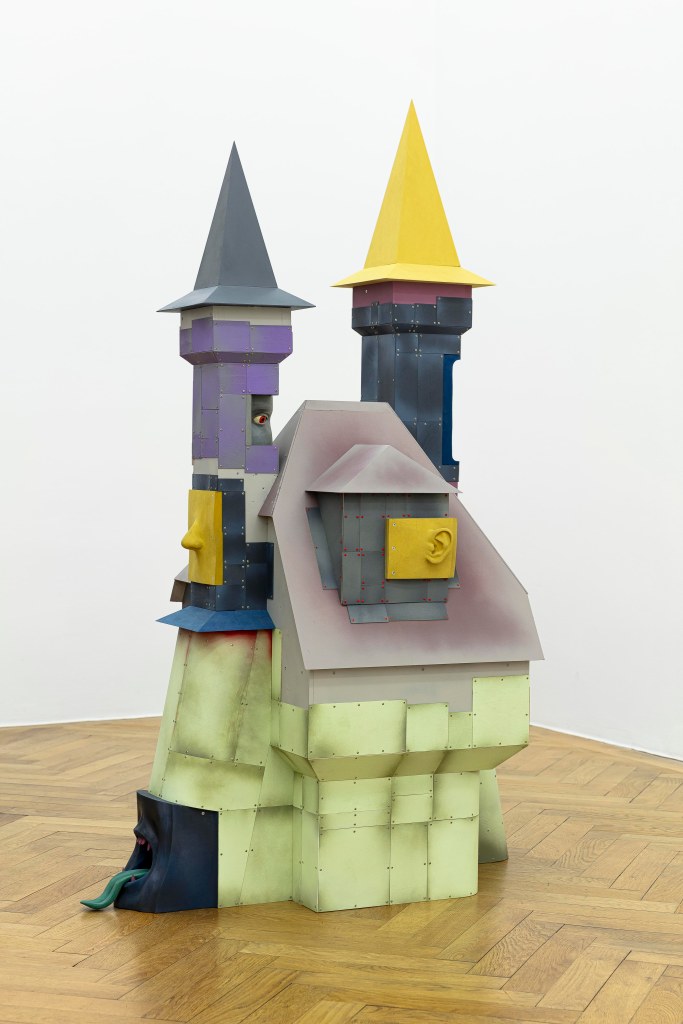 Lukas Hoffmann too stages a fictional world that has something of Lewis Carroll’s unsettling absurdity about it. There is a wooden castle with ears, eyes, a wide open mouth and a nose, and it is both too big and too small. Drink me, eat this, nibble both sides of the mushroom circle. As Alice grows bigger, her initial self also becomes smaller, pulled in both directions at once. With components jutting out and sliding in, the body both outside and inside, the castle too grows small as it becomes big. “Becoming without measure, a veritable becoming-mad.”[6] Observing this madness is the upside down head of Pan, the mischievous god of the wild. A mascaron fallen from its pediment. Run away in panic, it urges us – run away in chaos, it smiles.