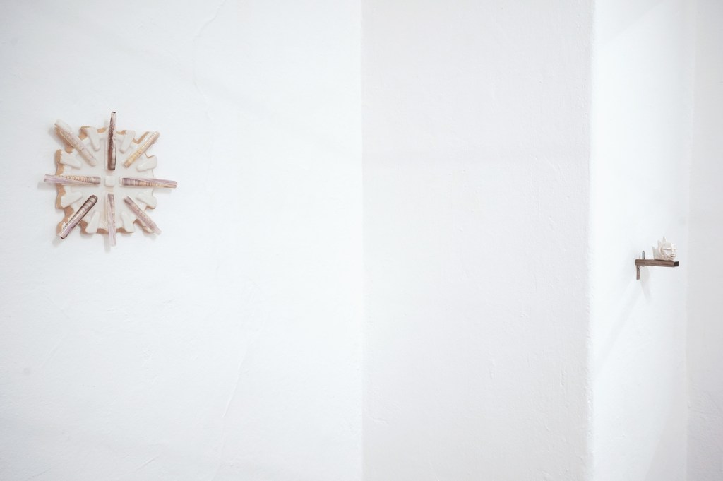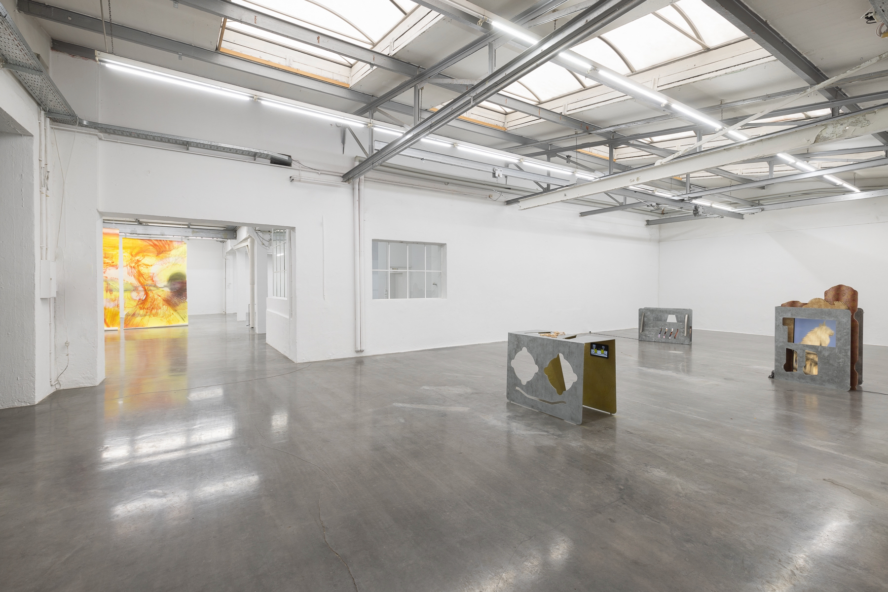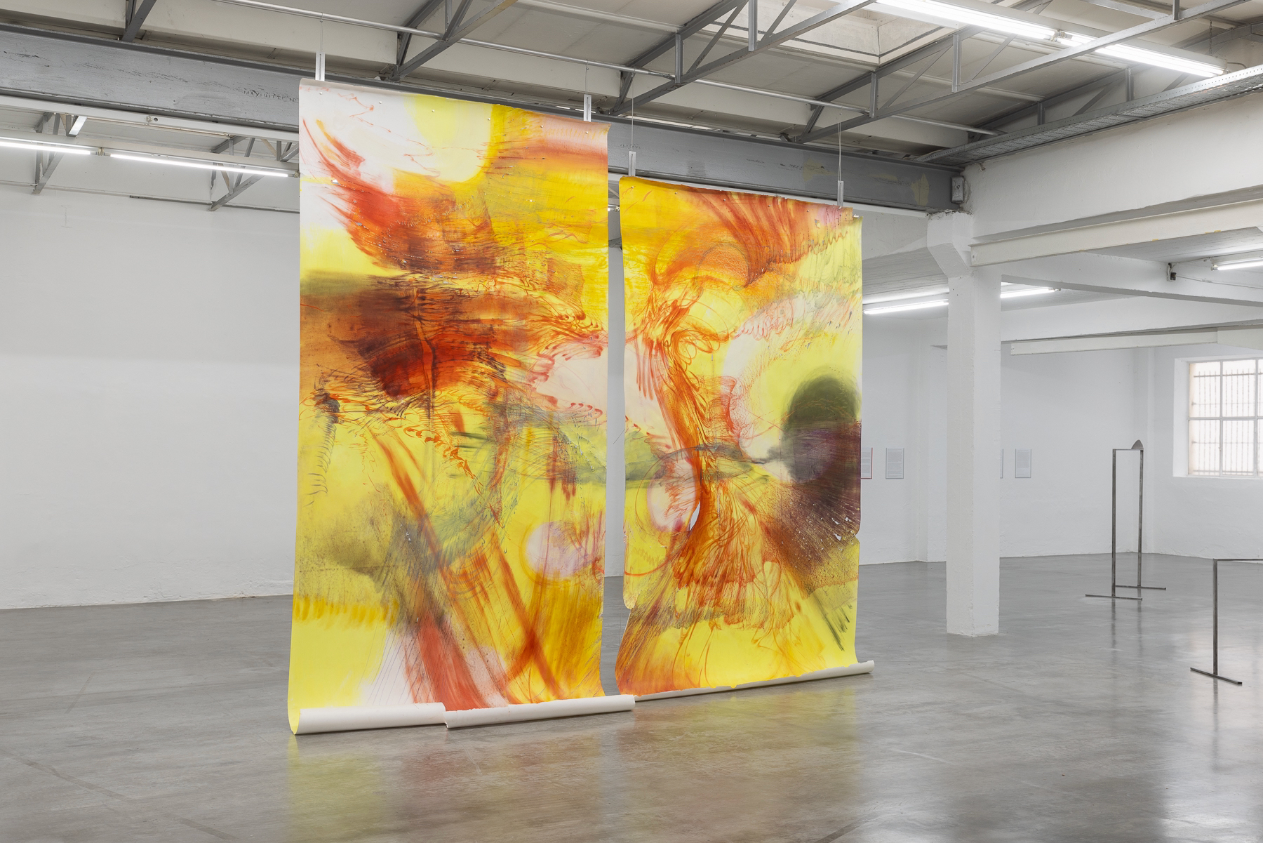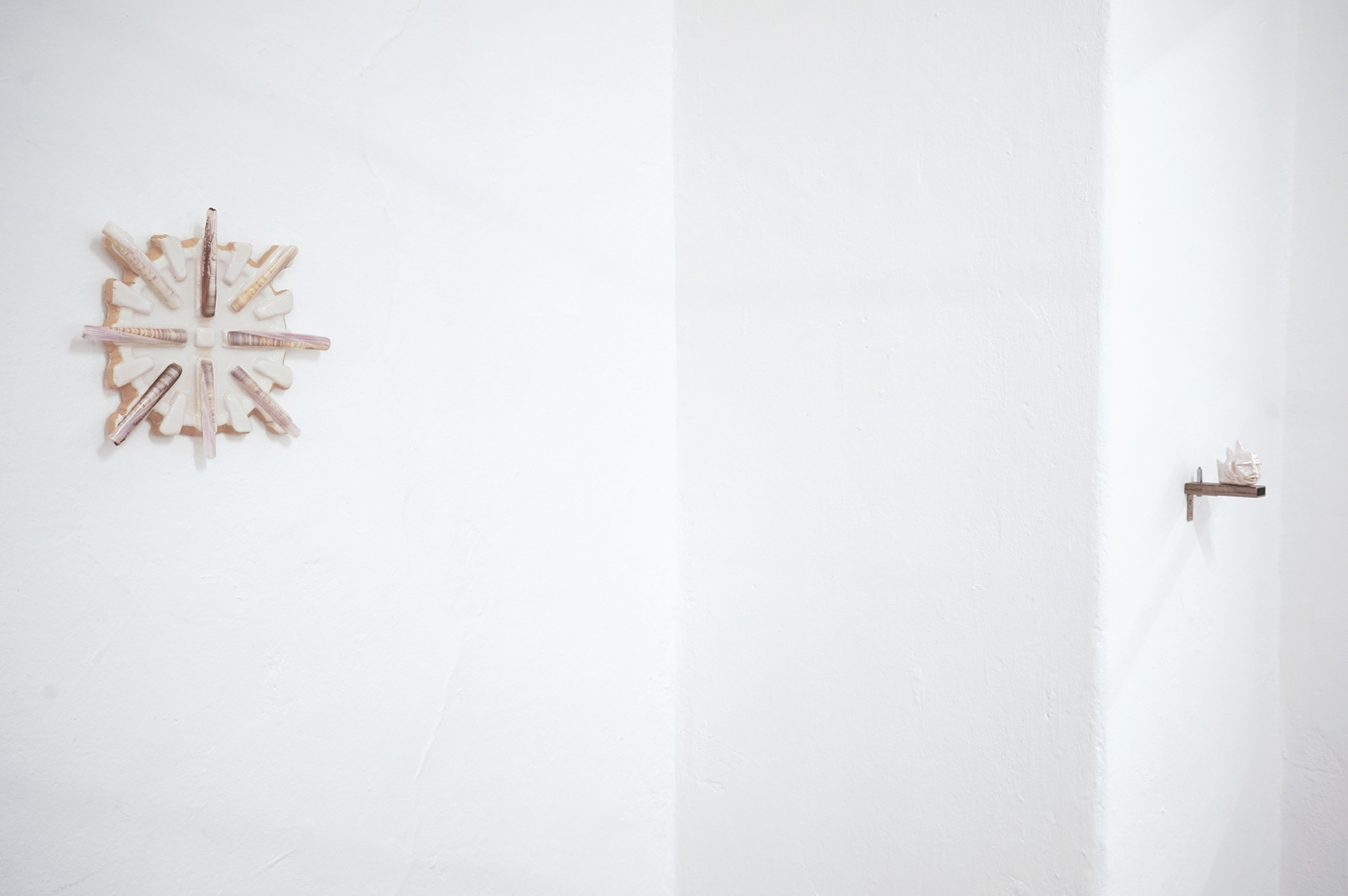 In the exhibition, Sophia Mainka shows a series of wall mounted works made from silicone paste. Heavy and solid, yet curiously slippery, they are based on a Tarot deck of cards. It is peculiarly appropriate that the largest is the wheel of fortune, usually interpreted as standing for change or becoming. Fortune can be good or bad depending on the game, the question asked of the cards, open to interpretation. In Tarot, one card can mean many things and then change meaning at different times. In contrast, destiny is the thread woven through the image and cut by the three mythological sisters. The turn of the card is always fateful. Whatever the outcome of the roll of dice, this outcome is necessarily so: sky back to earth, slide and snip.