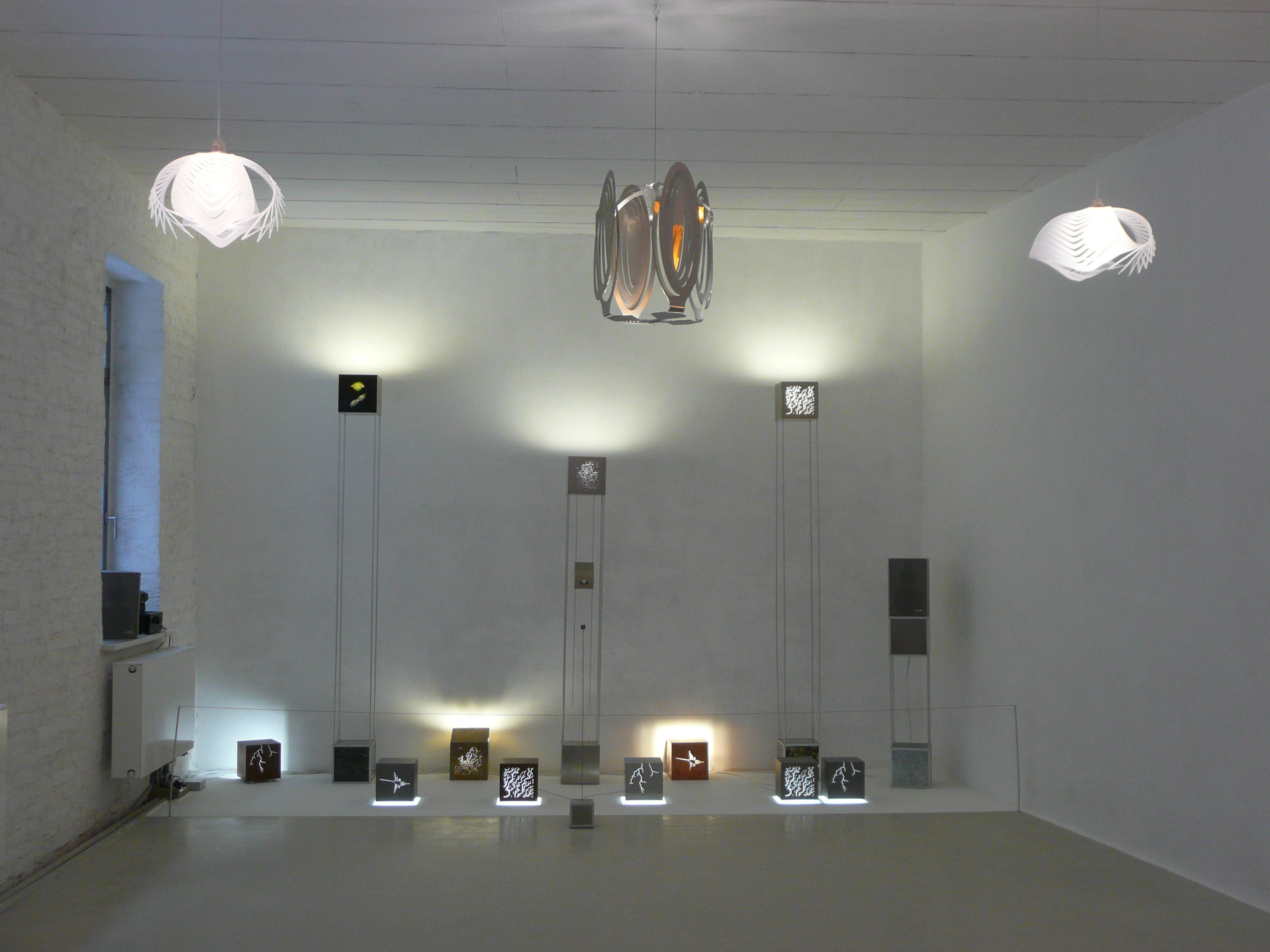 The DELO 4.2 and the transparent 3-Star in front of the cube lights. The Reading light is switched on. This image demonstrates how the different use of metal changes the quality of the energy saving lightbulbs, with the brass and copper cubes lending the light a particularly warm glow.