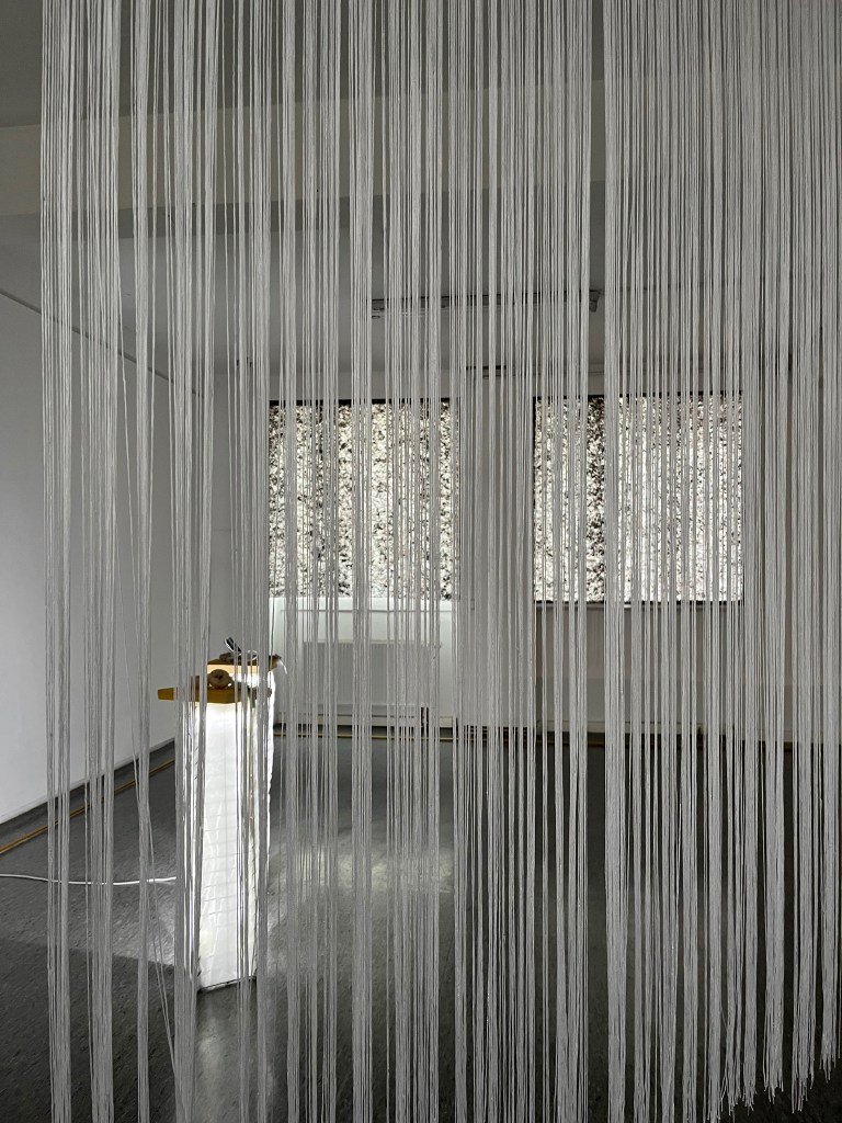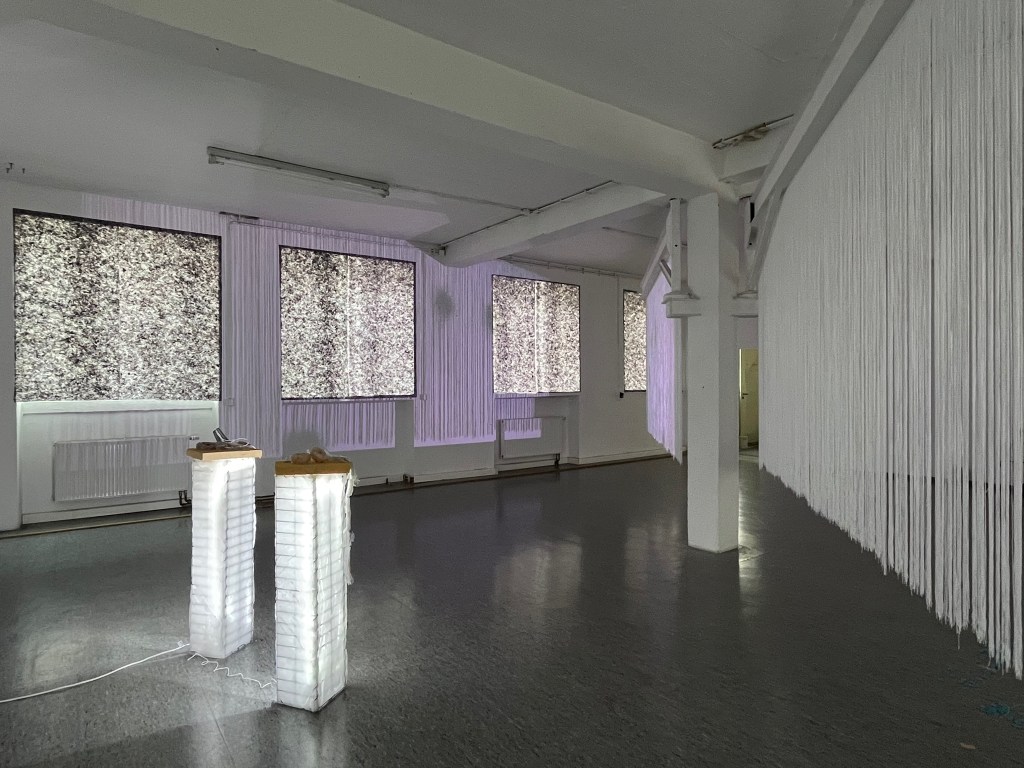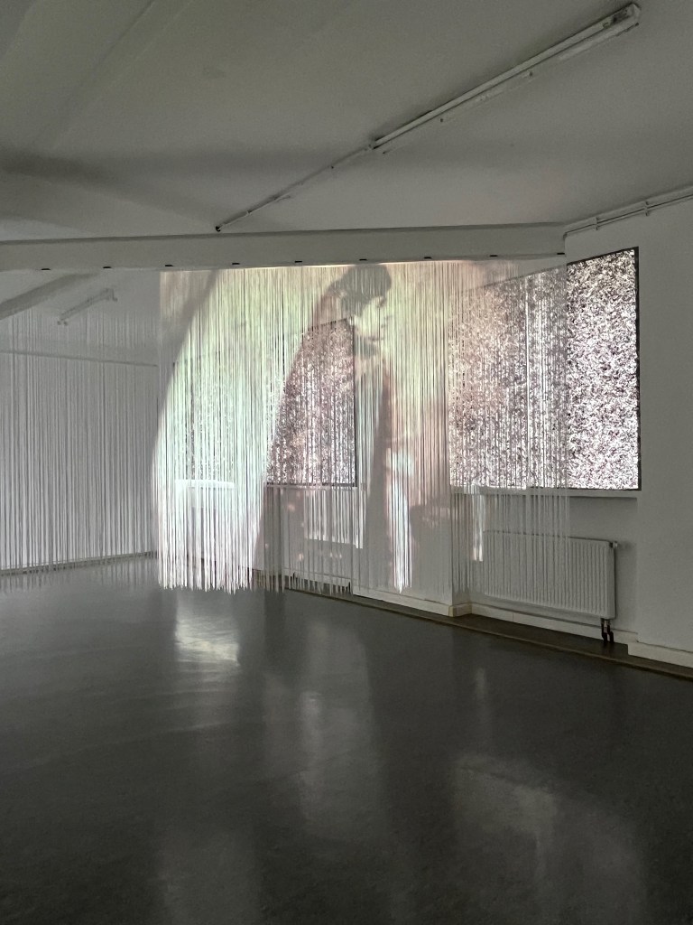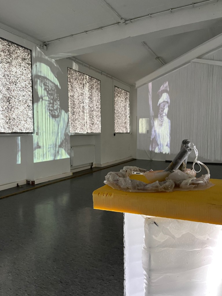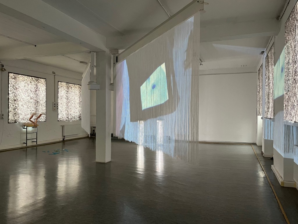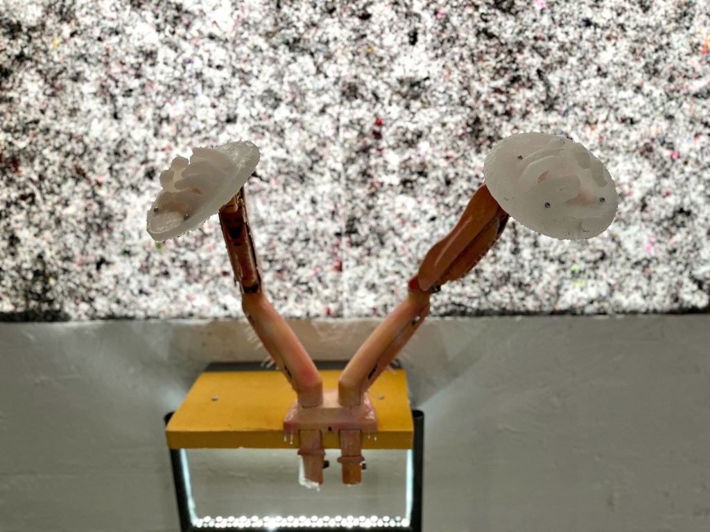 These stories of animals adapting to urban environments lay at the heart of Sophia Mainka’s video and sculpture installation, “Notes on Roommates (a dog, a parrot, a whale and a canal)” produced and first shown during her residency at Fondation Fiminco in Paris. Amid the organic playful forms of the metal sculptures there are three videos, all filmed from the animal perspective. In the first two, Mainka paints her arms and hands to resemble a dog’s paws, and we see these on screen as the fictional dog walks, stops and occasionally runs around the cobblestones and concrete pavements, once even jumping from a wooden bench. In the third, she takes on the perspective of the whale, the camera capturing what the whale would have seen, providing it swam further, into the city canals. The image rises and dips to the rhythm of the whale’s breathing. Surrounding us are the sounds of birds singing, except this too is staged: these are not parrots, but a toy, a bird whistle device.