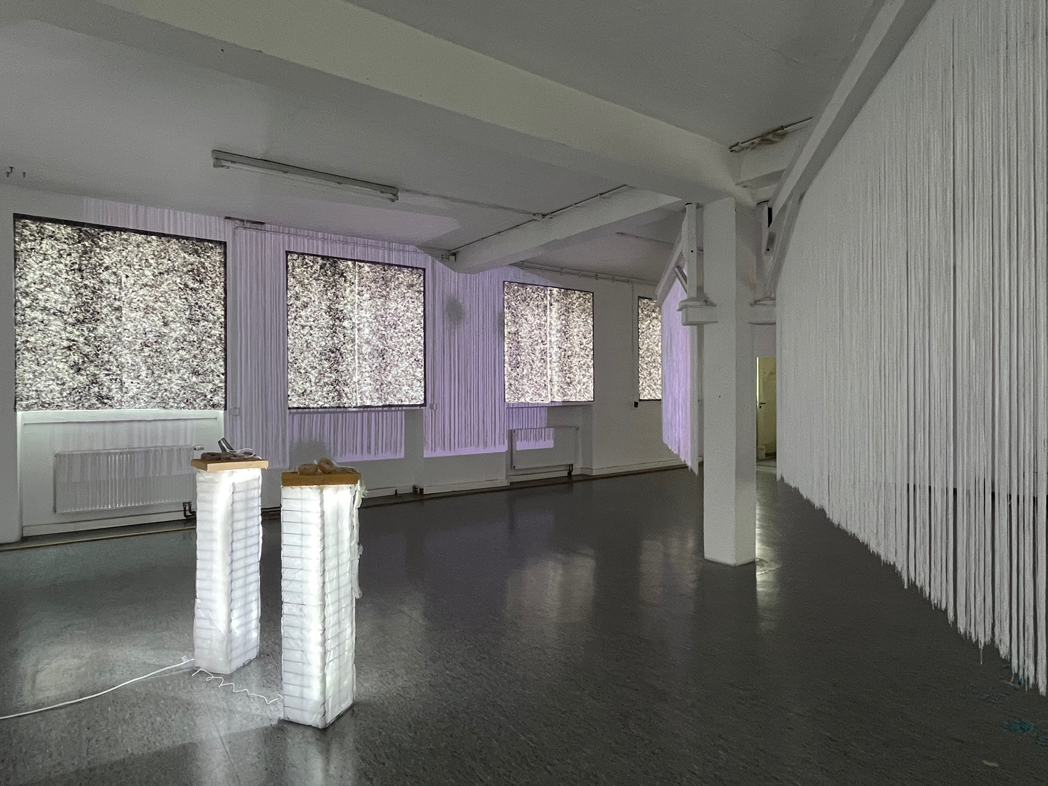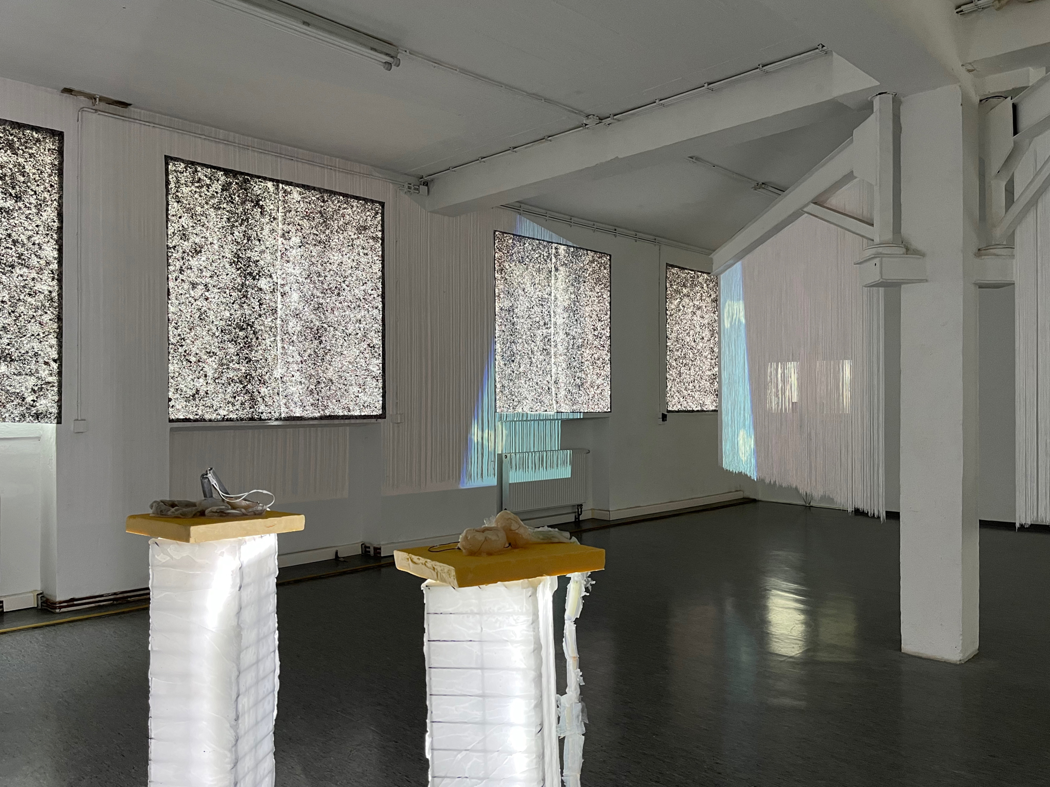 Diese Erzählungen von Tieren, welche sich an urbane Lebensräume anpassen, stehen im Zentrum von Sophia Mainkas Installation “Notes on Roommates (a dog, a parrot, a whale and a canal)“ aus Videos und Skulpturen, die während ihres Residenzaufenthalts in der Fondation Fiminco in Paris produziert und dort auch zum ersten Mal gezeigt wurde. In die organischen und spielerischen Formen der Metallskulpturen sind drei Videos integriert, alle aufgenommen aus der Tierperspektive. Im ersten und zweiten Video sind Mainkas Arme und Hände wie Hundepfoten bemalt. Wir nehmen den Blickwinkel jenes fiktiven Hundes ein, laufen mit ihm über Kopfsteinpflaster und Bürgersteige, halten plötzlich an, rennen hin und her und springen einmal sogar von einer Holzbank. Im dritten Video nimmt Mainka die Perspektive des Wals ein, wobei die Kamera das wiedergibt, was jener wohl gesehen hätte, wenn er weiter in die Stadt hinein geschwommen wäre. Das Bild bewegt sich im Rhythmus der Atmung des Wals. Um uns herum erklingt Vogelgezwitscher, aber auch das ist eine Inszenierung: Es sind keine Papageien, sondern ein Spielzeug, eine Vogelpfeife.