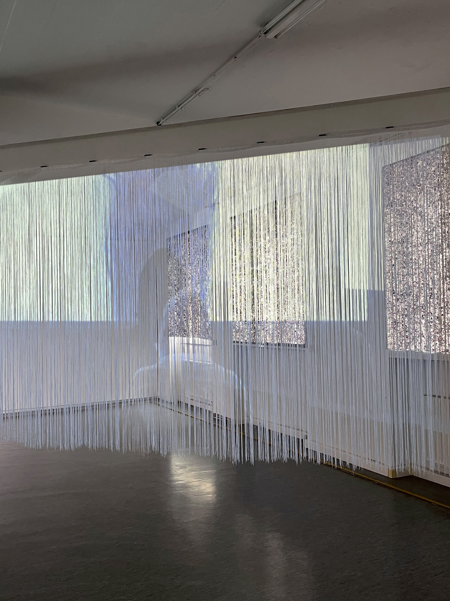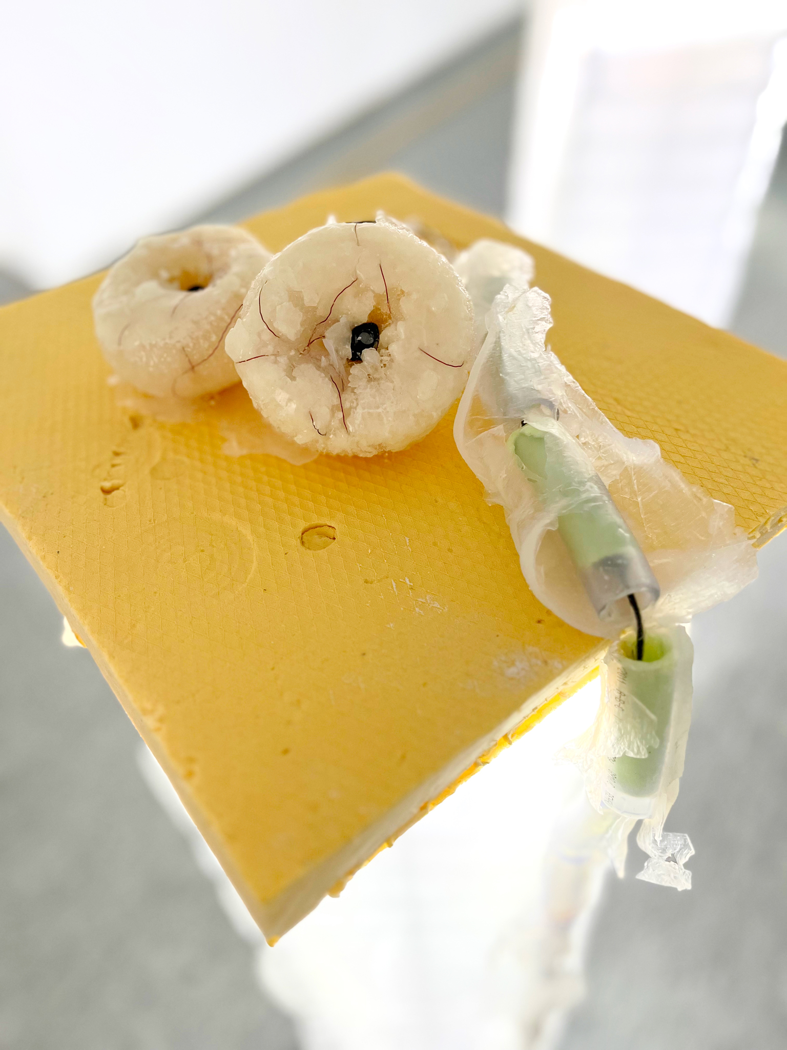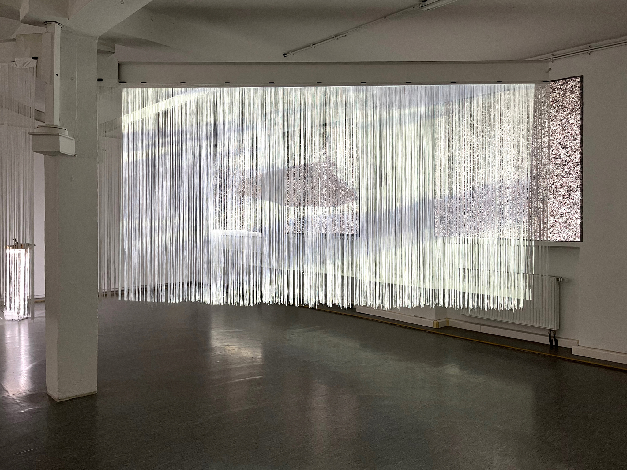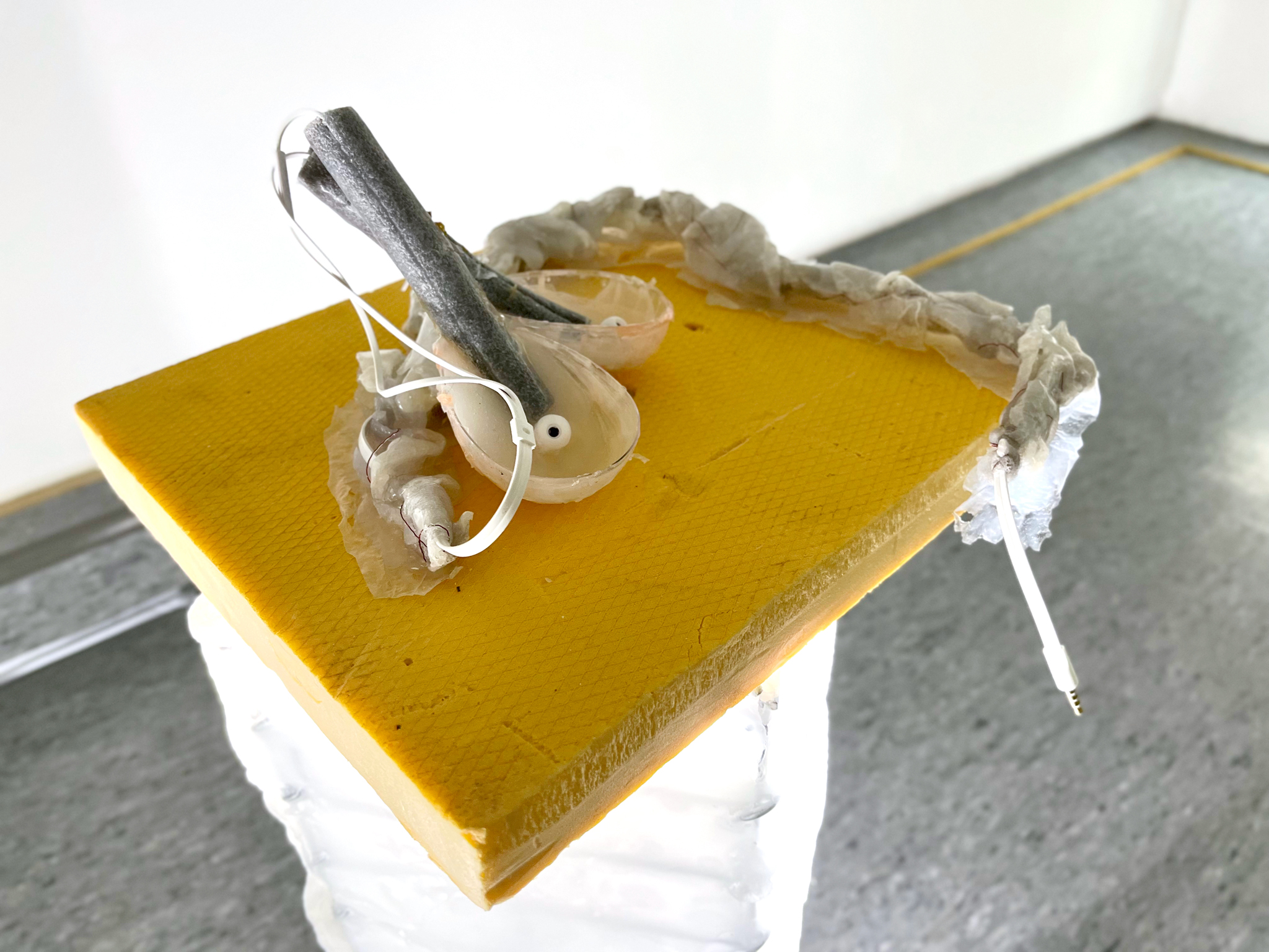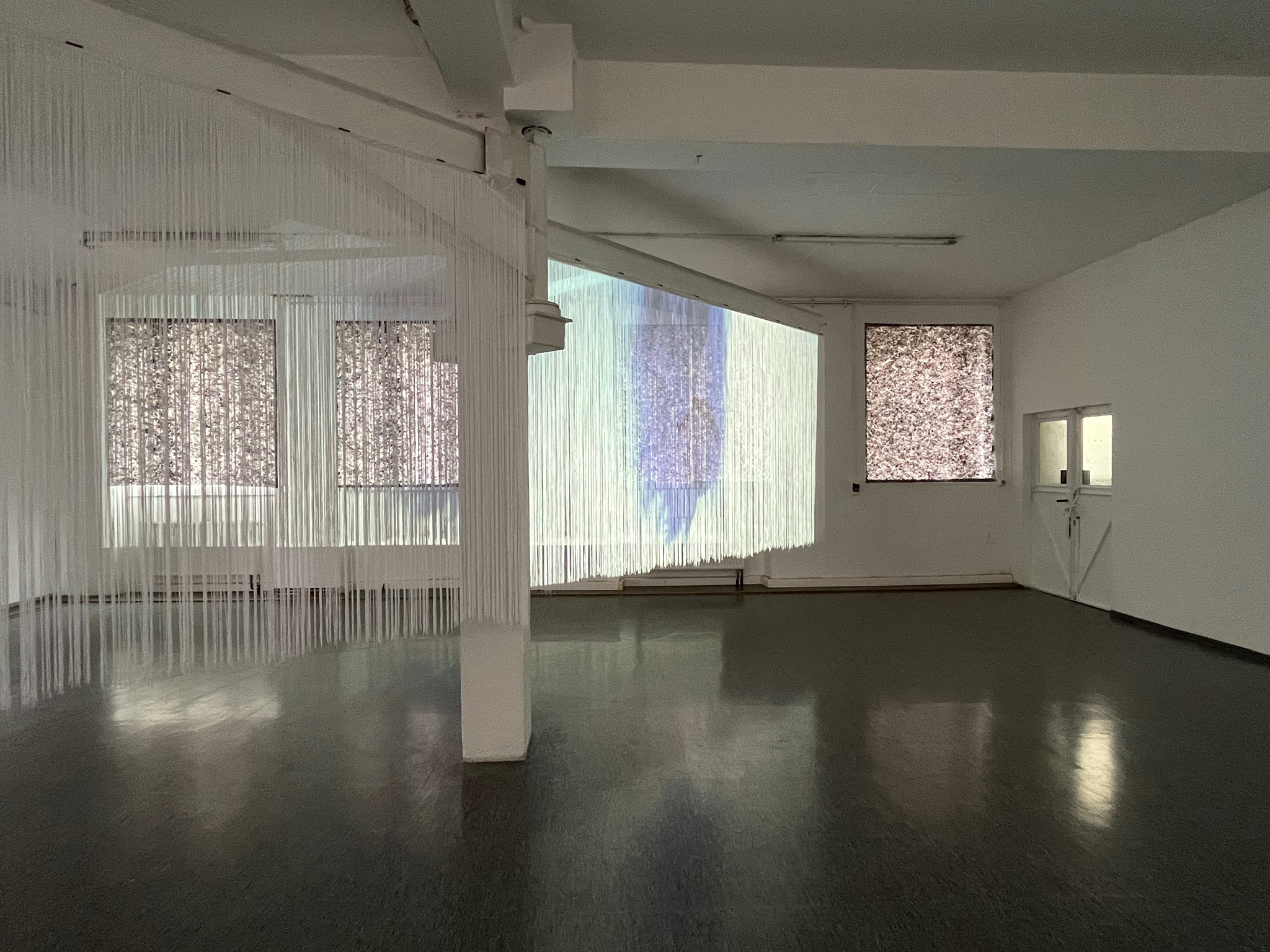 These stories of animals adapting to urban environments lay at the heart of Sophia Mainka’s video and sculpture installation, “Notes on Roommates (a dog, a parrot, a whale and a canal)” produced and first shown during her residency at Fondation Fiminco in Paris. Amid the organic playful forms of the metal sculptures there are three videos, all filmed from the animal perspective. In the first two, Mainka paints her arms and hands to resemble a dog’s paws, and we see these on screen as the fictional dog walks, stops and occasionally runs around the cobblestones and concrete pavements, once even jumping from a wooden bench. In the third, she takes on the perspective of the whale, the camera capturing what the whale would have seen, providing it swam further, into the city canals. The image rises and dips to the rhythm of the whale’s breathing. Surrounding us are the sounds of birds singing, except this too is staged: these are not parrots, but a toy, a bird whistle device.
