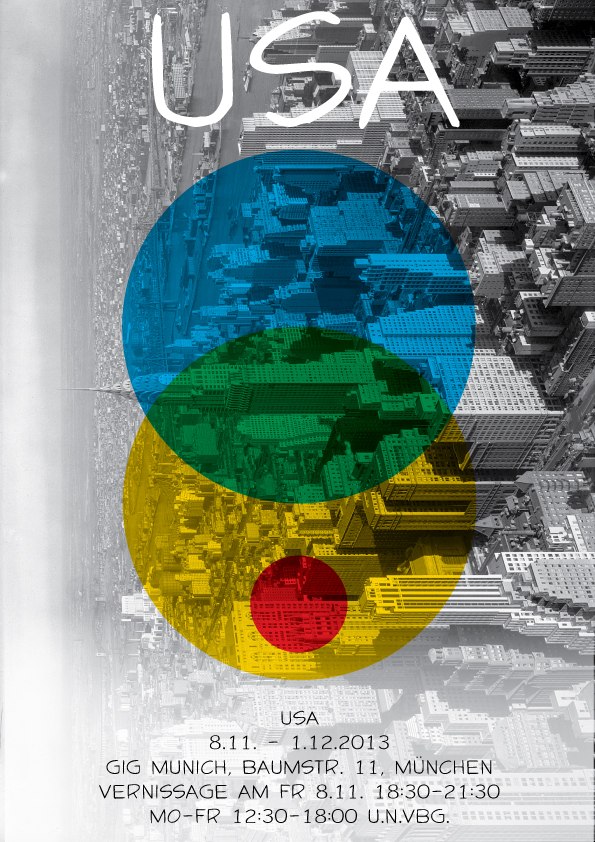 Alasdair Duncan, who co-organised USA, makes signs that are stand-ins, emblems for things that are yet to be. He’s long been interested in America as an abstract ideal, a kind of promise of something vaguely but certainly better, which is not firmly coupled to the reality of the place of America. His poster functions as an advertisment for the show by standing in for an idea, a placeholder of what the show might be. It superimposes a colour saturated sign – the exact meaning of which is held at bay – over an old photograph of New York – a fetishistic image – turned on its side. AD 2013
